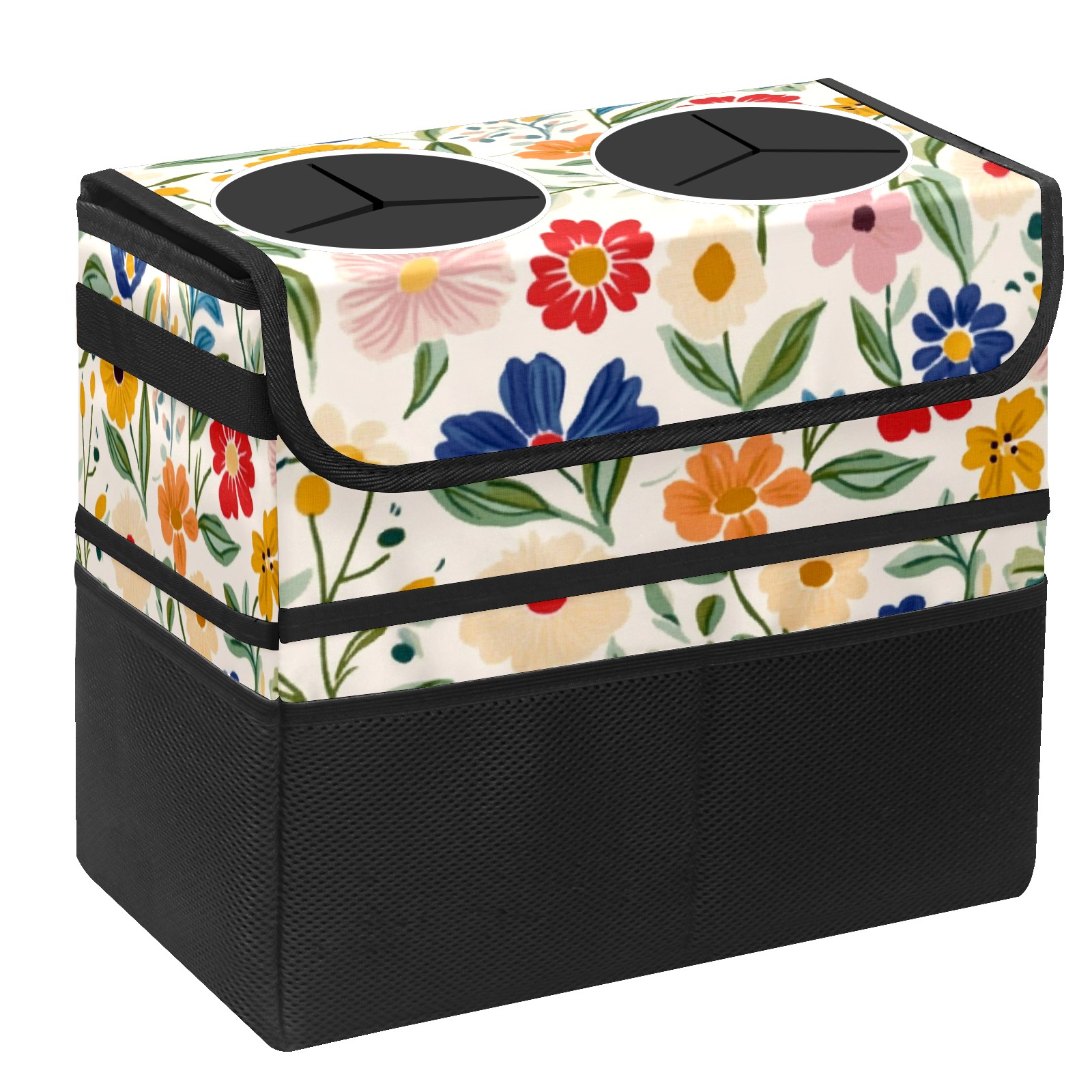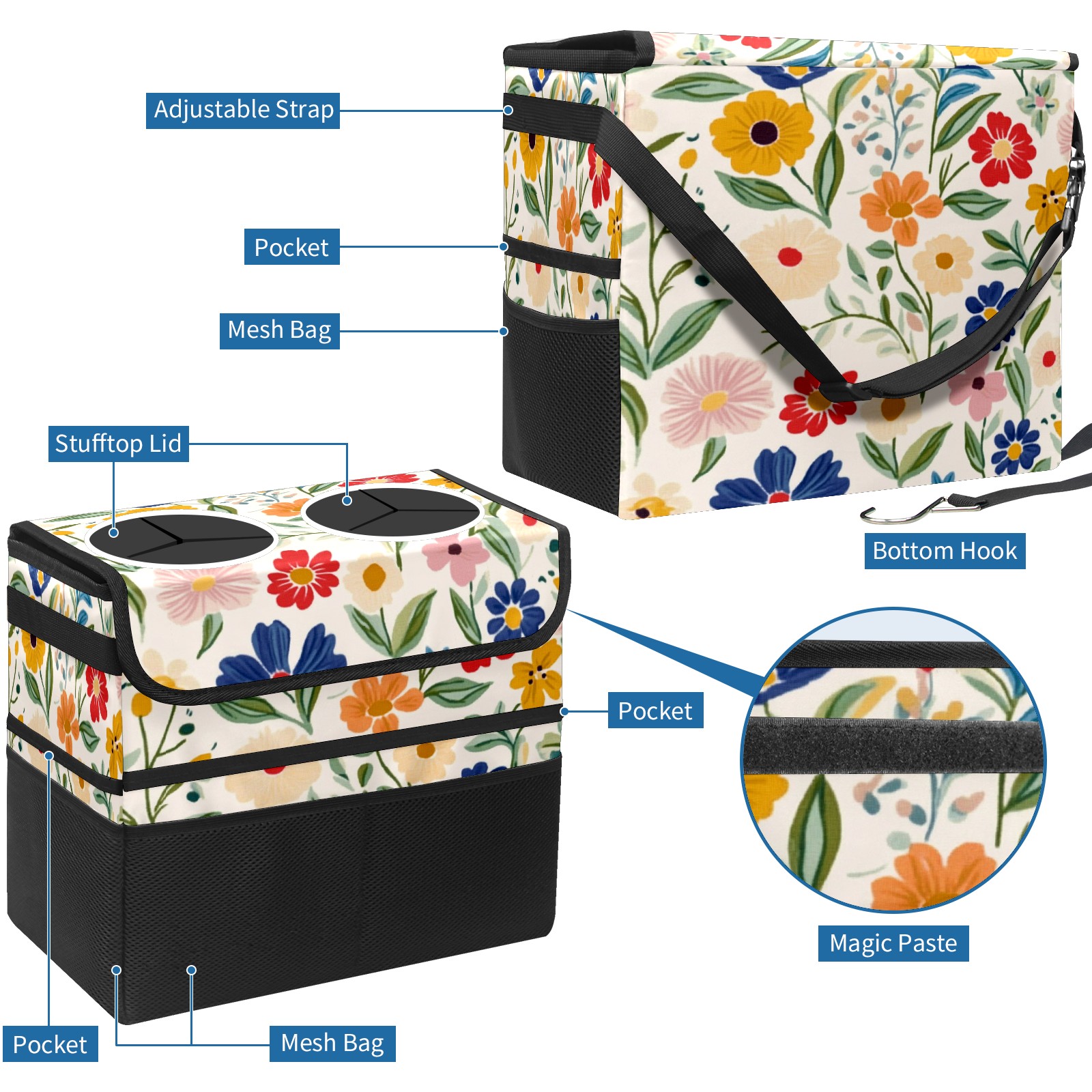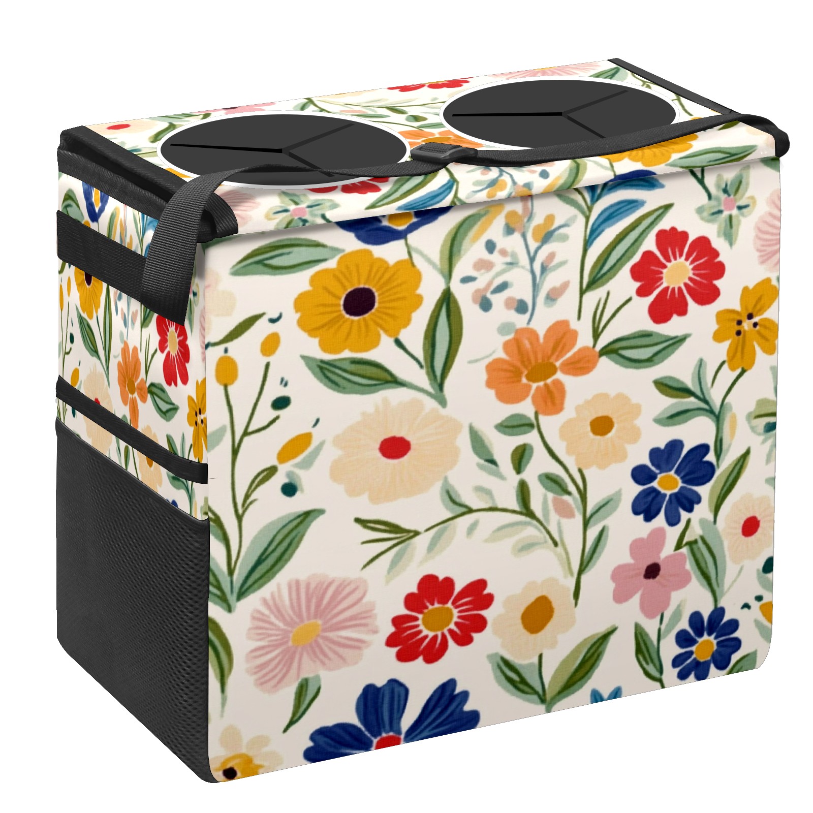 Car Trash Can with Lid, Portable Hanging Automotive Garbage Bin for Vehicles, Leakproof Waste Bag Container for SUV Truck Van Interior Auto Travel Road Trips(Simple Colorful Spring Flowers)