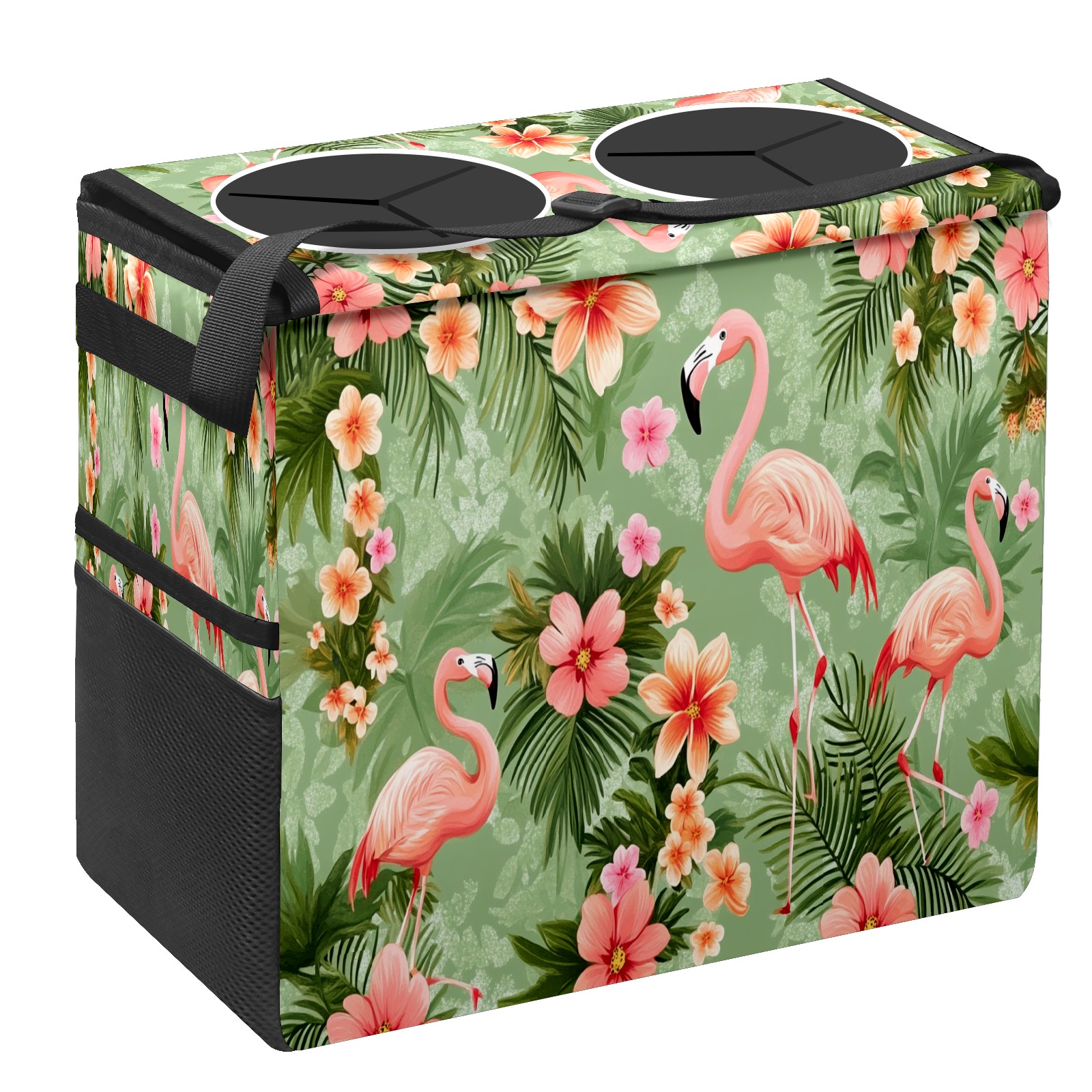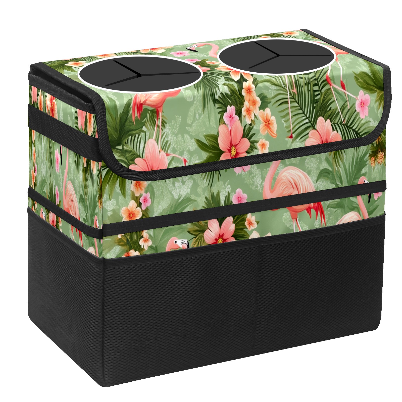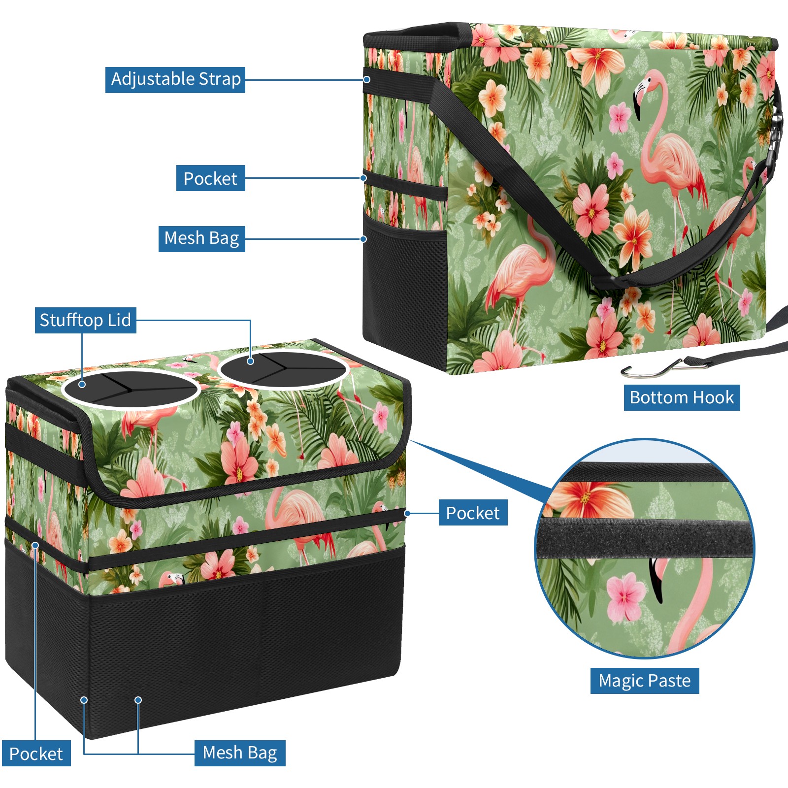 Car Trash Can with Lid, Portable Hanging Automotive Garbage Bin for Vehicles, Leakproof Waste Bag Container for SUV Truck Van Interior Auto Travel Road Trips(Dark Green Leaves Flamingo)