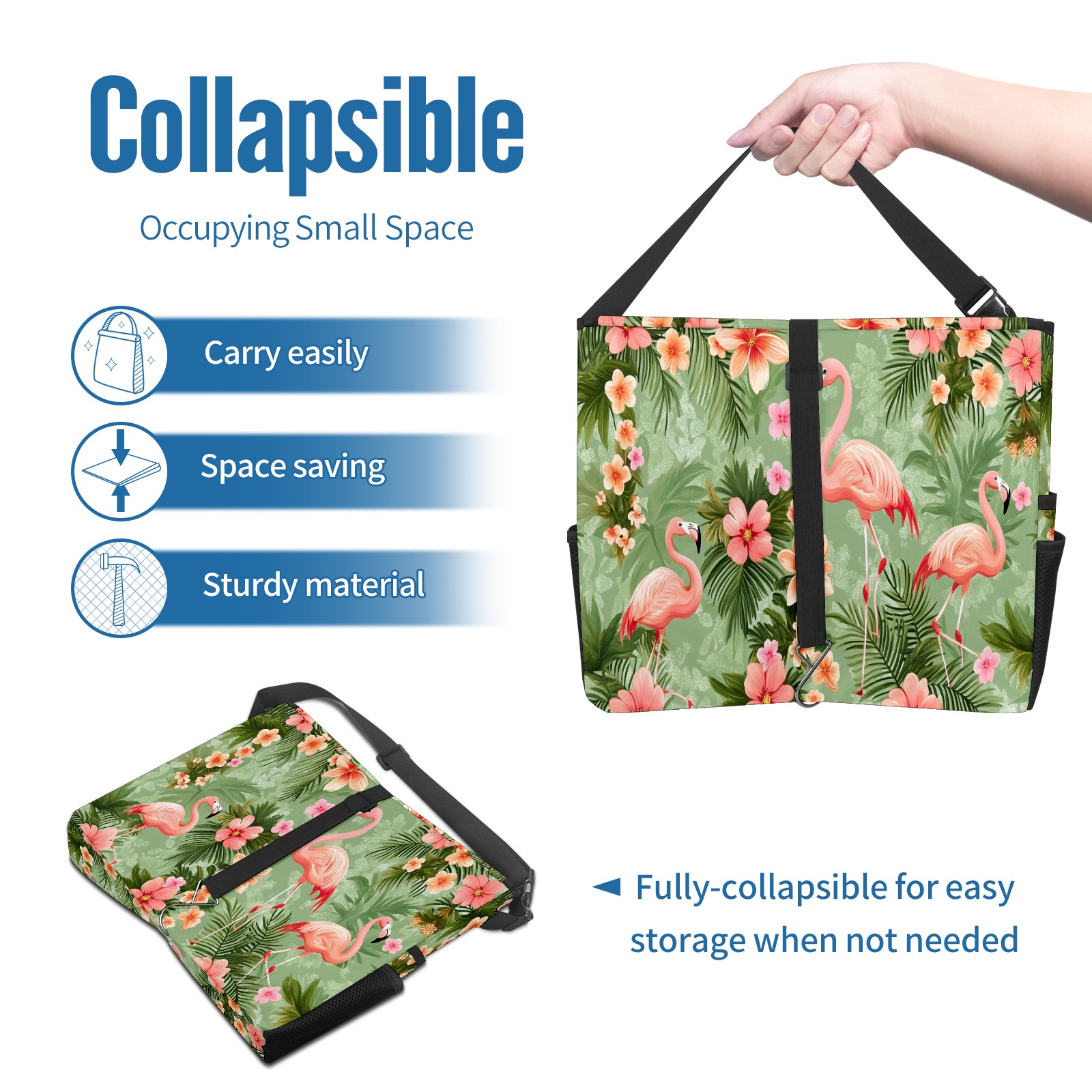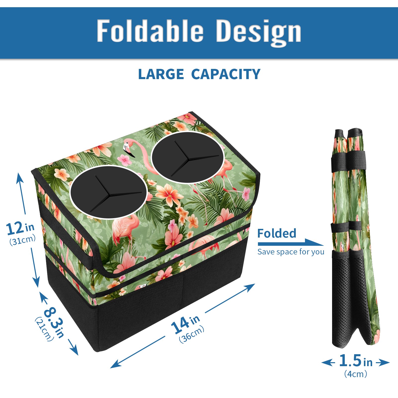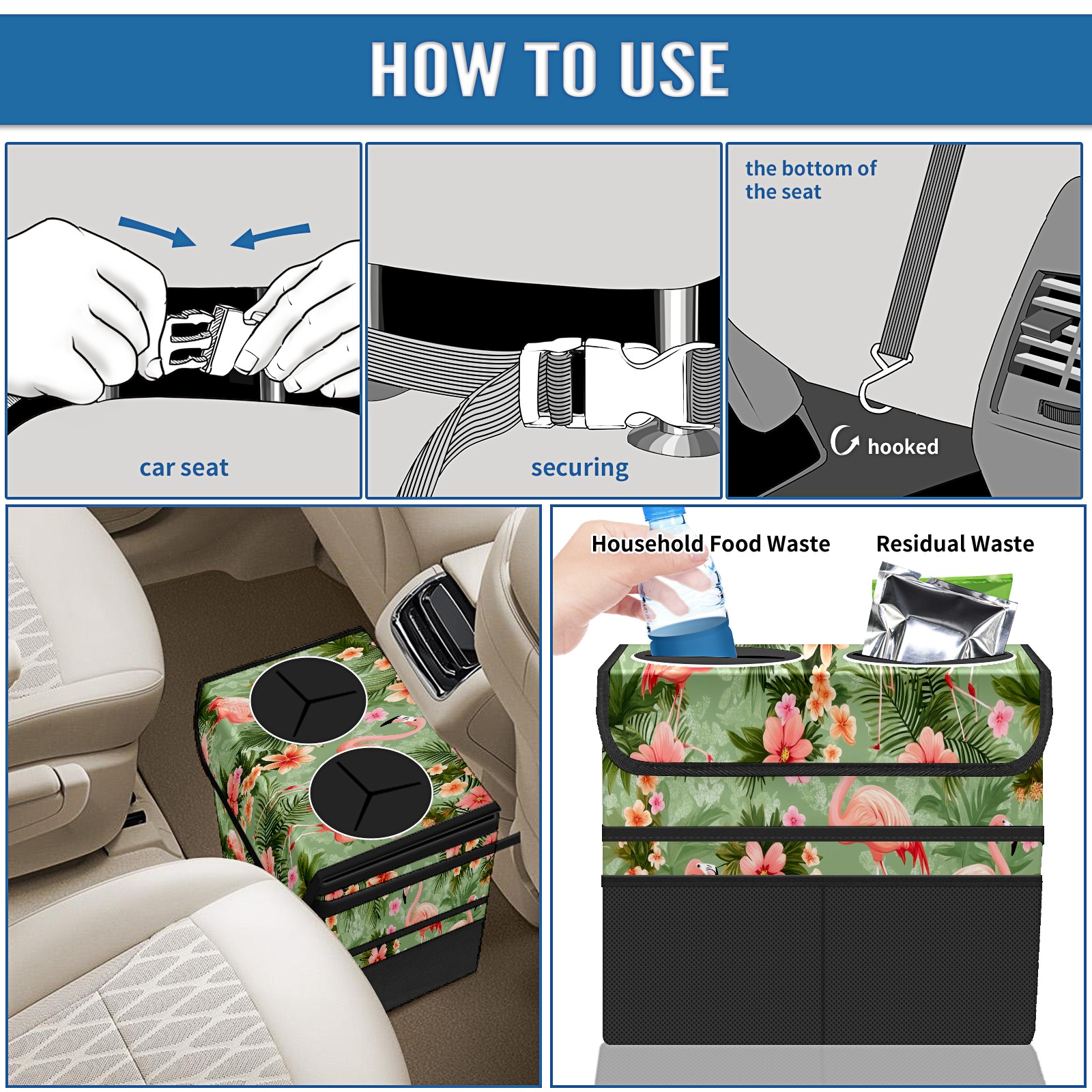 Car Trash Can with Lid, Portable Hanging Automotive Garbage Bin for Vehicles, Leakproof Waste Bag Container for SUV Truck Van Interior Auto Travel Road Trips(Dark Green Leaves Flamingo)