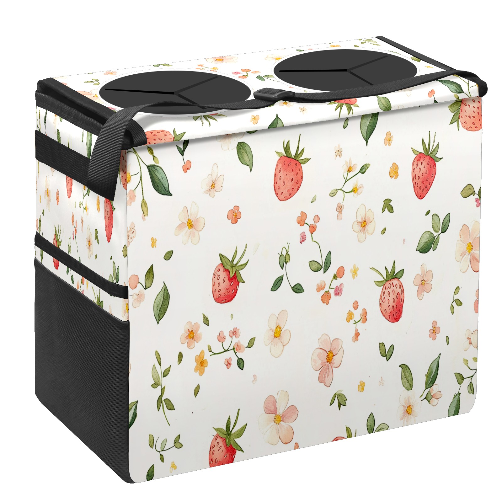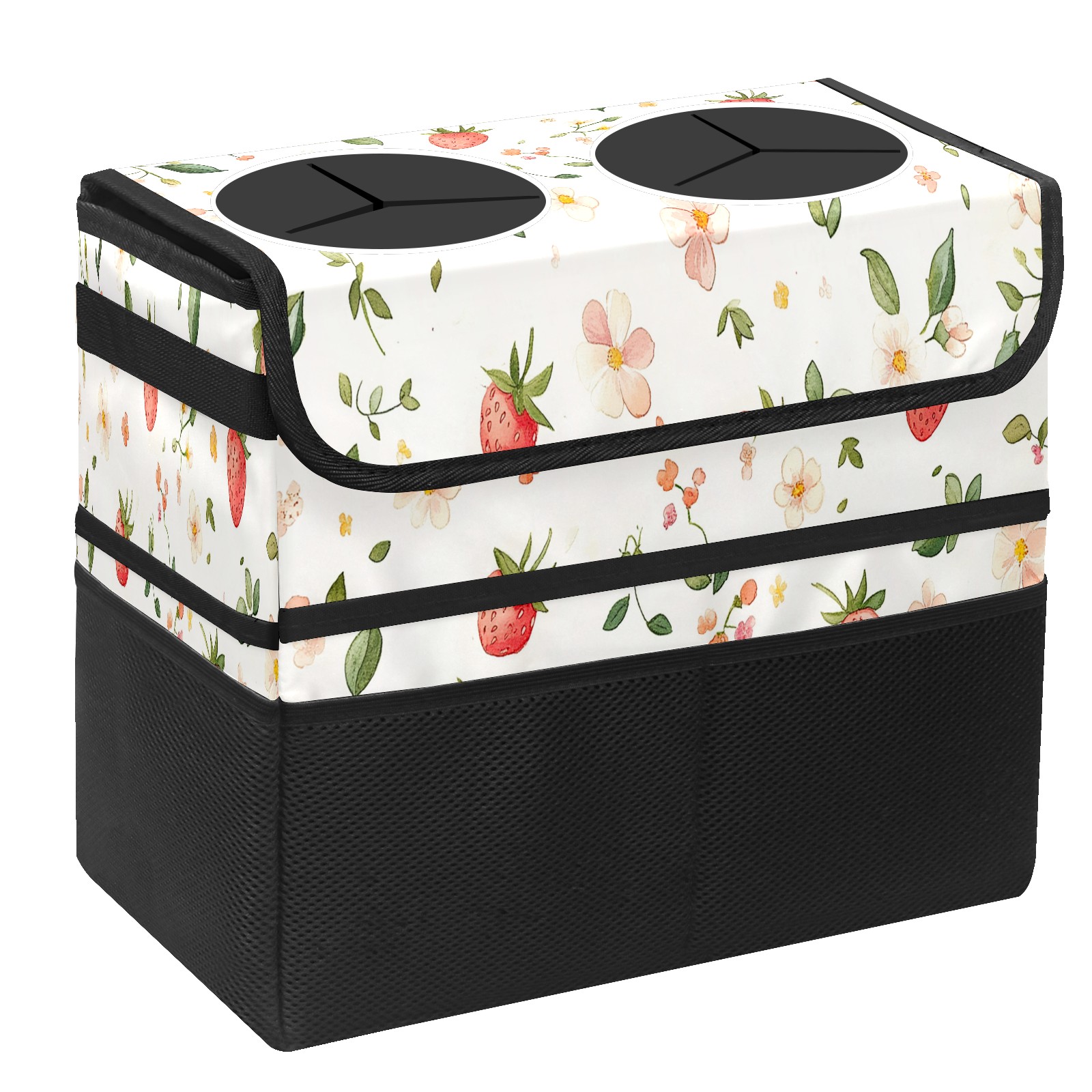 Car Trash Can with Lid, Portable Hanging Automotive Garbage Bin for Vehicles, Leakproof Waste Bag Container for SUV Truck Van Interior Auto Travel Road Trips(Tiny Strawberry Floral Pattern)
