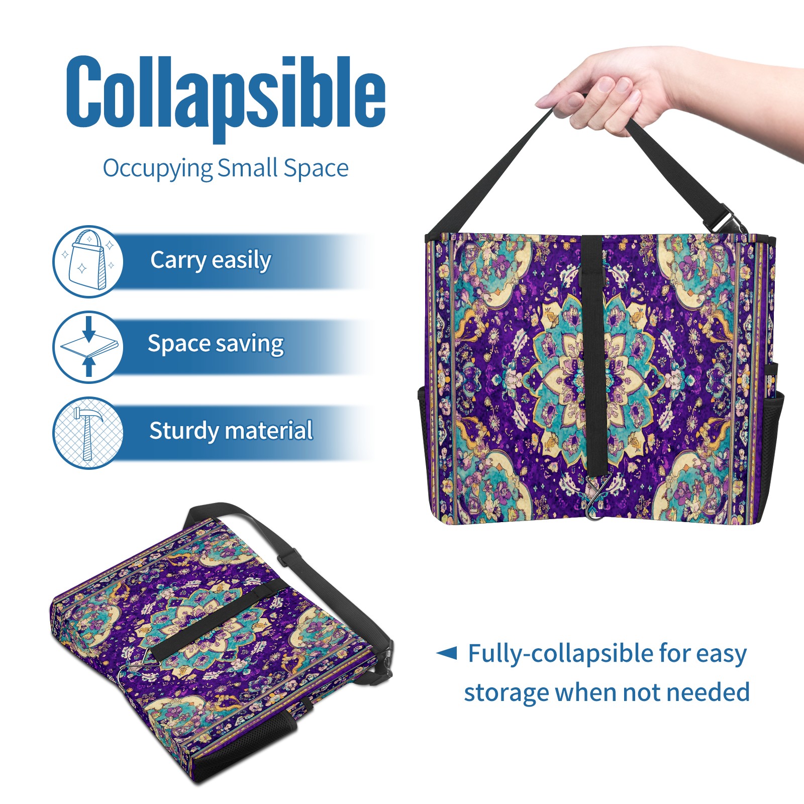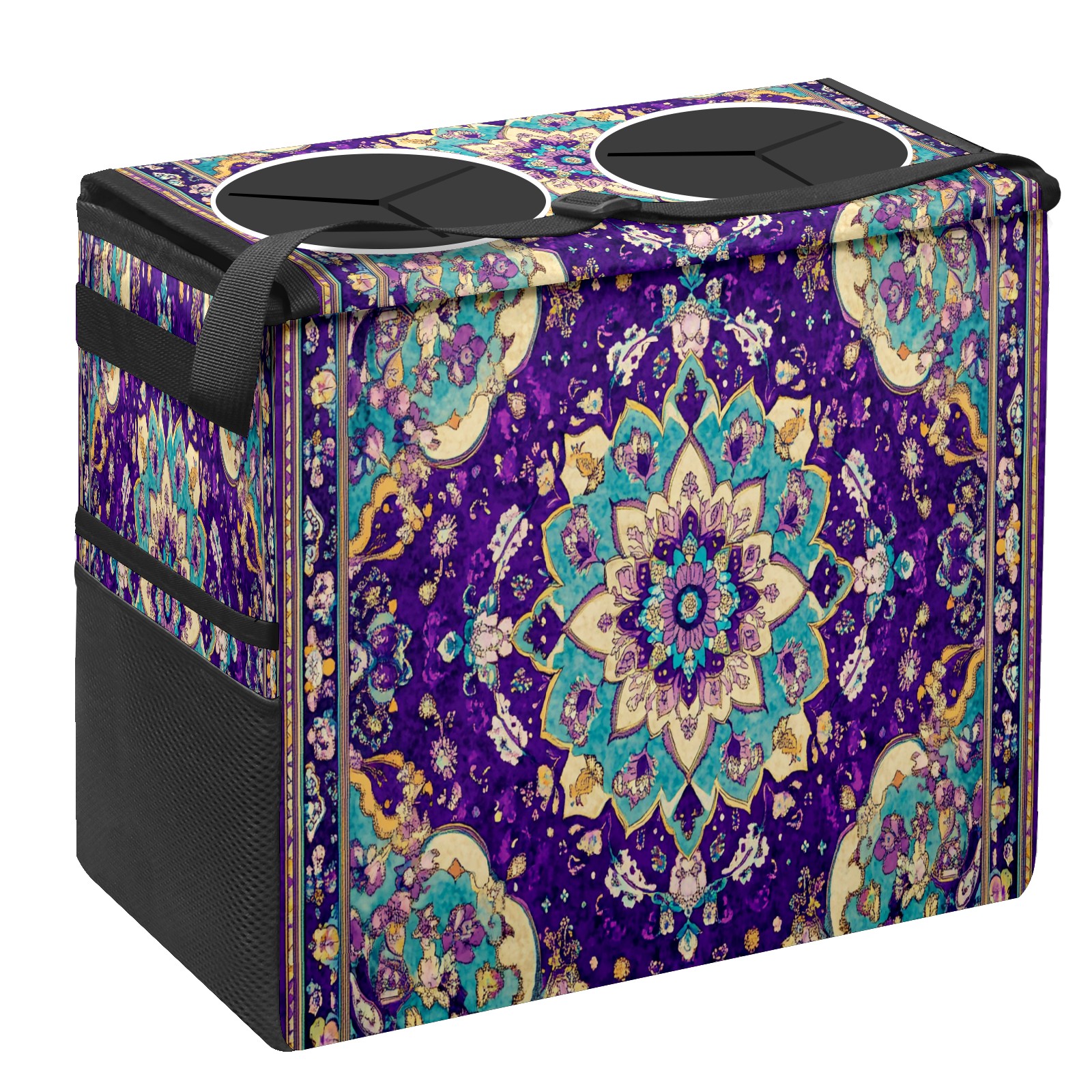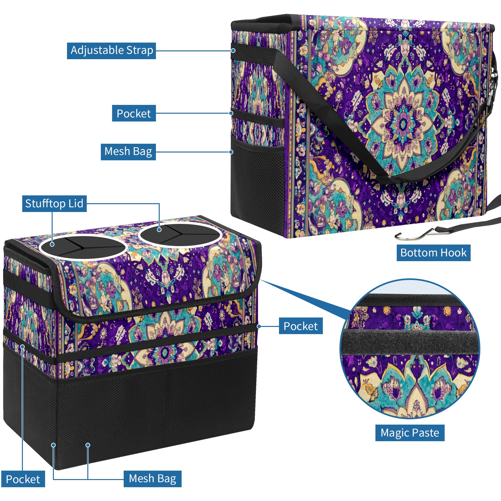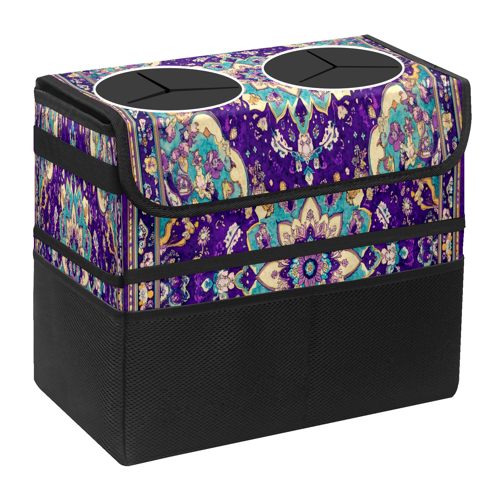 Car Trash Can with Lid, Portable Hanging Automotive Garbage Bin for Vehicles, Leakproof Waste Bag Container for SUV Truck Van Interior Auto Travel Road Trips(Dark Purple Yellow Pattern)