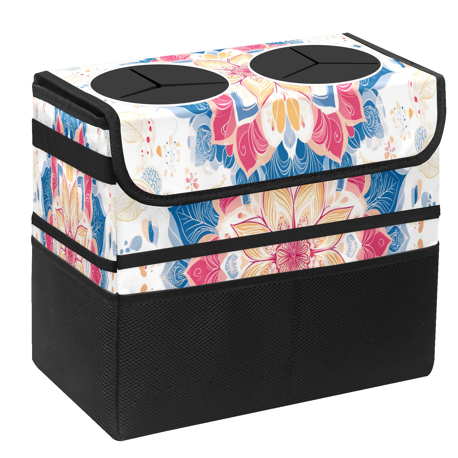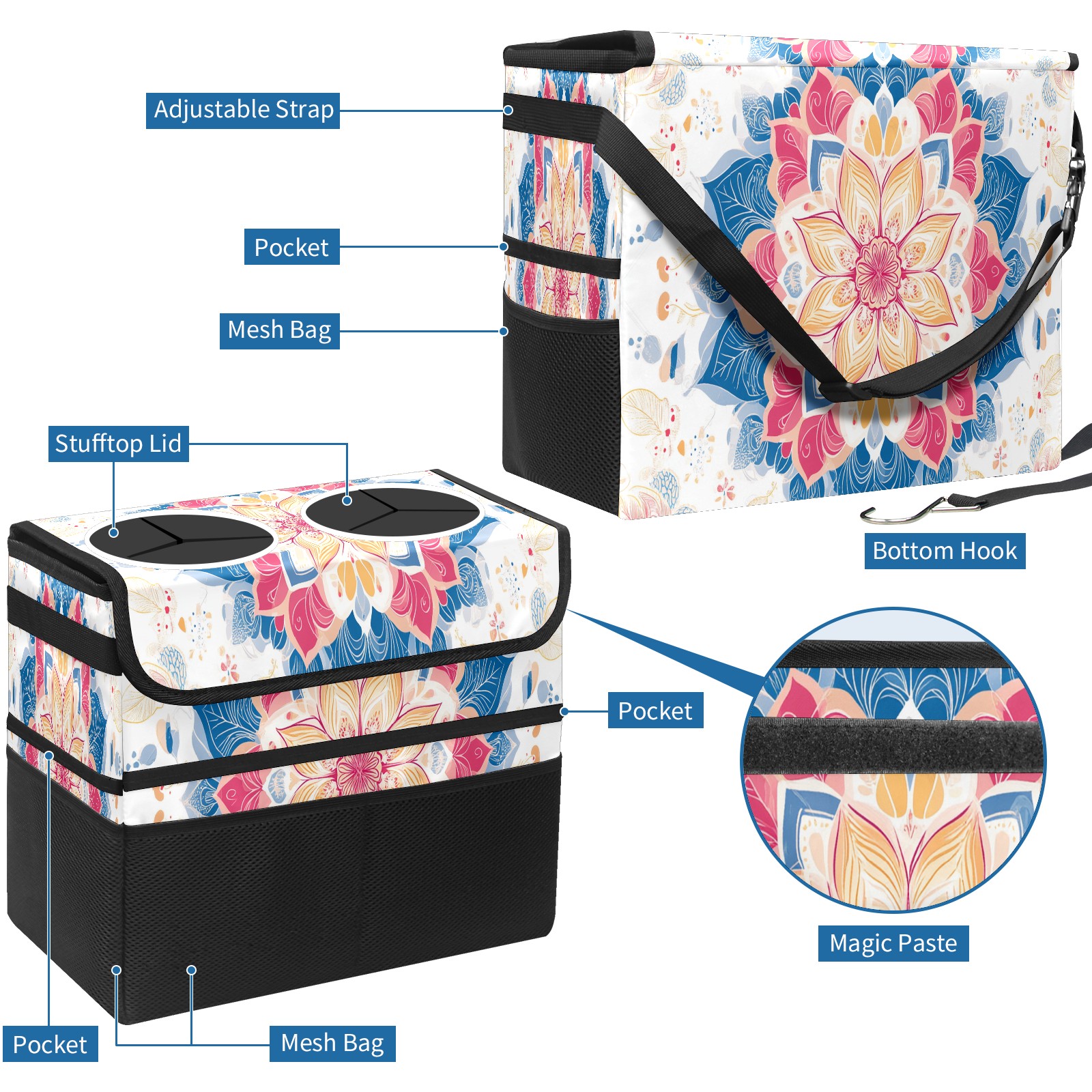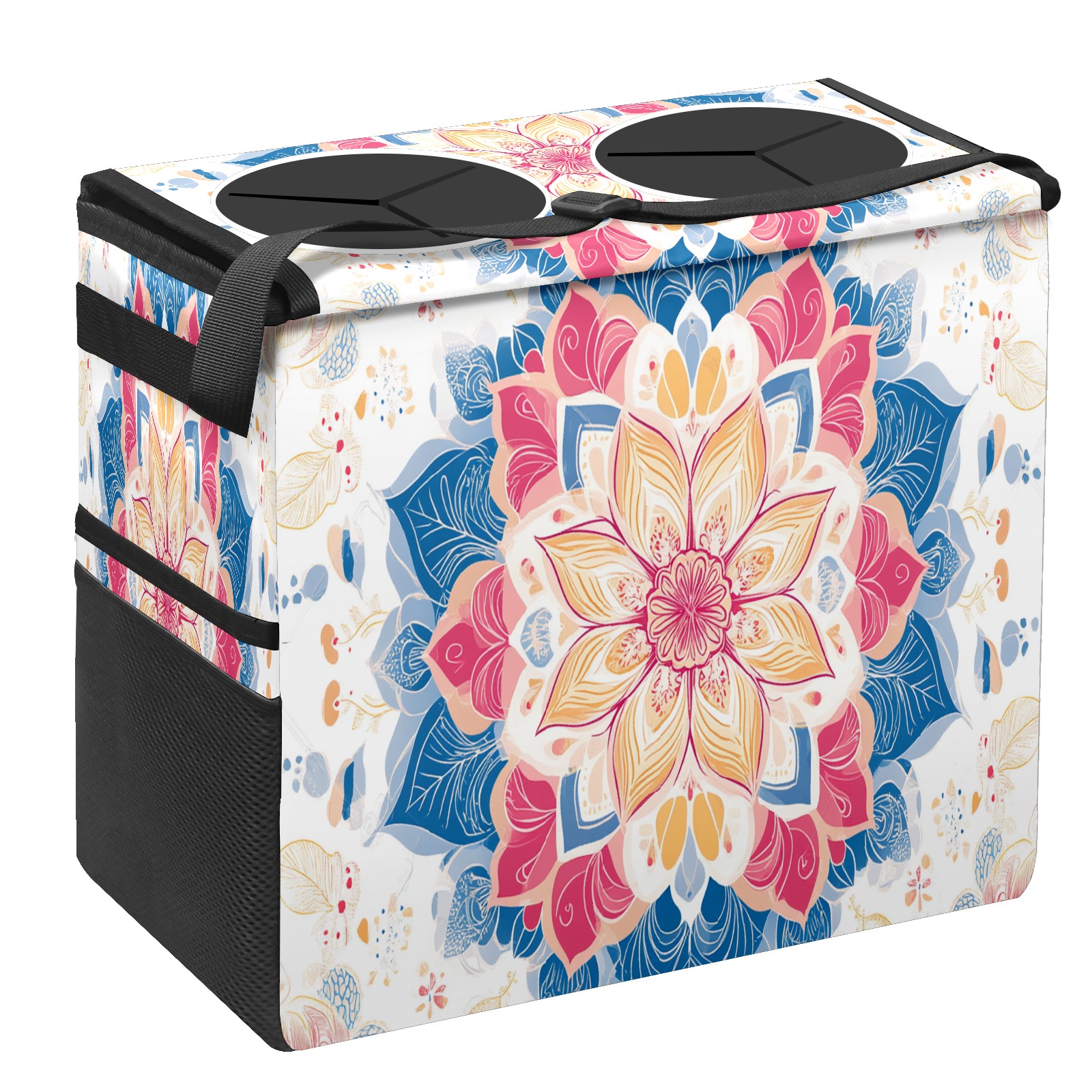 Car Trash Can with Lid, Portable Hanging Automotive Garbage Bin for Vehicles, Leakproof Waste Bag Container for SUV Truck Van Interior Auto Travel Road Trips(Blue Red Mandala)