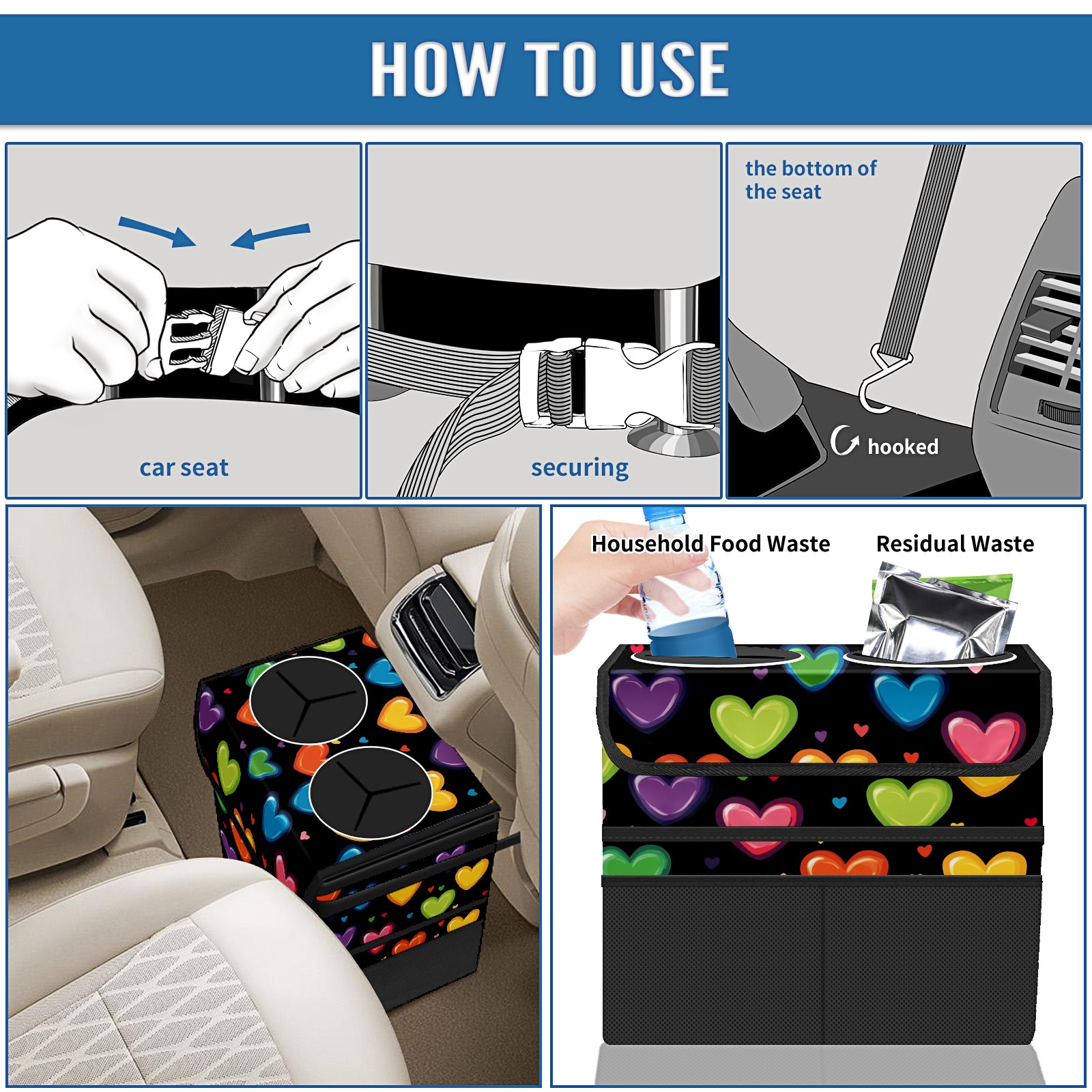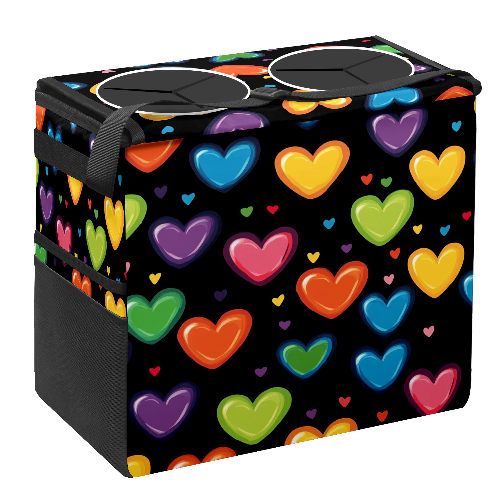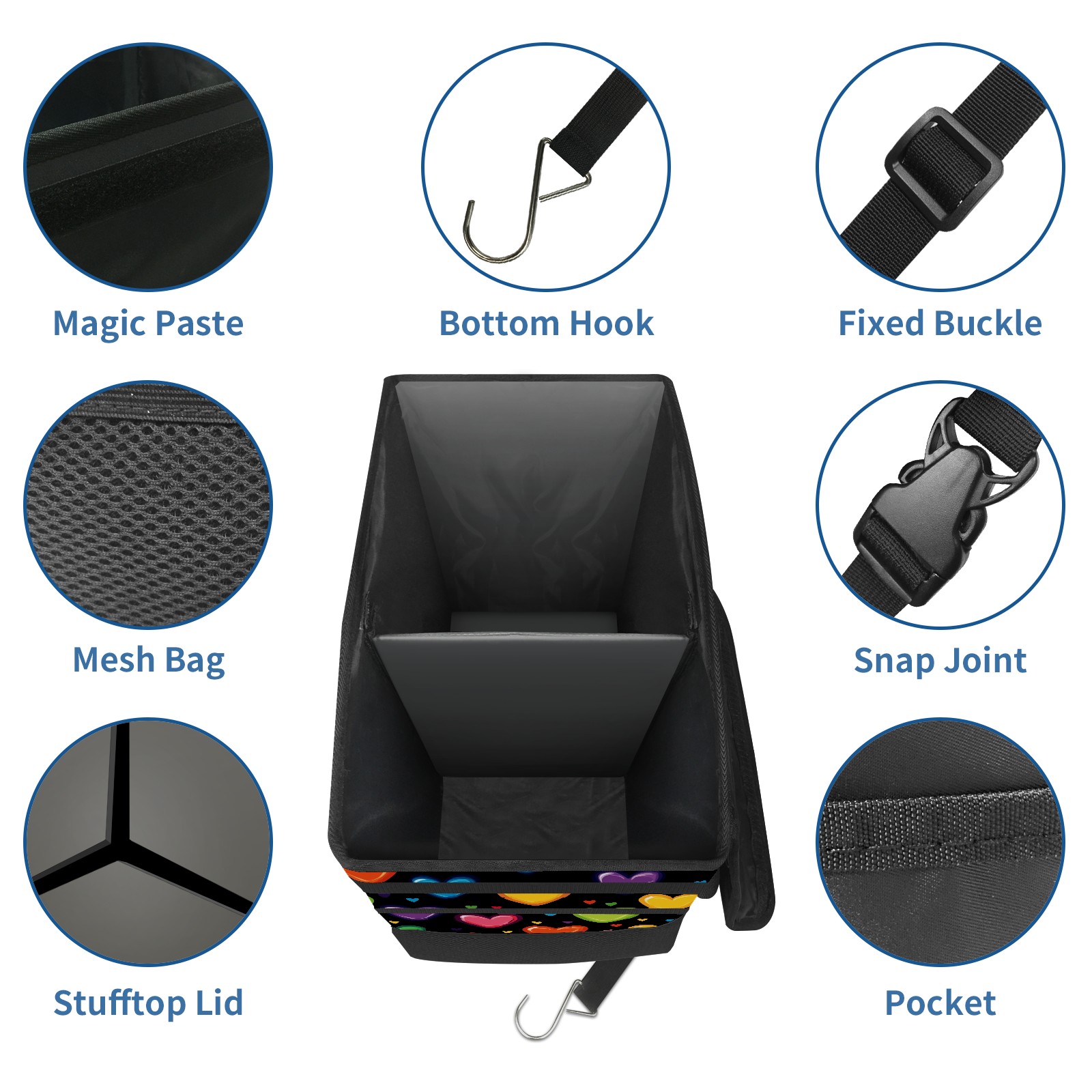 Car Trash Can with Lid, Portable Hanging Automotive Garbage Bin for Vehicles, Leakproof Waste Bag Container for SUV Truck Van Interior Auto Travel Road Trips(Hearts In Rainbow Colors)