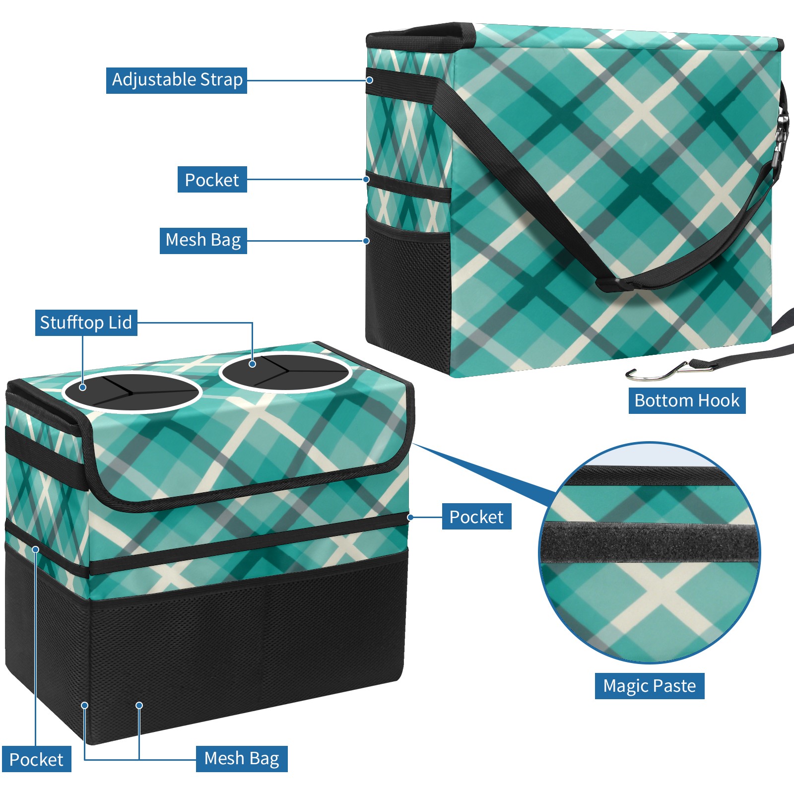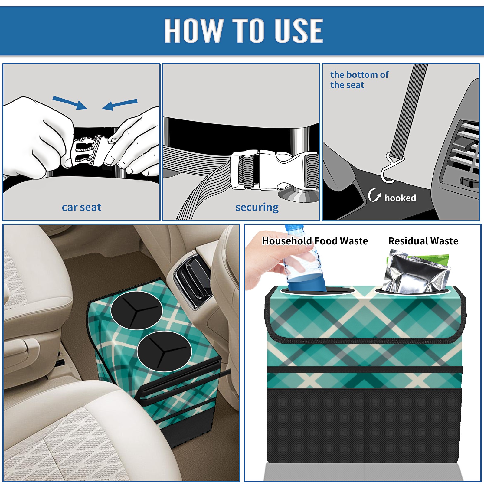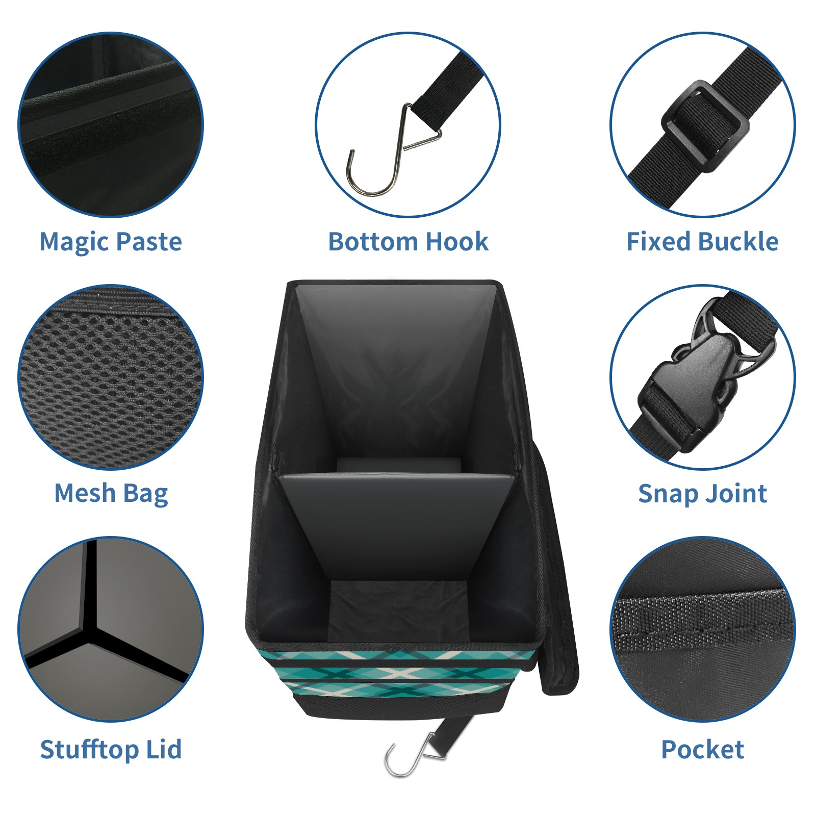 Car Trash Can with Lid, Portable Hanging Automotive Garbage Bin for Vehicles, Leakproof Waste Bag Container for SUV Truck Van Interior Auto Travel Road Trips(Blue Checkered)