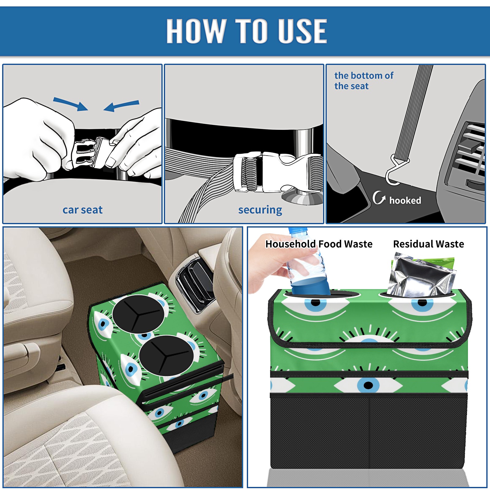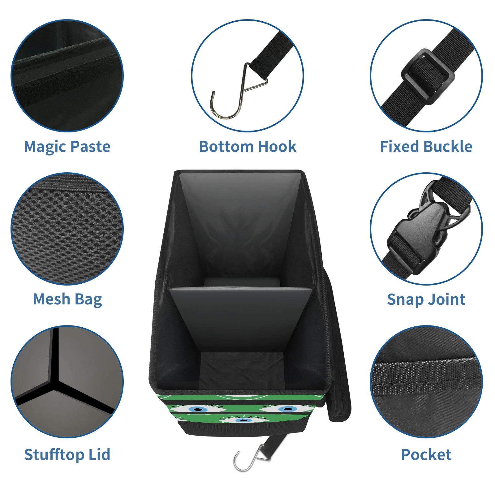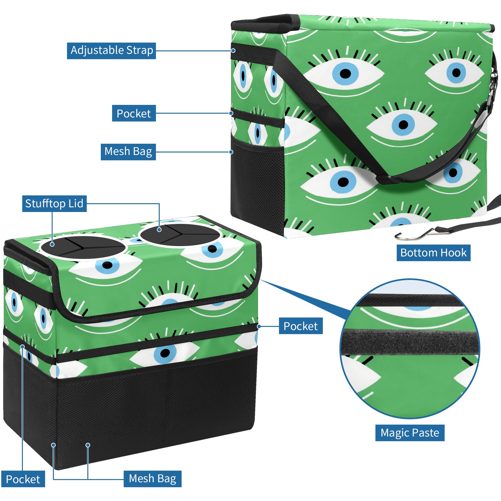 Car Trash Can with Lid, Portable Hanging Automotive Garbage Bin for Vehicles, Leakproof Waste Bag Container for SUV Truck Van Interior Auto Travel Road Trips(Green Eyes)