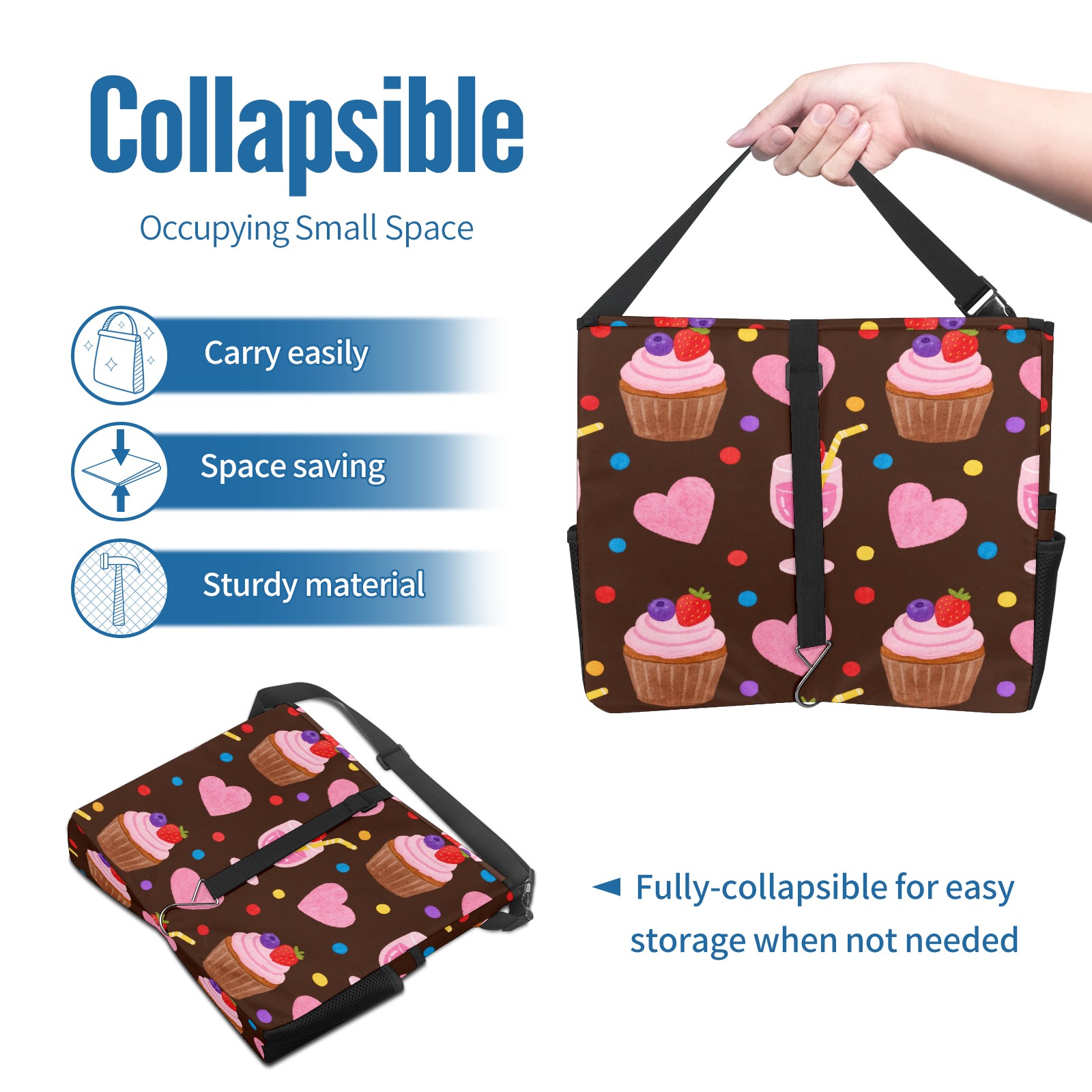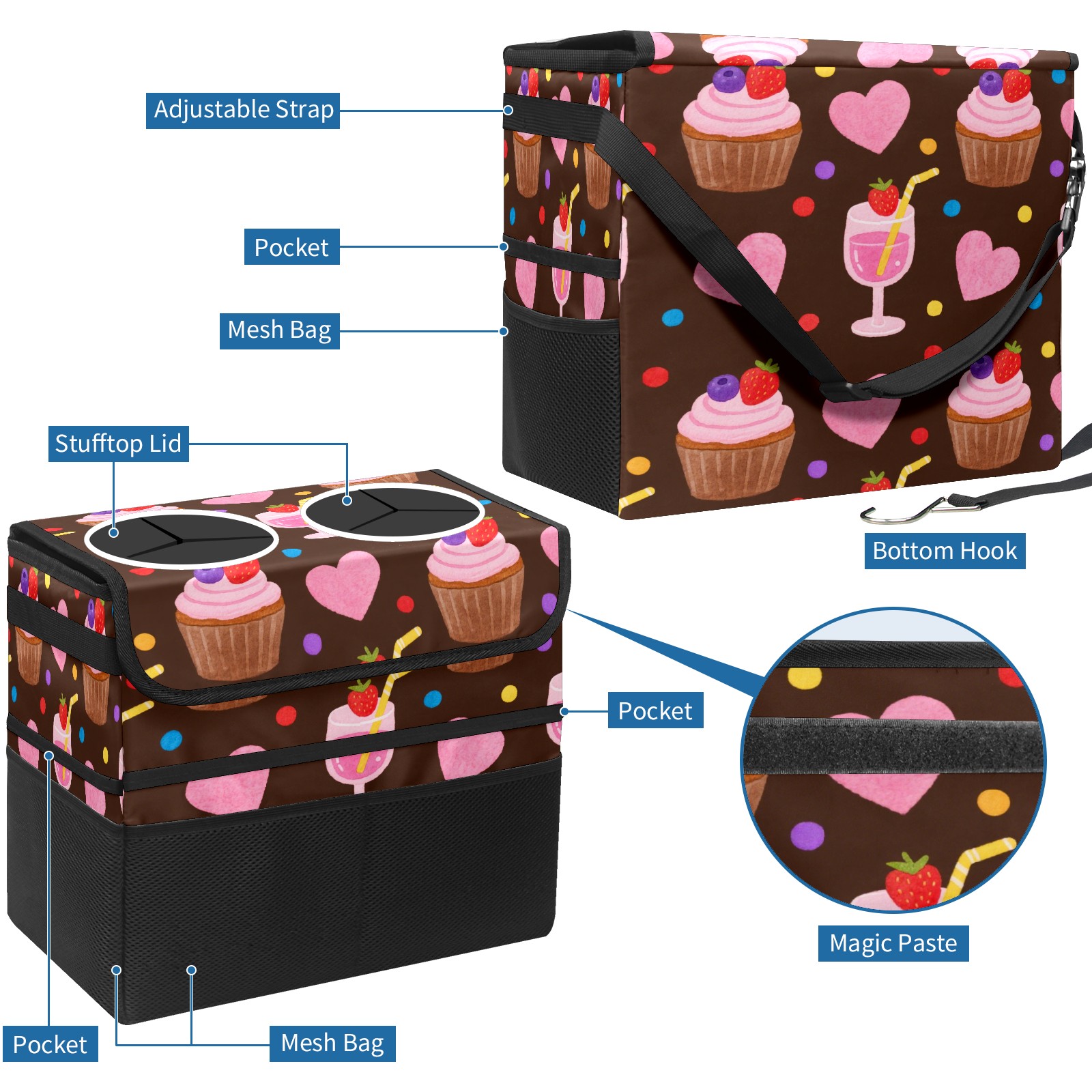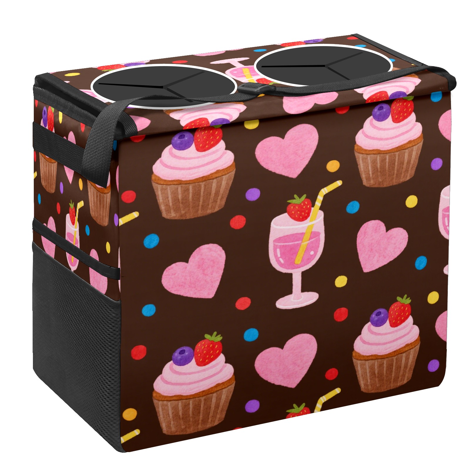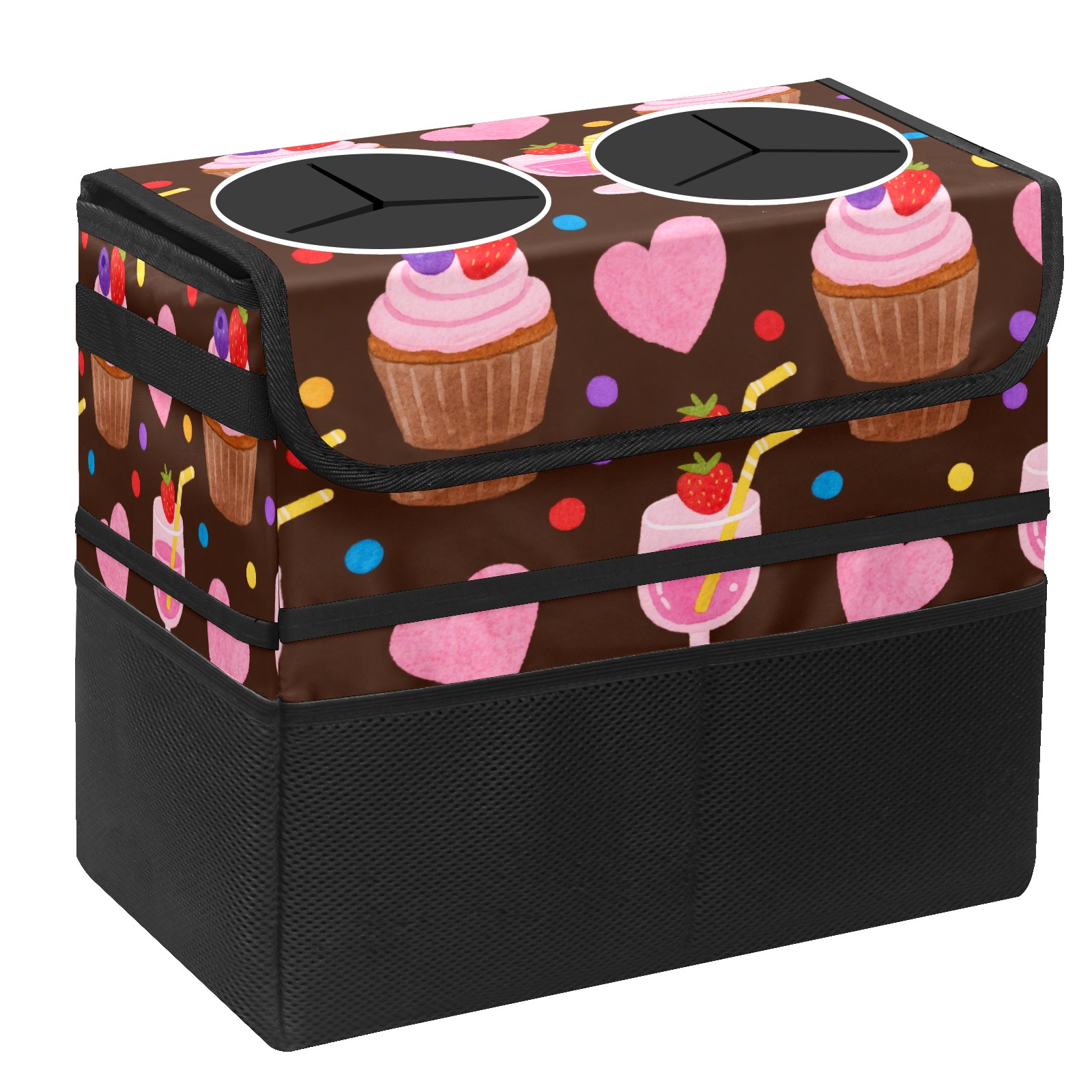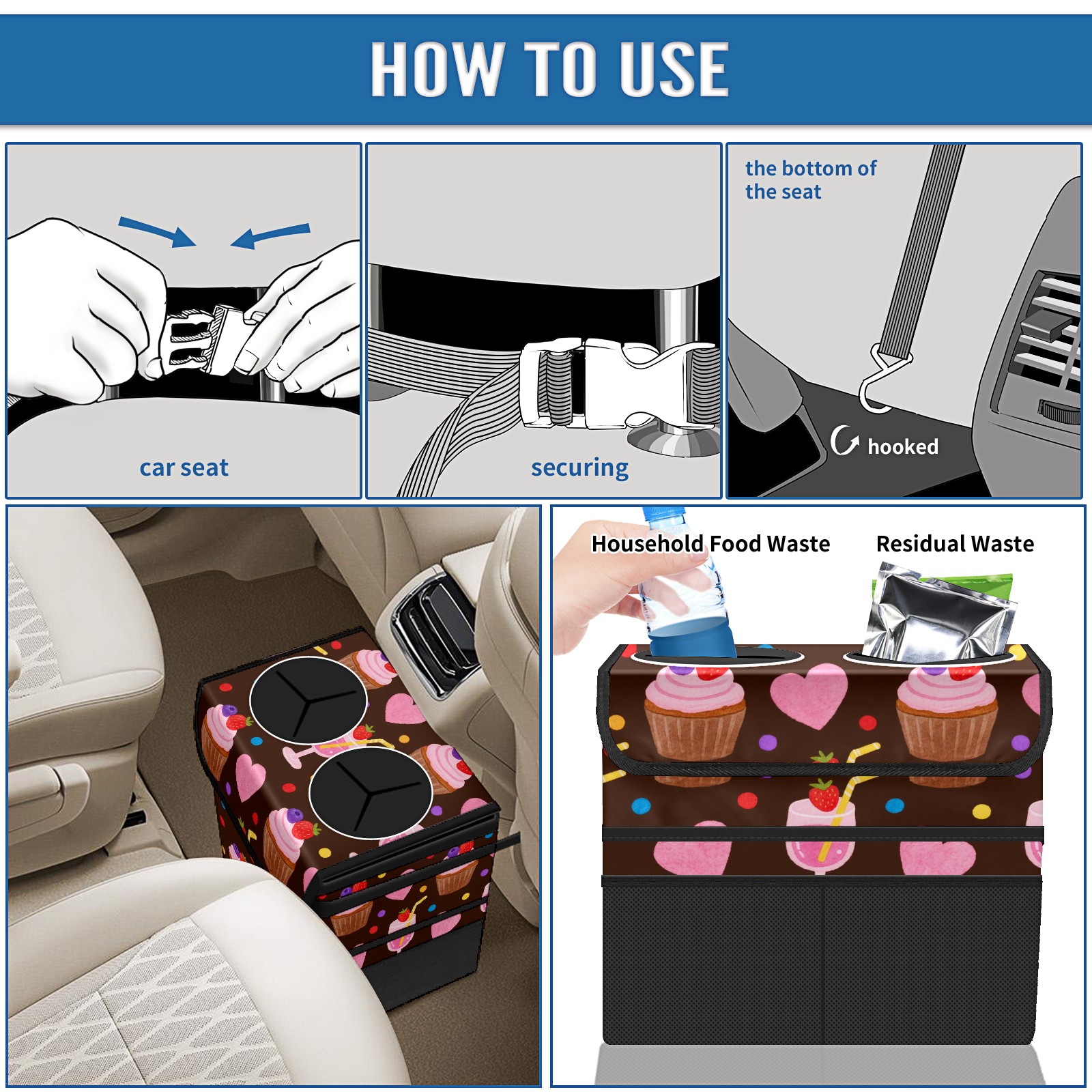 Car Trash Can with Lid, Portable Hanging Automotive Garbage Bin for Vehicles, Leakproof Waste Bag Container for SUV Truck Van Interior Auto Travel Road Trips(Cupcake And Juice)