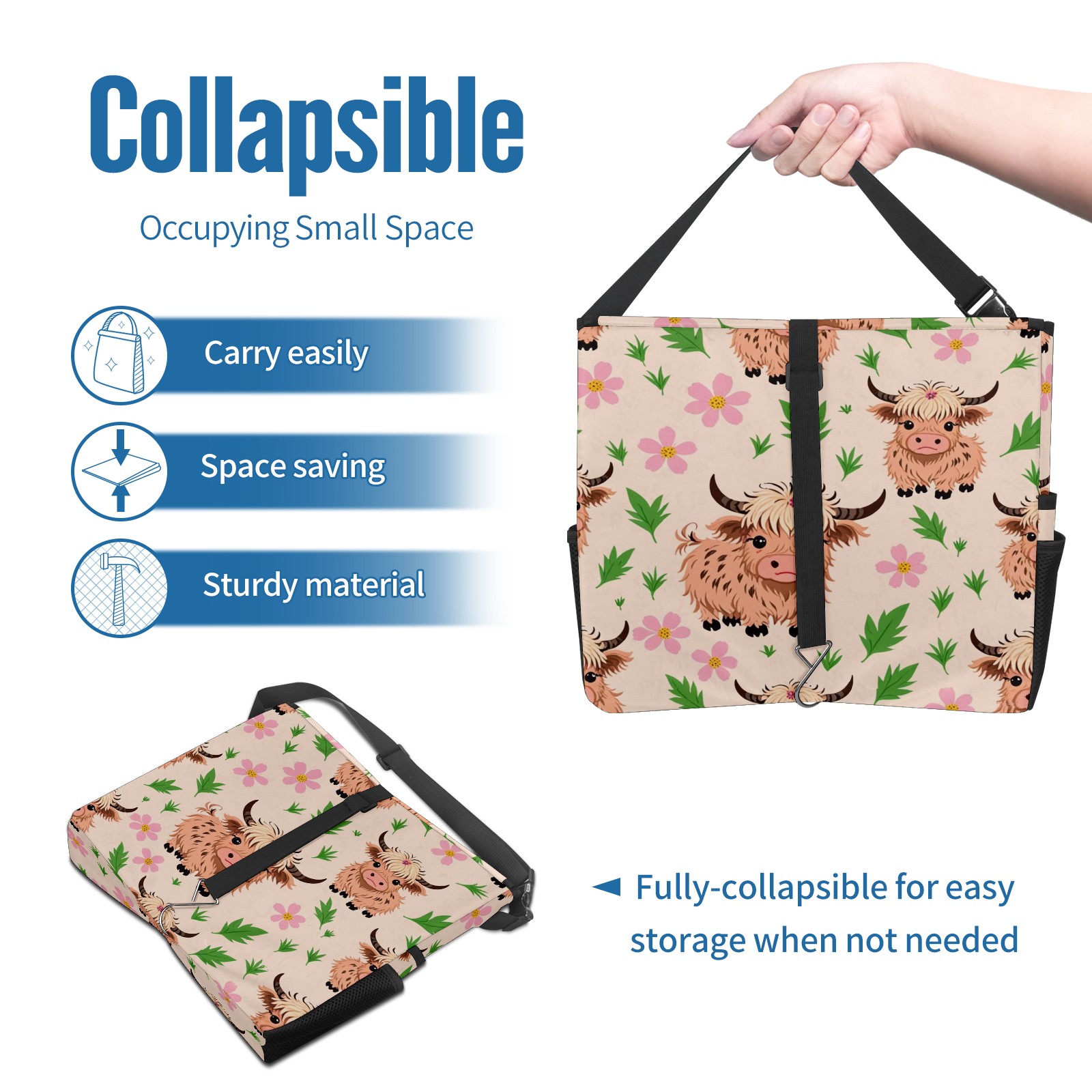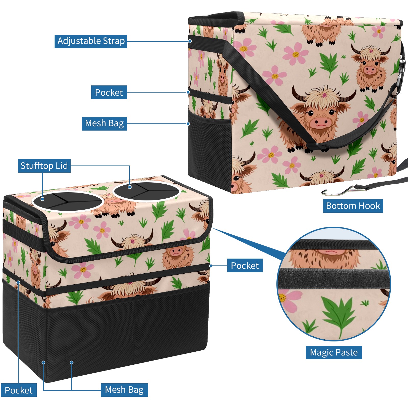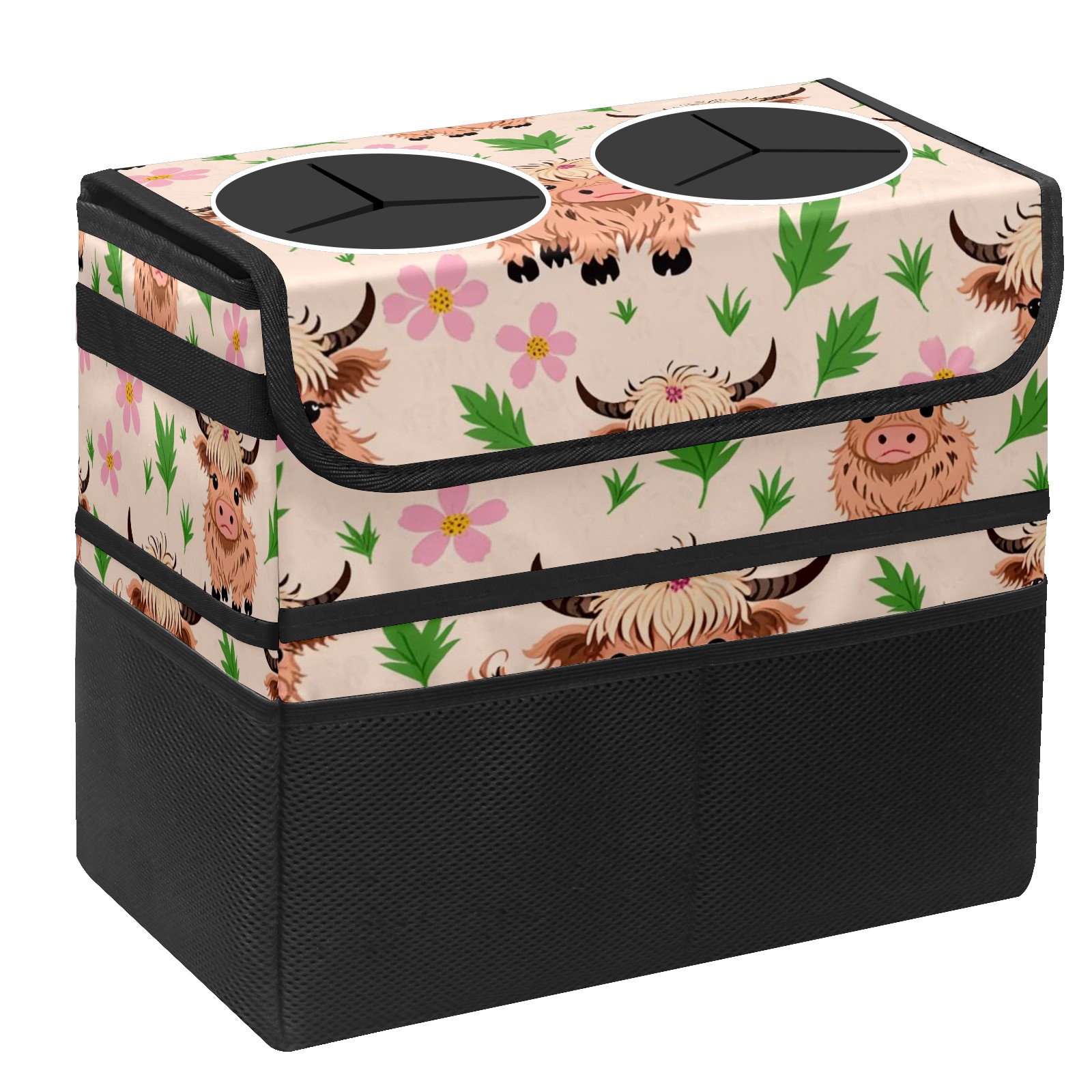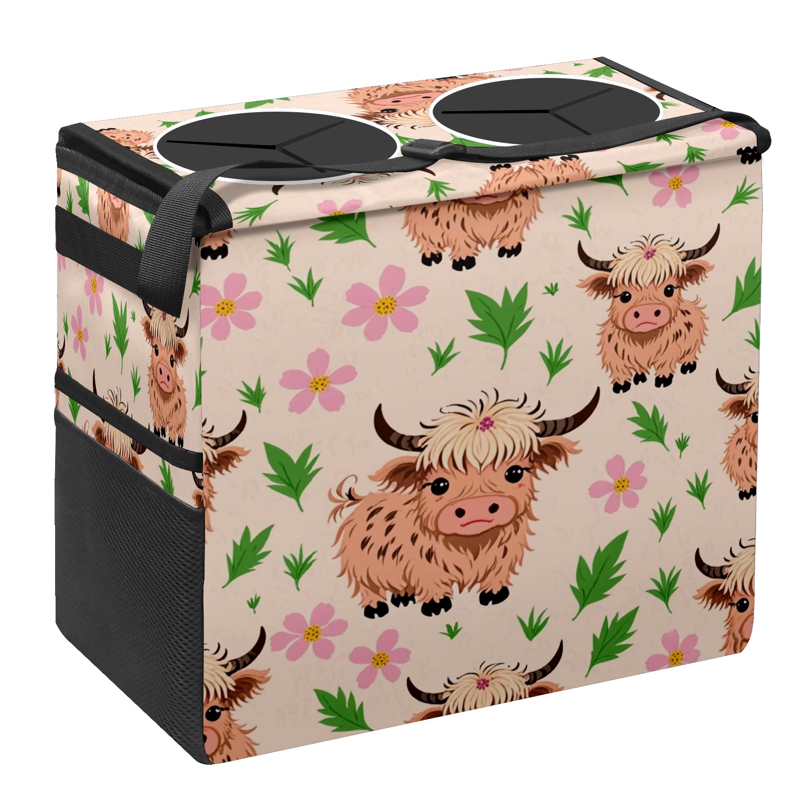 Car Trash Can with Lid, Portable Hanging Automotive Garbage Bin for Vehicles, Leakproof Waste Bag Container for SUV Truck Van Interior Auto Travel Road Trips(Highland Cattle)