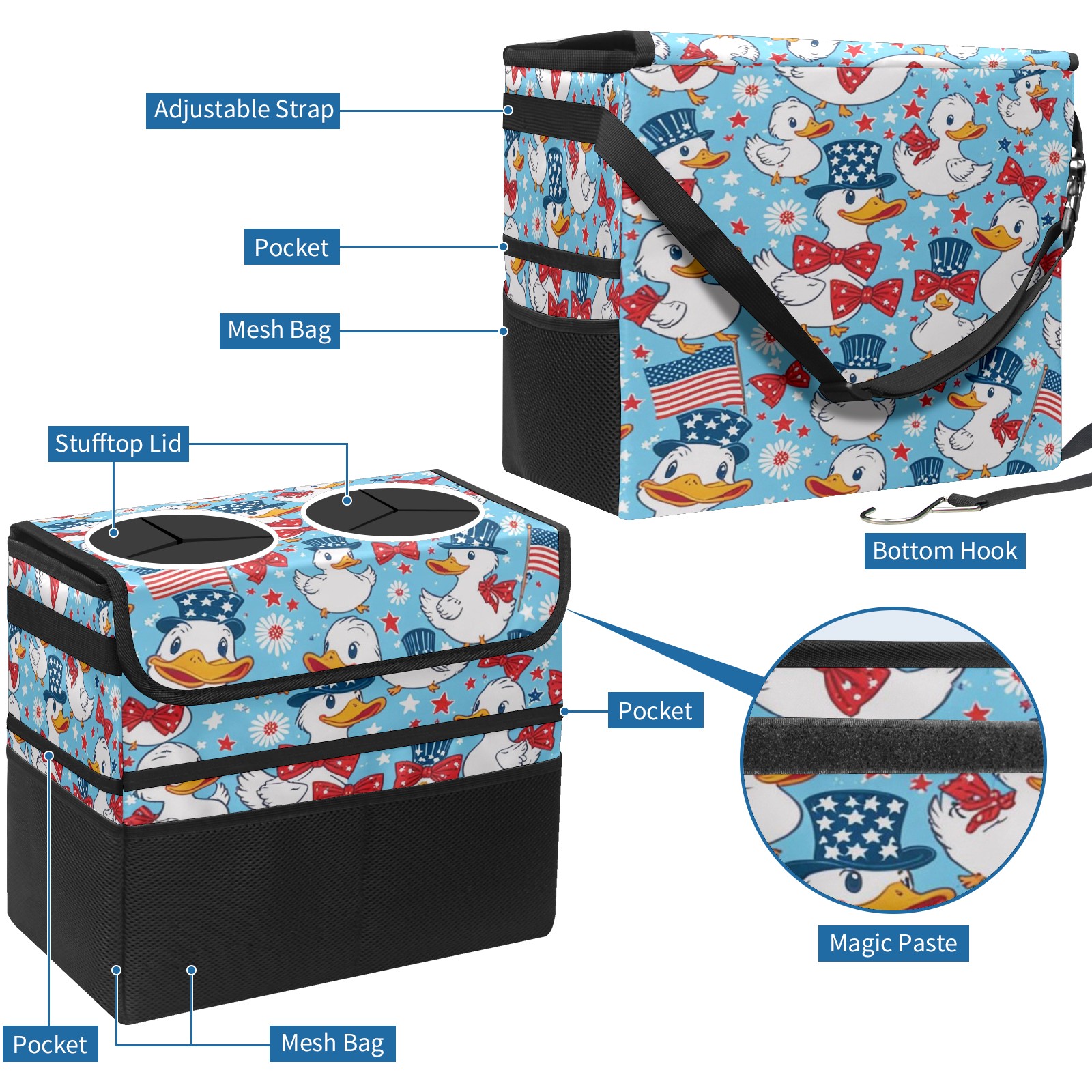 Car Trash Can with Lid, Portable Hanging Automotive Garbage Bin for Vehicles, Leakproof Waste Bag Container for SUV Truck Van Interior Auto Travel Road Trips(American Duck)