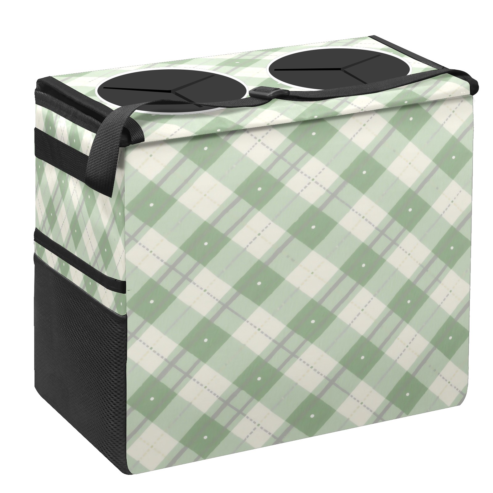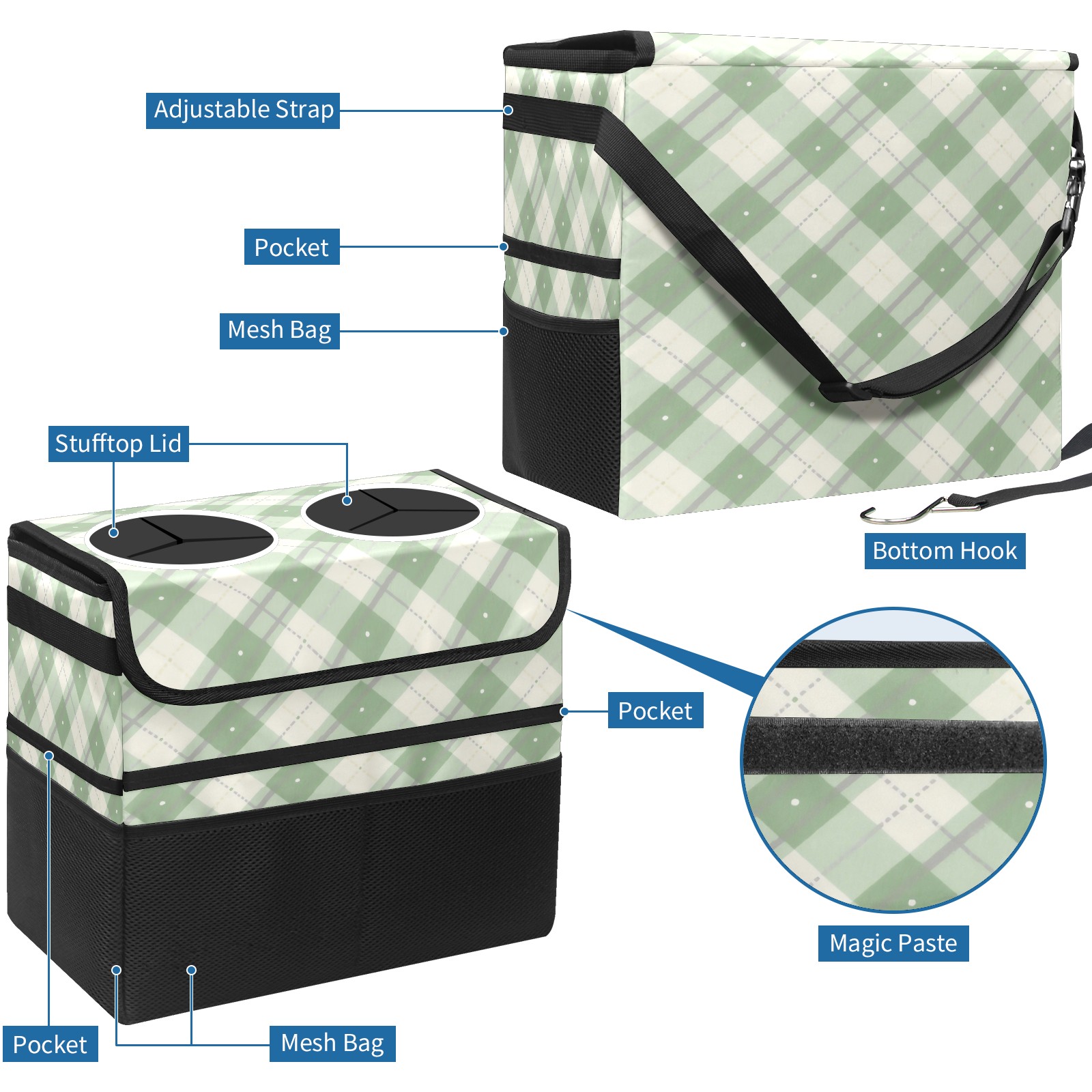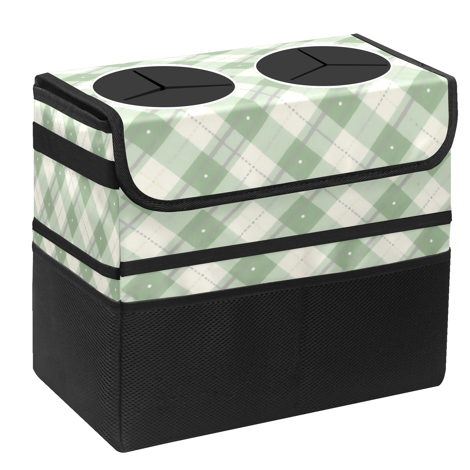 Car Trash Can with Lid, Portable Hanging Automotive Garbage Bin for Vehicles, Leakproof Waste Bag Container for SUV Truck Van Interior Auto Travel Road Trips(White Green Checkered)