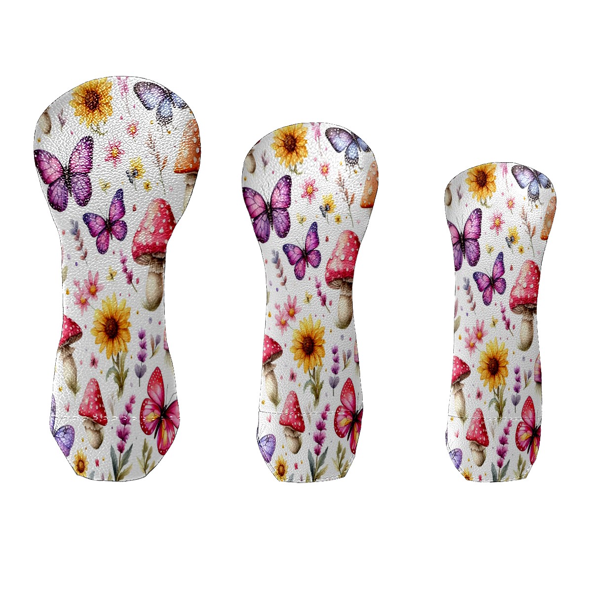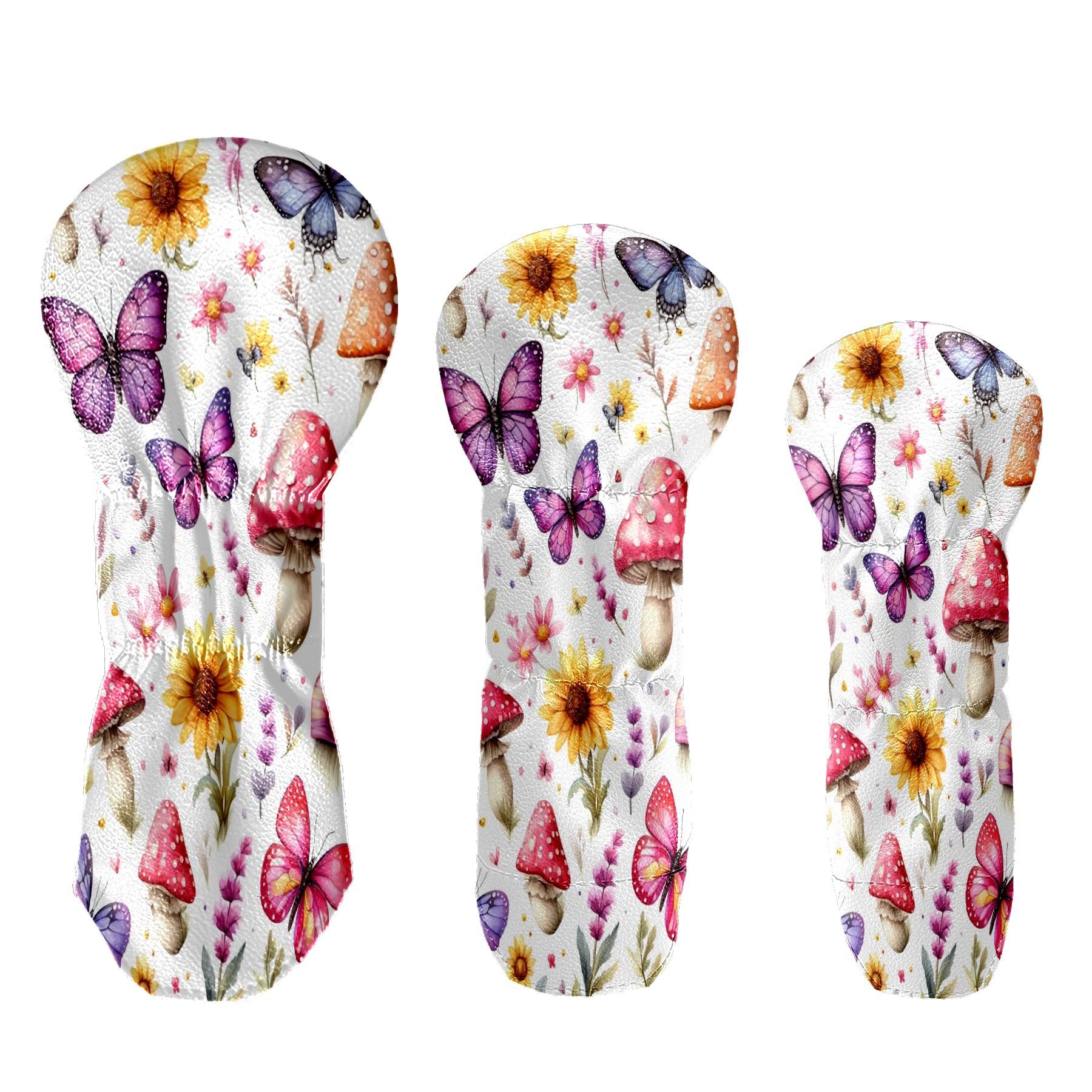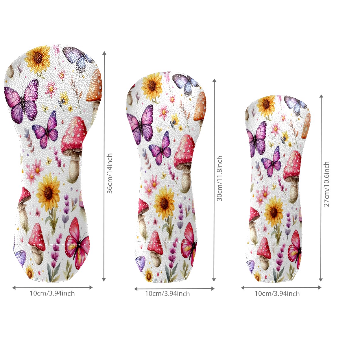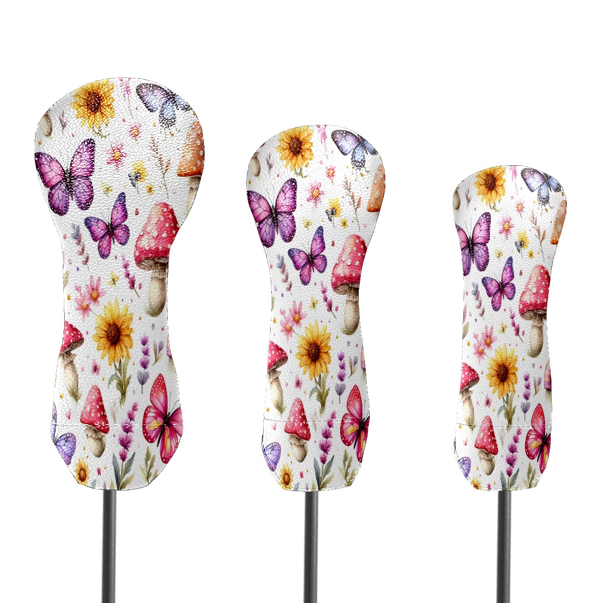 Golf Head Covers 3-Pack Purple Butterflies Mushrooms Waterproof PU Leather & Plush Velvet Lining Fits Driver Fairway Hybrid Clubs, Scratch Protection Durable Golf Gift for Men & Women
