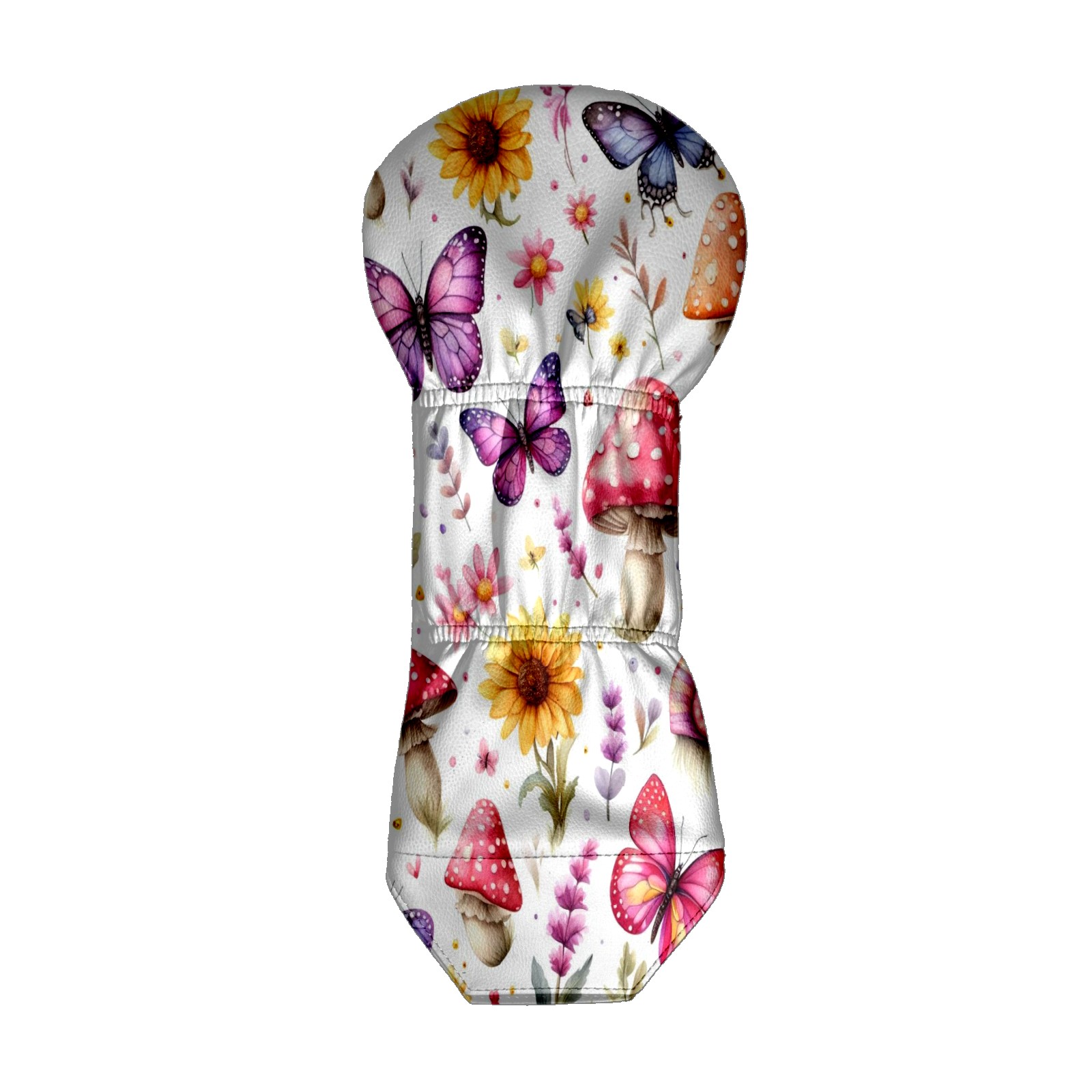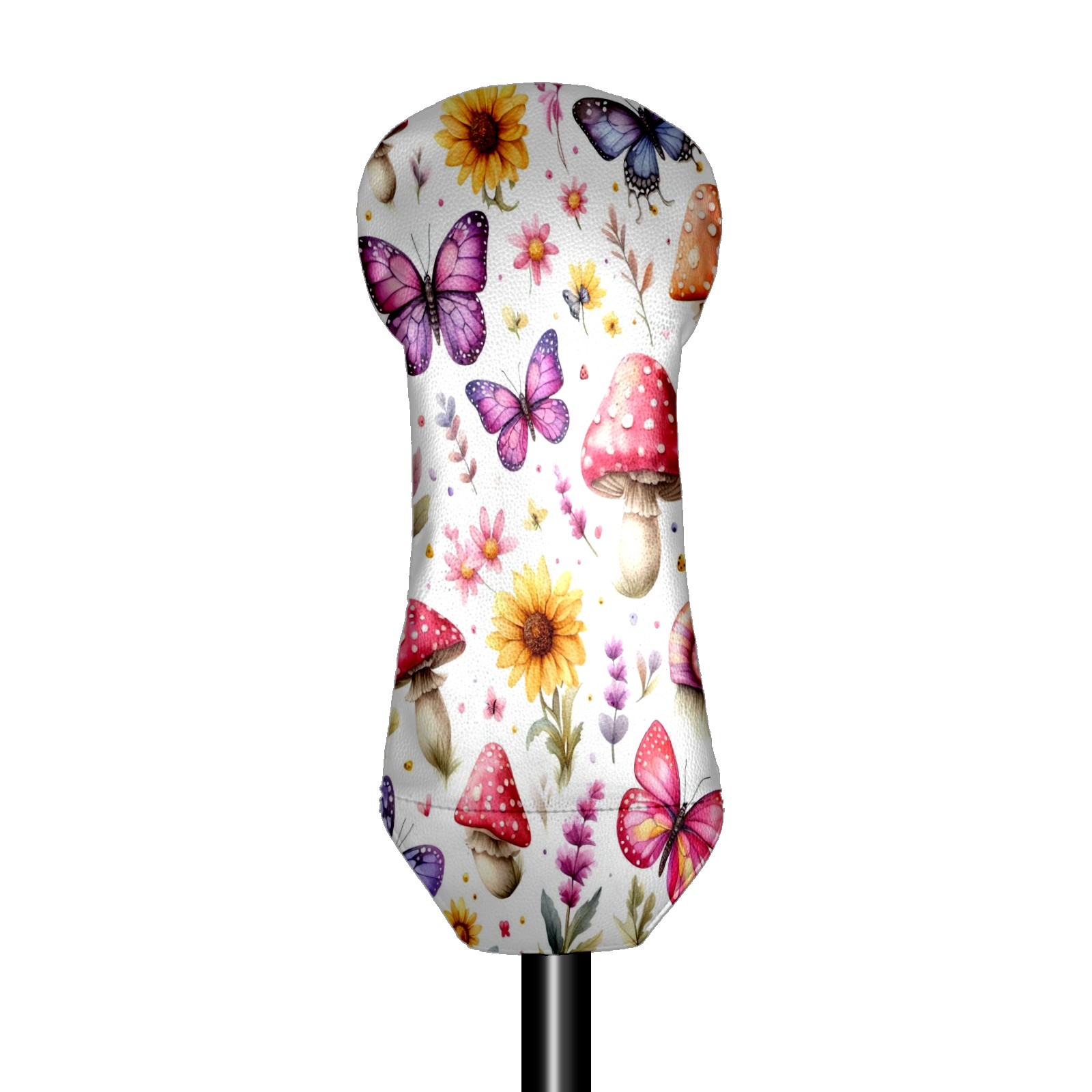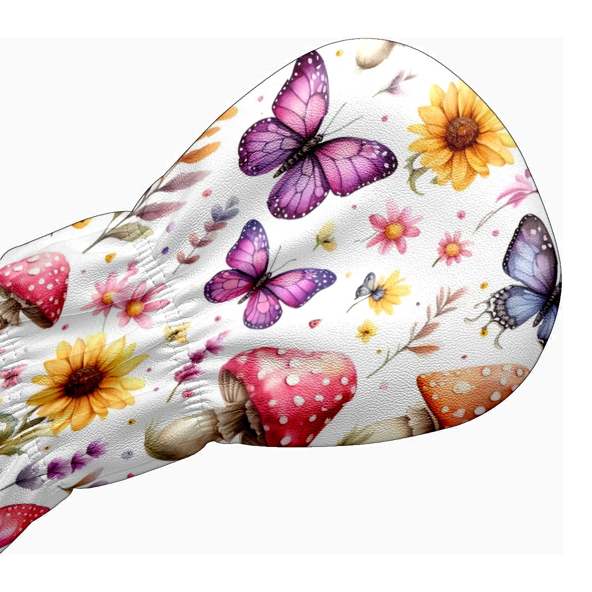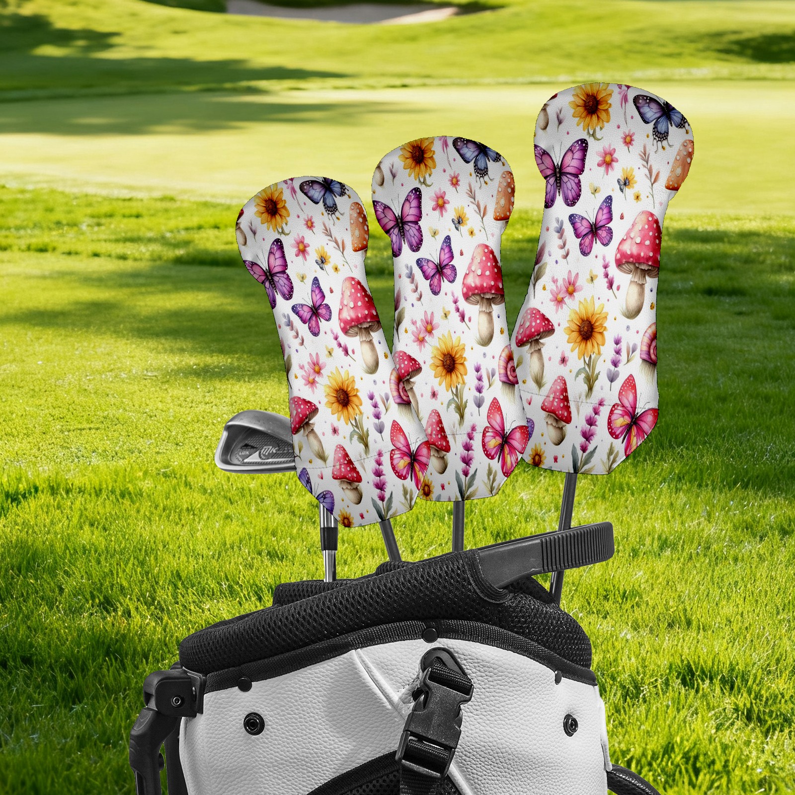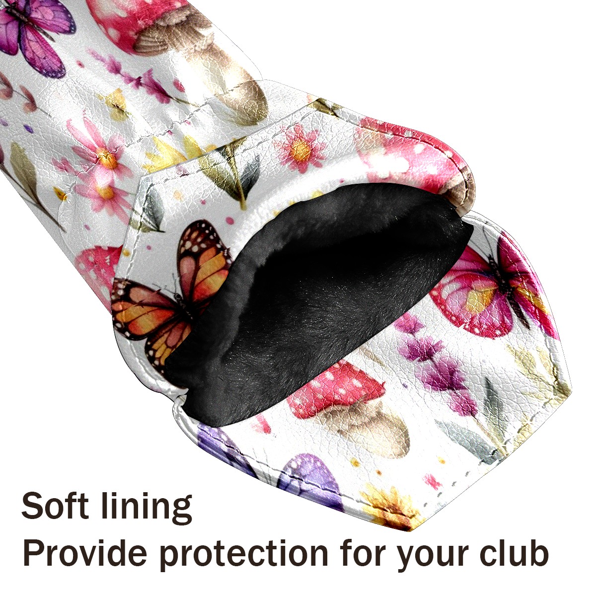Golf Head Covers 3-Pack Purple Butterflies Mushrooms Waterproof PU Leather & Plush Velvet Lining Fits Driver Fairway Hybrid Clubs, Scratch Protection Durable Golf Gift for Men & Women