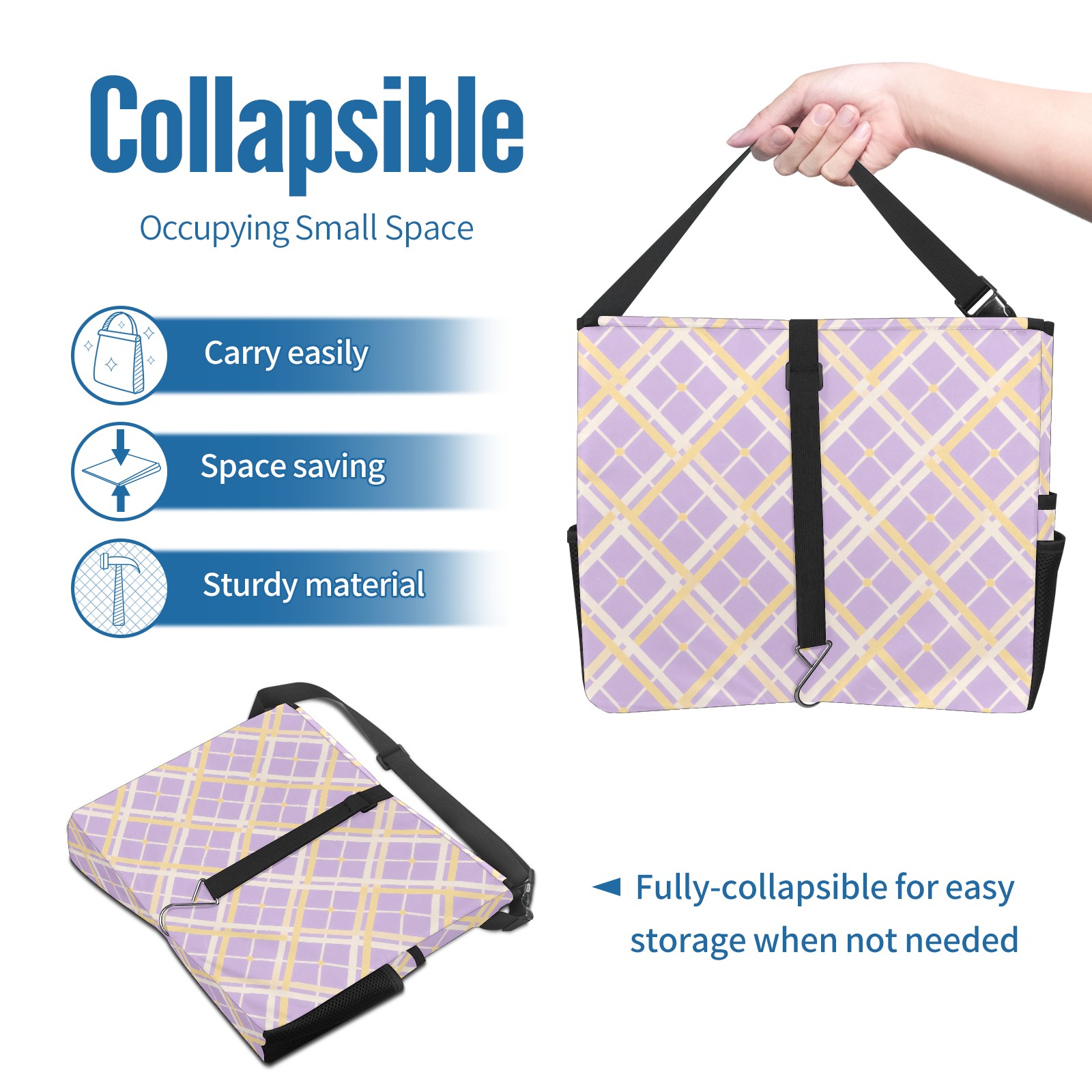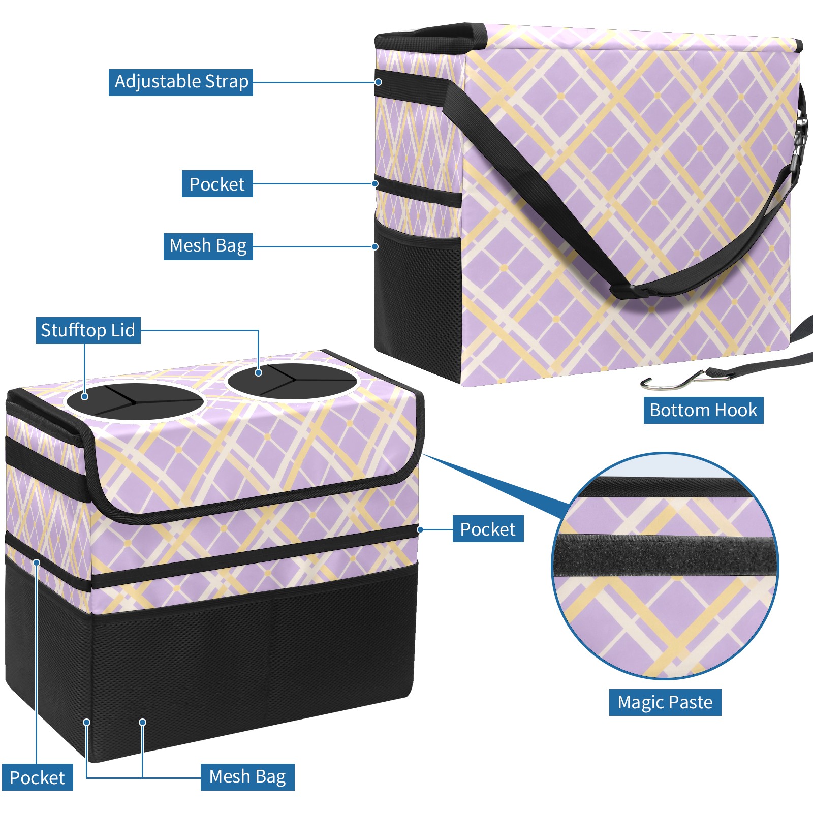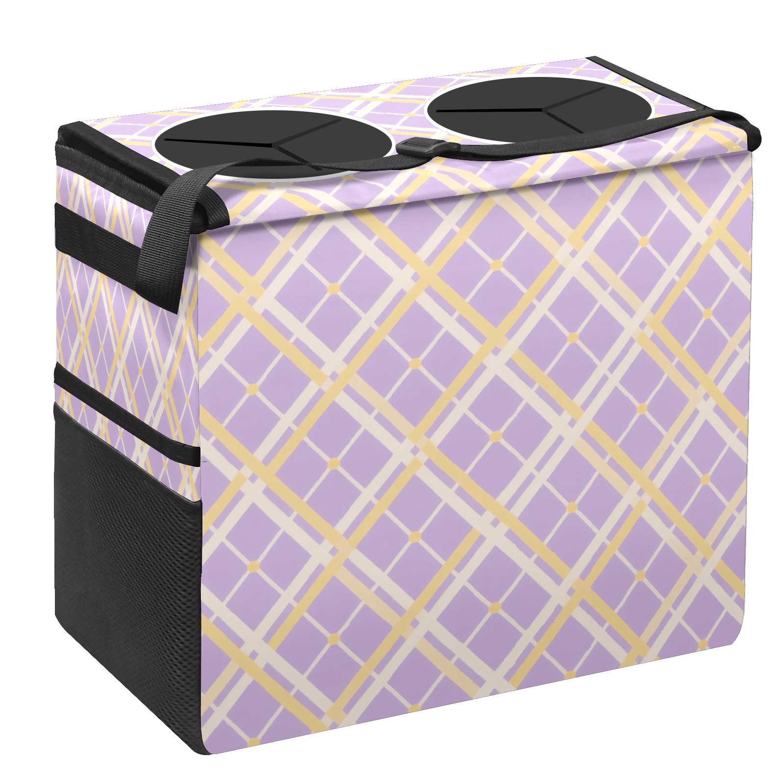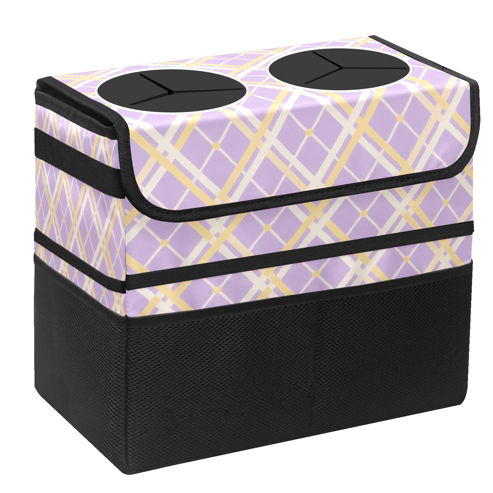 Car Trash Can with Lid, Portable Hanging Automotive Garbage Bin for Vehicles, Leakproof Waste Bag Container for SUV Truck Van Interior Auto Travel Road Trips(Purple Yellow Checkered)