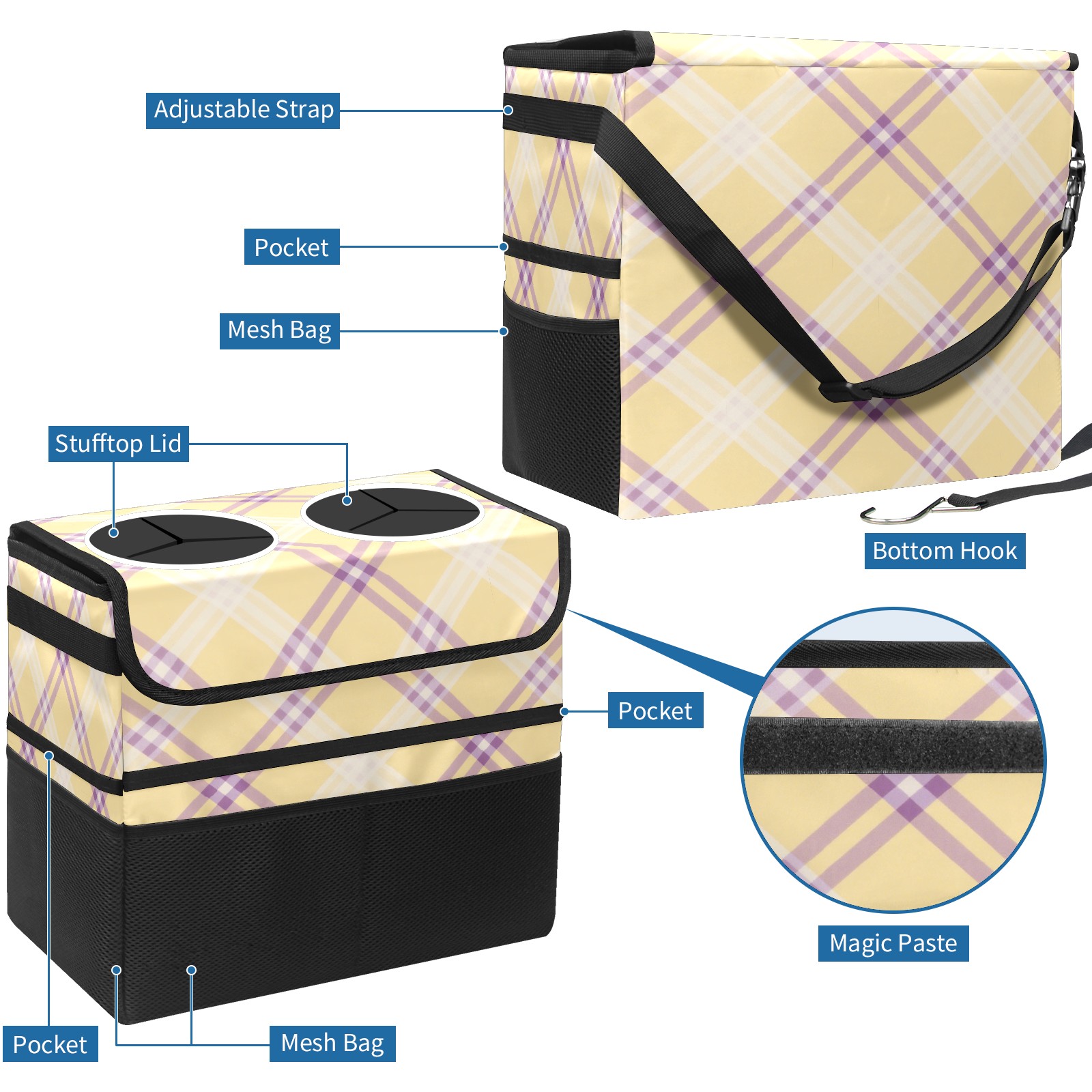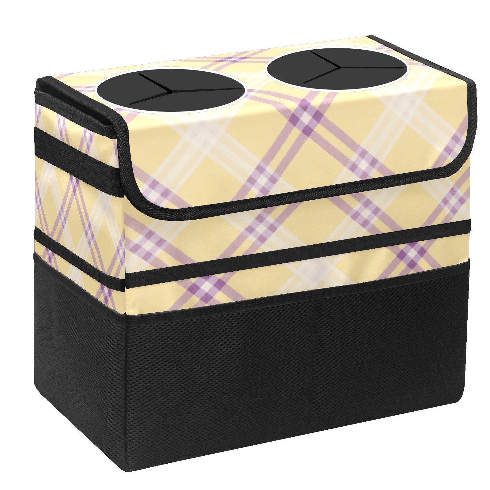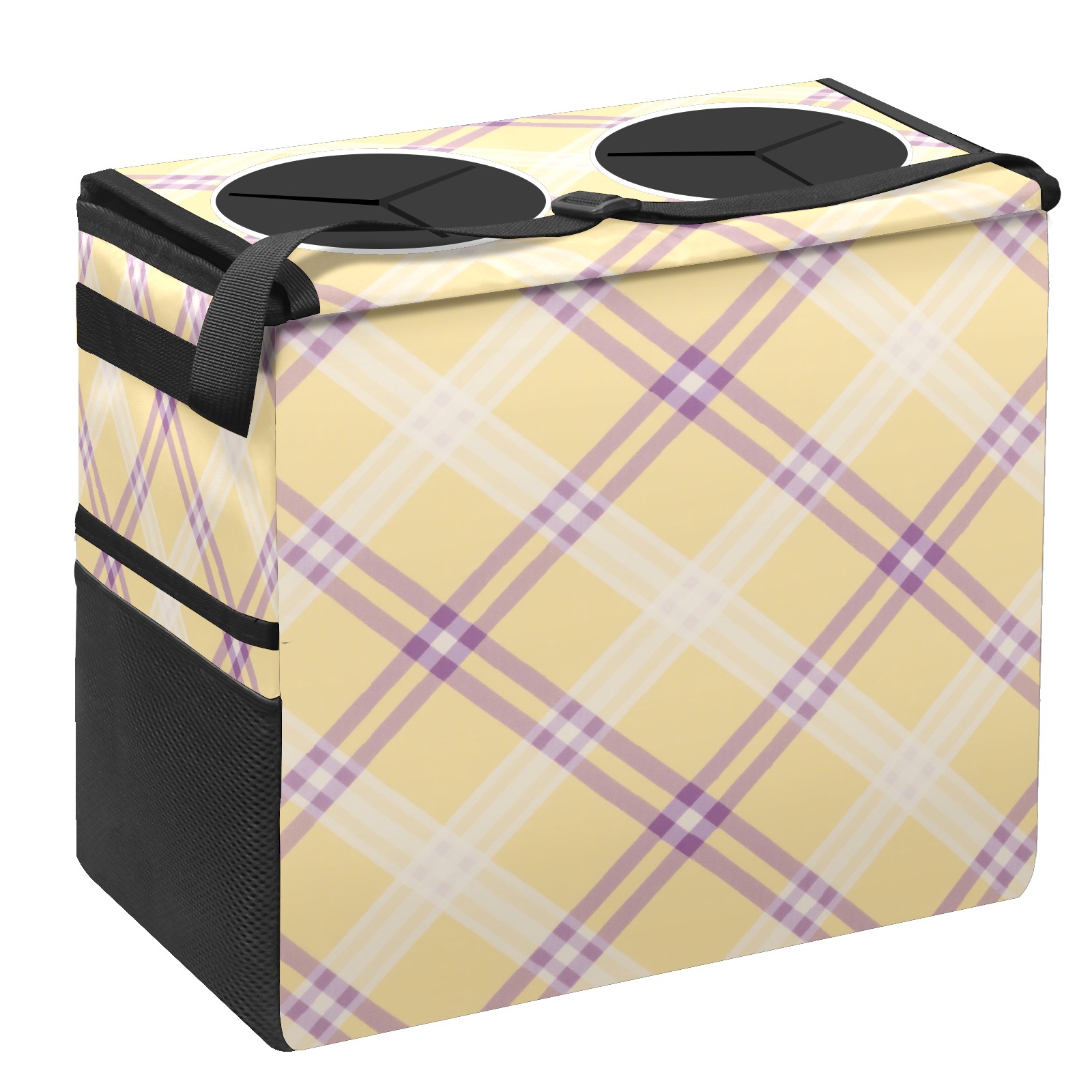 Car Trash Can with Lid, Portable Hanging Automotive Garbage Bin for Vehicles, Leakproof Waste Bag Container for SUV Truck Van Interior Auto Travel Road Trips(Yellow Purple Checkered)
