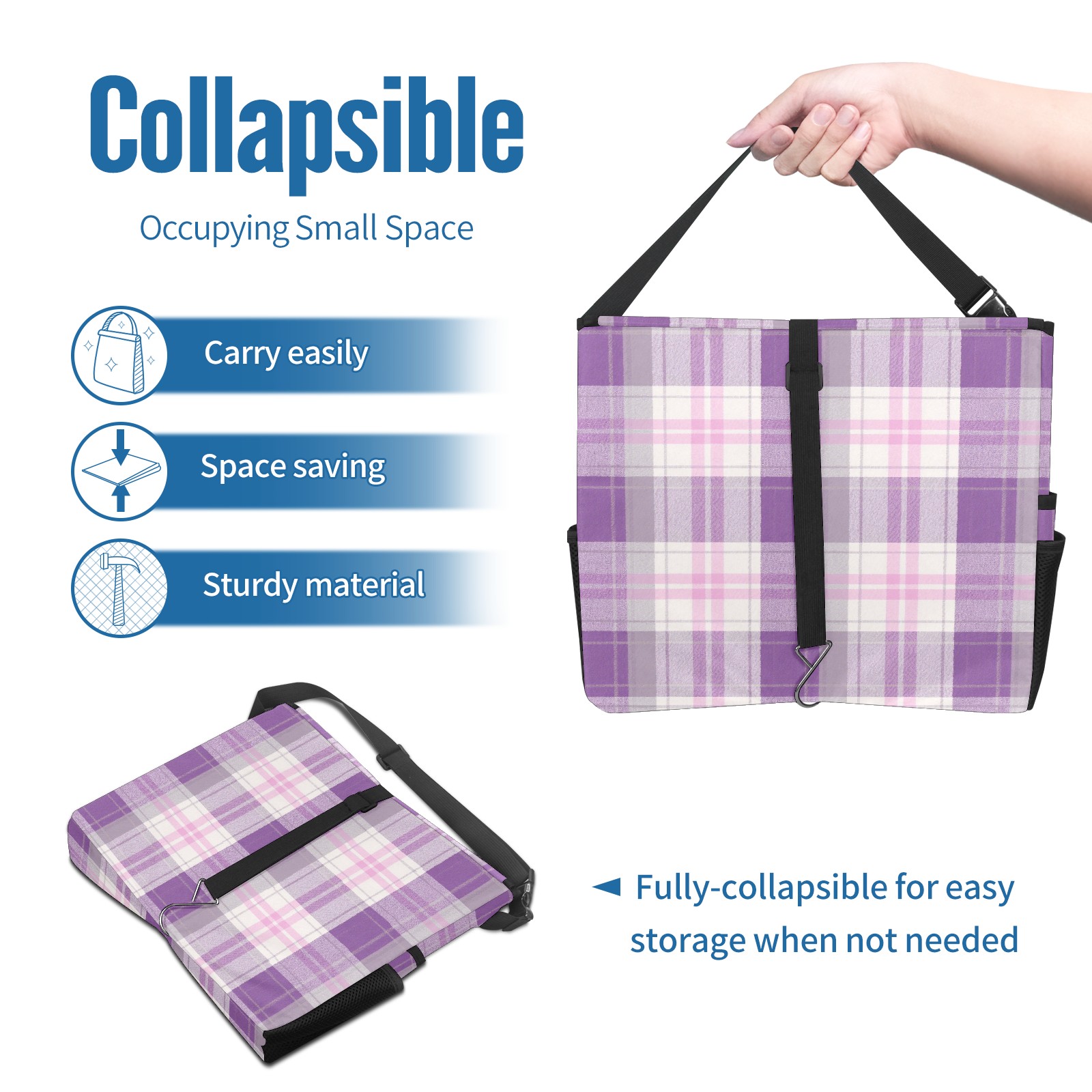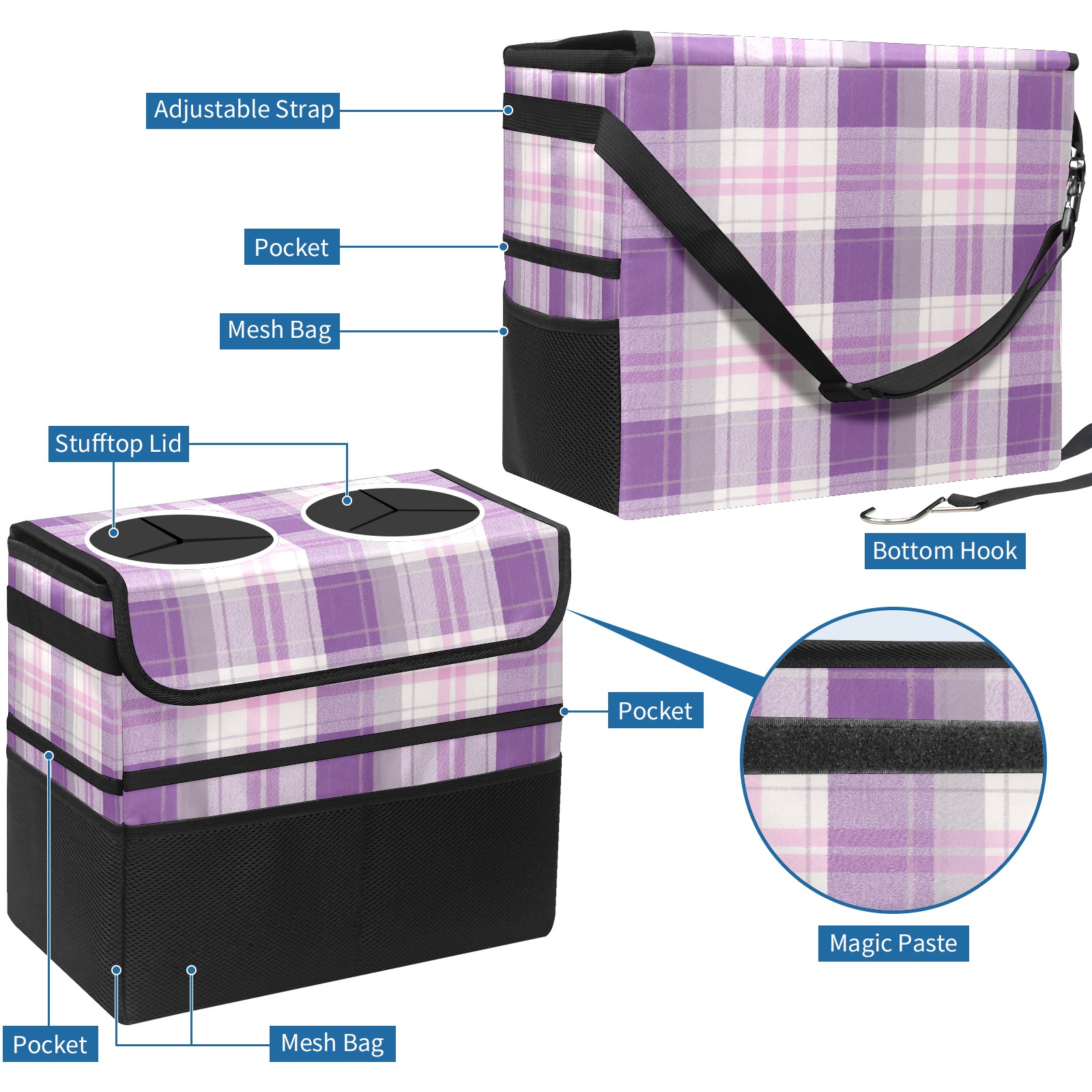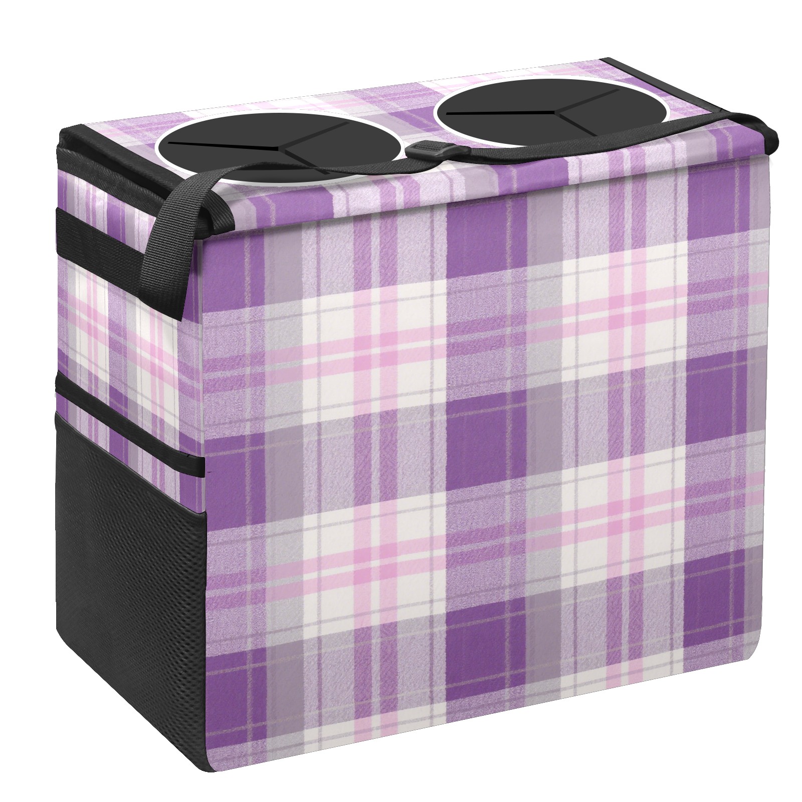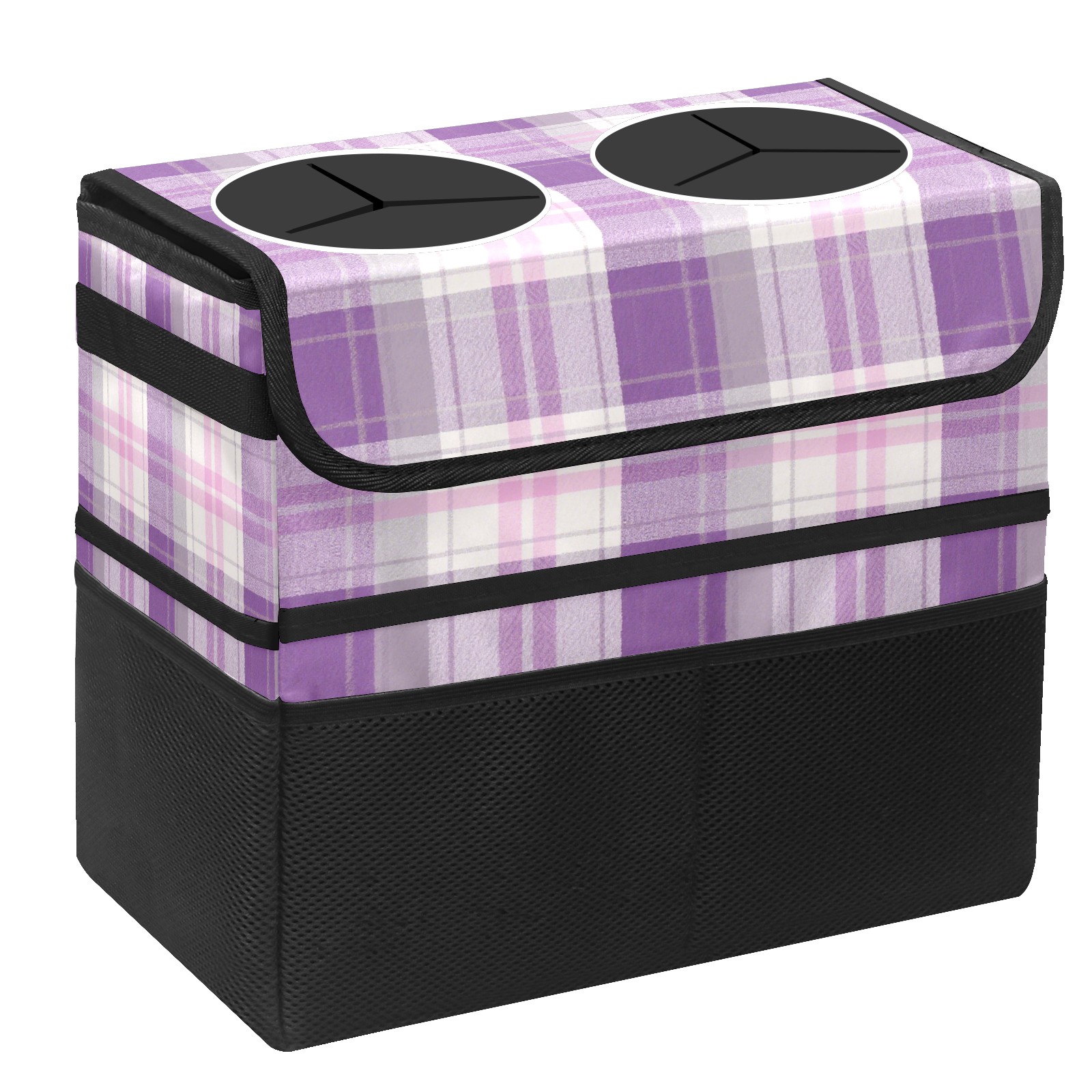 Car Trash Can with Lid, Portable Hanging Automotive Garbage Bin for Vehicles, Leakproof Waste Bag Container for SUV Truck Van Interior Auto Travel Road Trips(Purple And White Checkered)