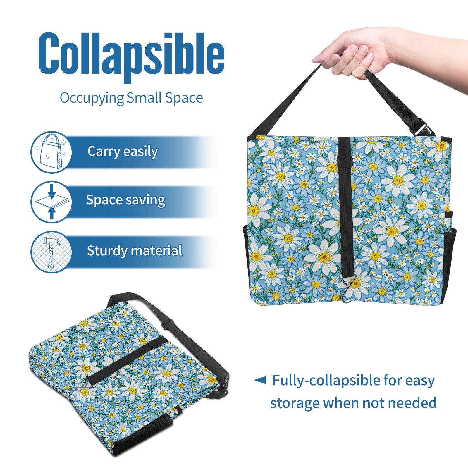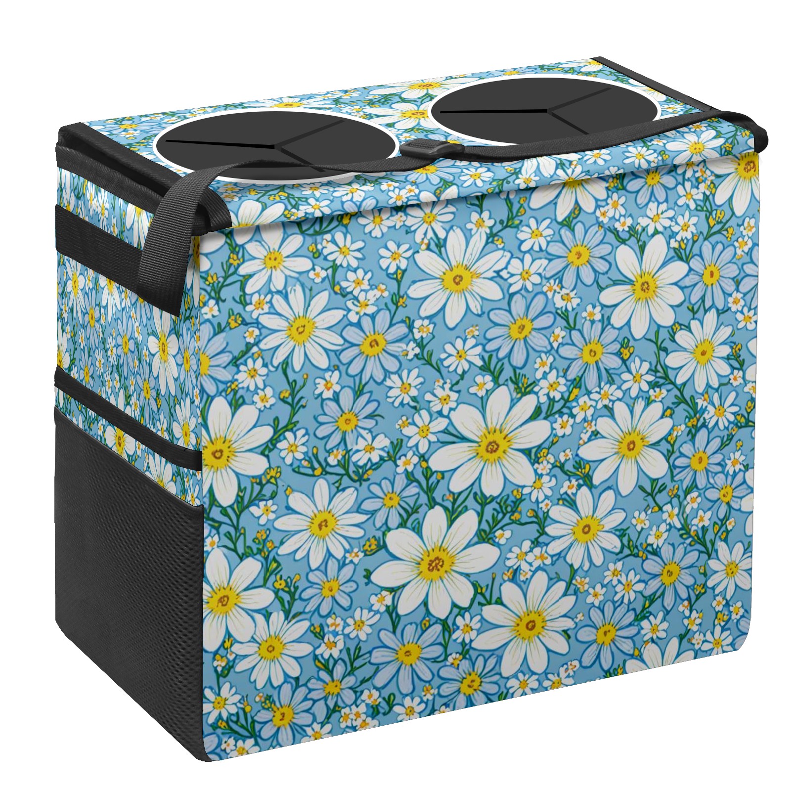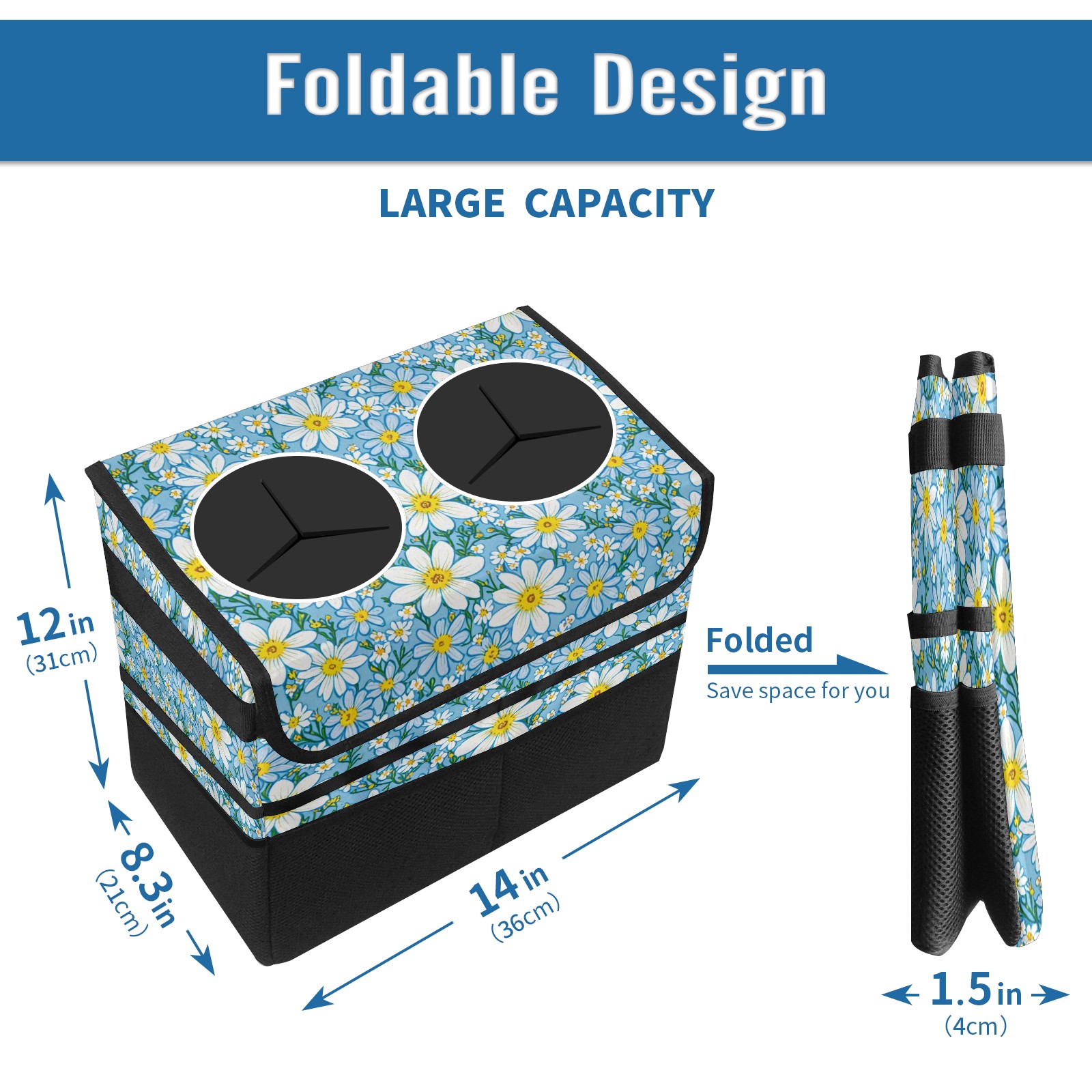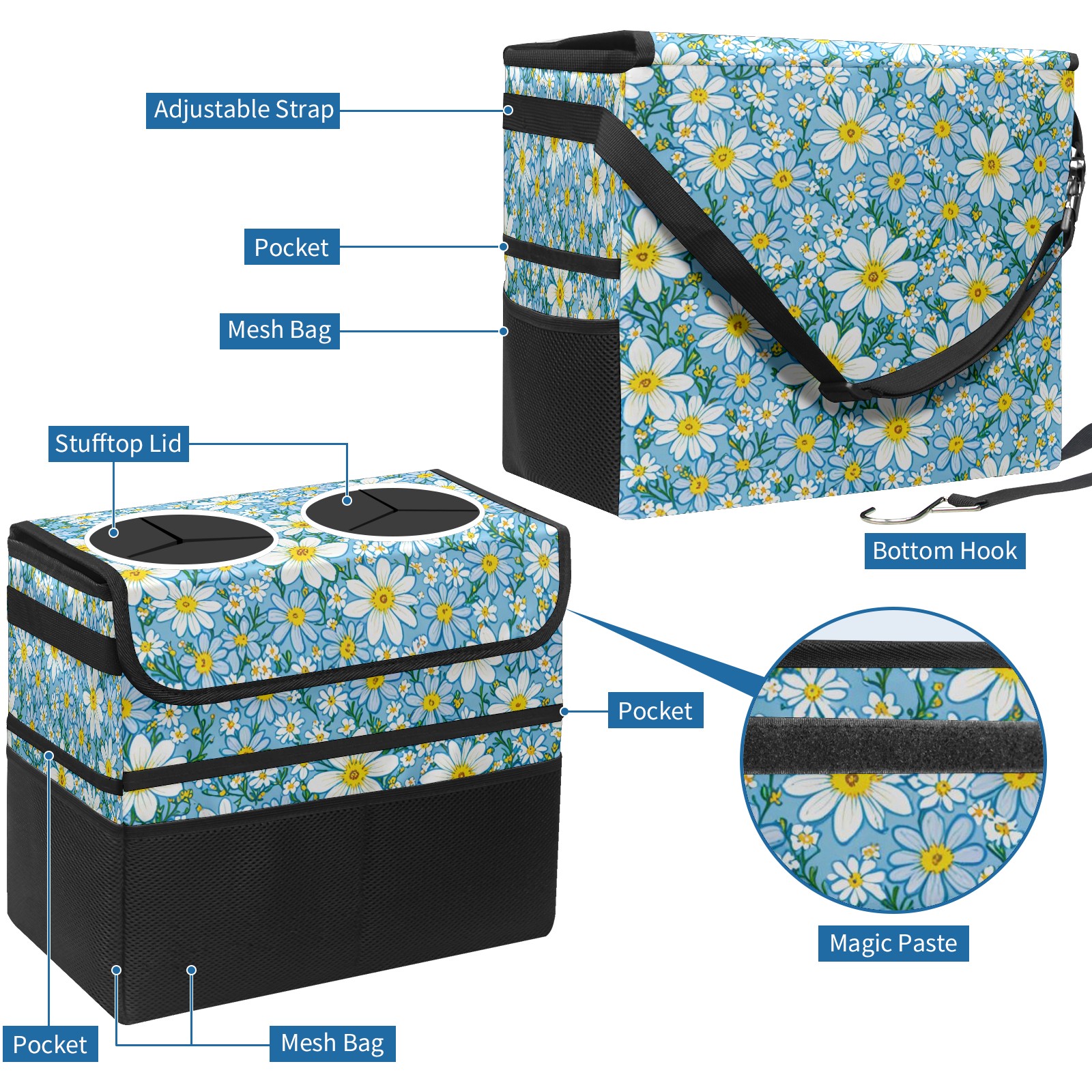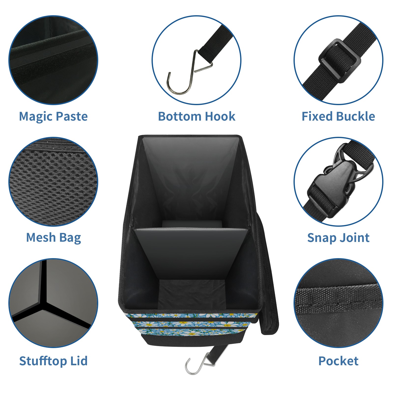 Car Trash Can with Lid, Portable Hanging Automotive Garbage Bin for Vehicles, Leakproof Waste Bag Container for SUV Truck Van Interior Auto Travel Road Trips(Blue White Floral)