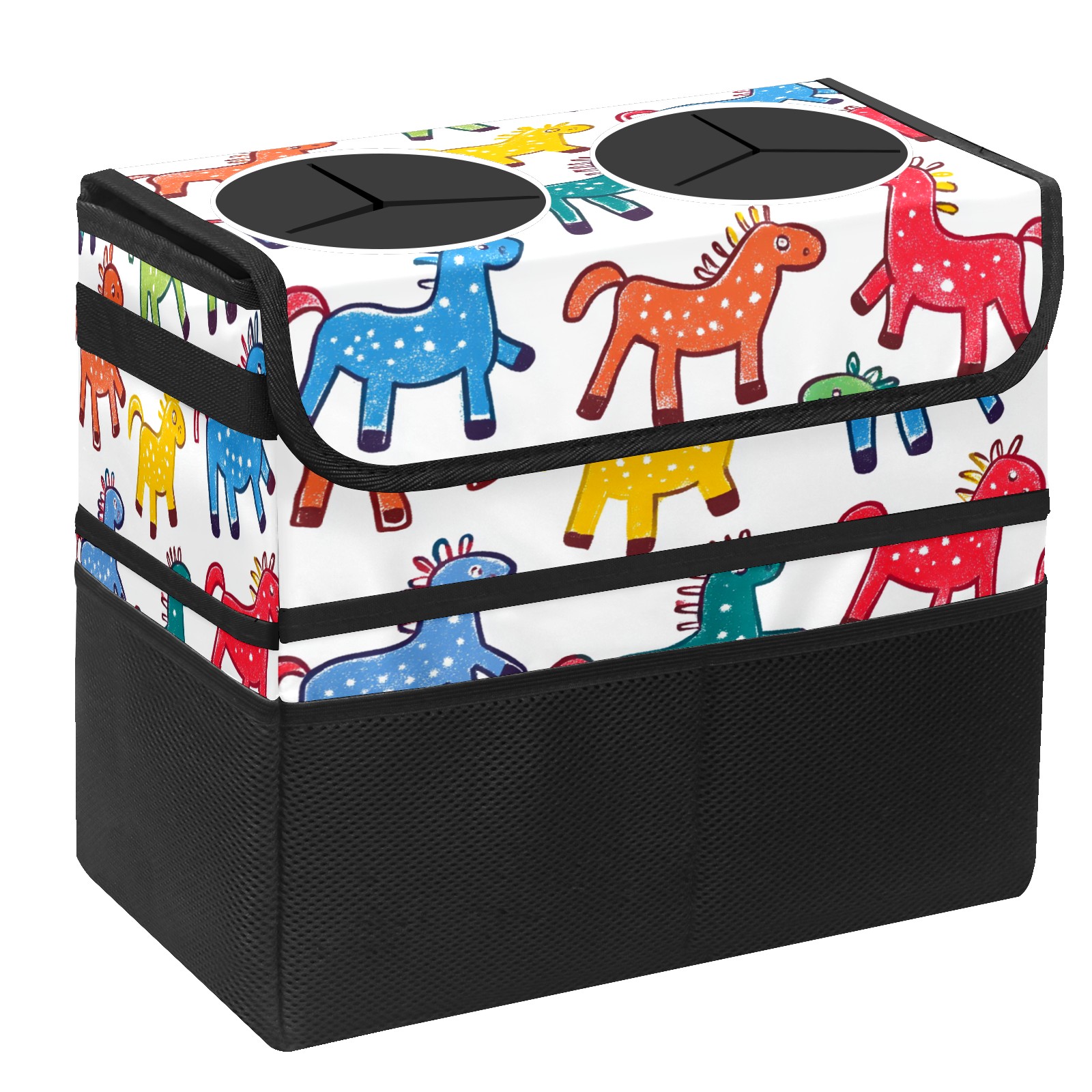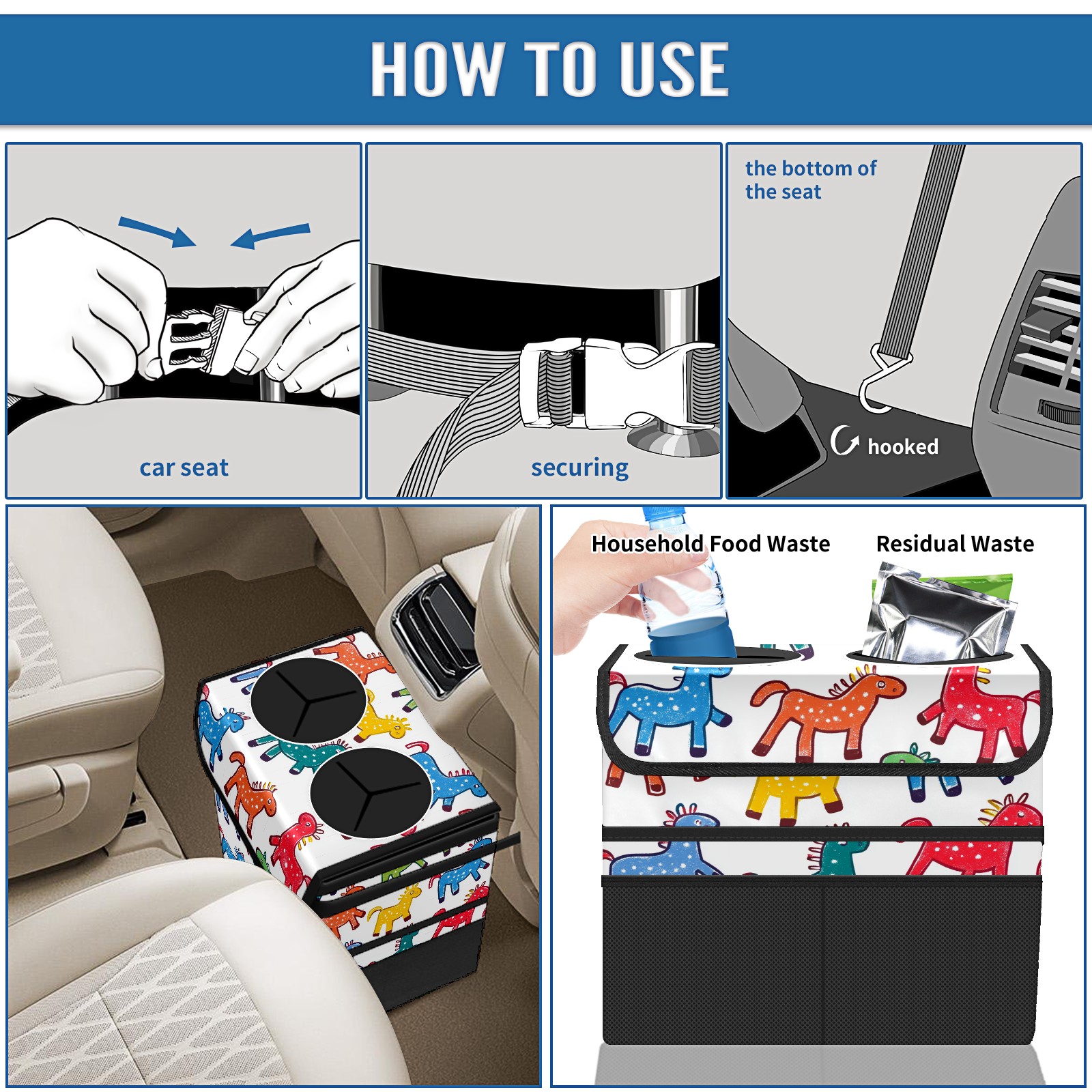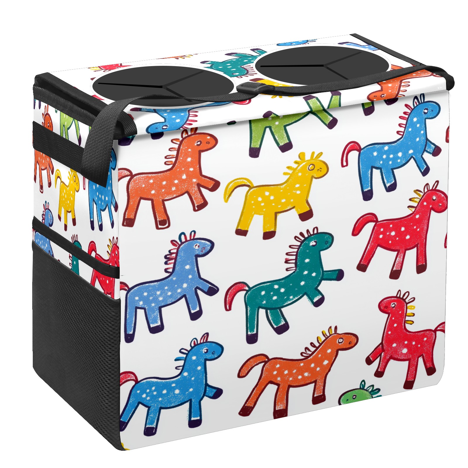 Car Trash Can with Lid, Portable Hanging Automotive Garbage Bin for Vehicles, Leakproof Waste Bag Container for SUV Truck Van Interior Auto Travel Road Trips(Colorful Stick Horses)