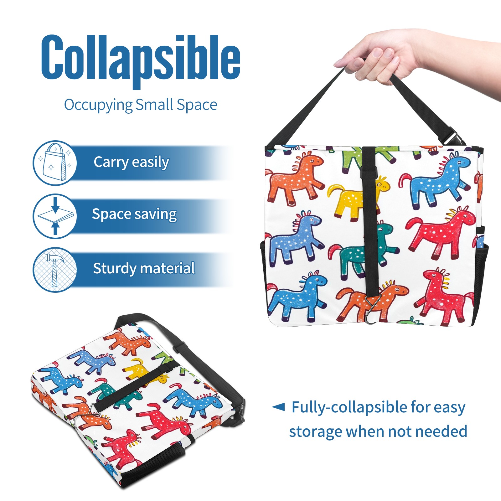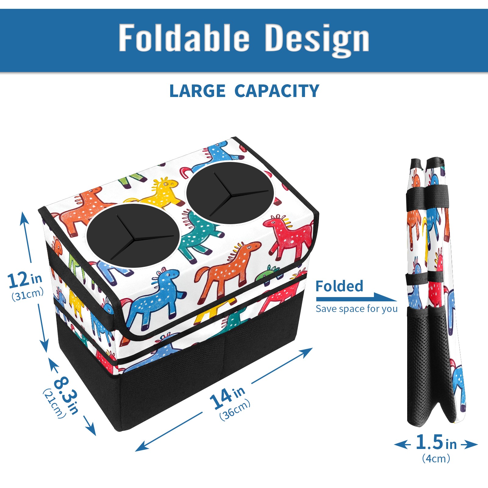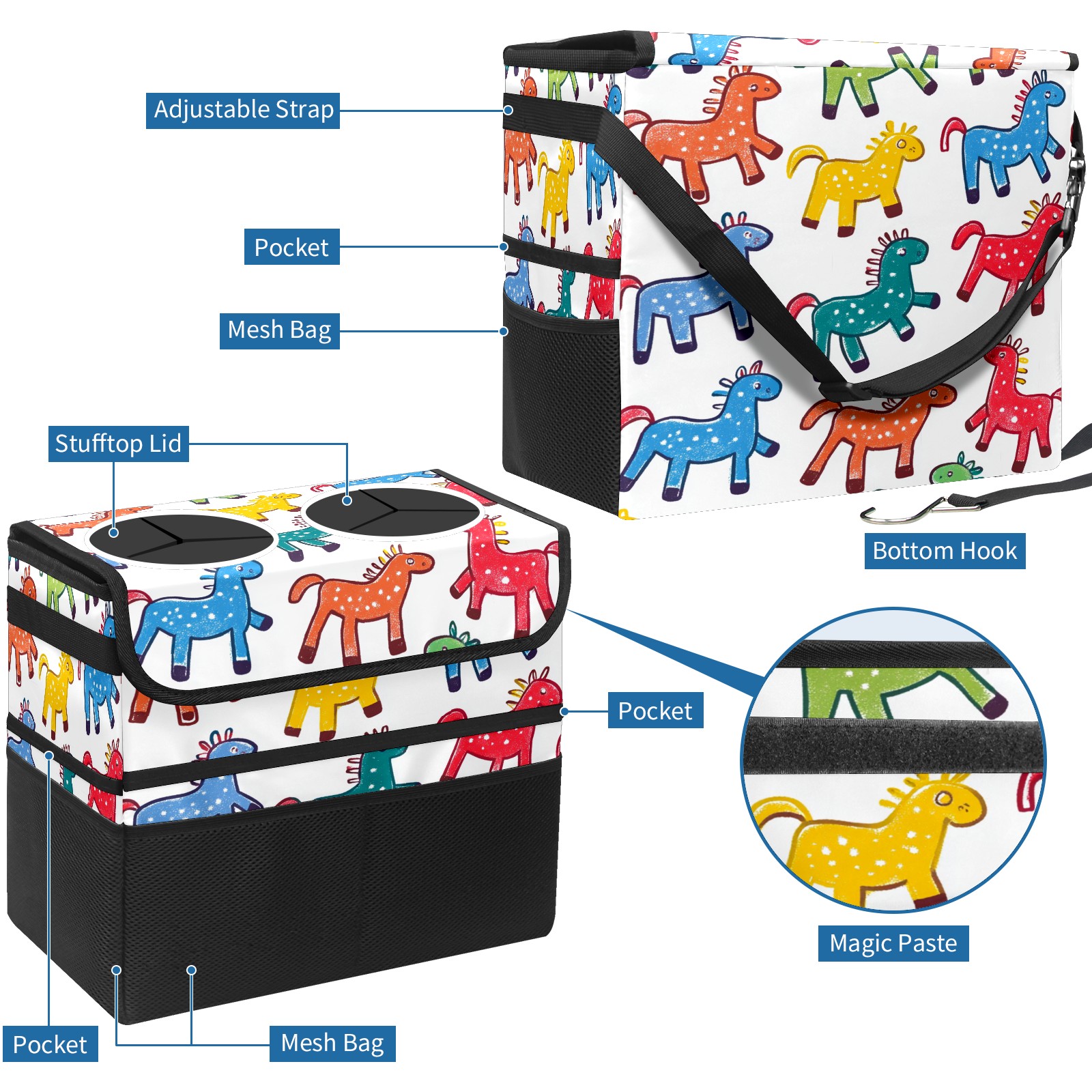 Car Trash Can with Lid, Portable Hanging Automotive Garbage Bin for Vehicles, Leakproof Waste Bag Container for SUV Truck Van Interior Auto Travel Road Trips(Colorful Stick Horses)