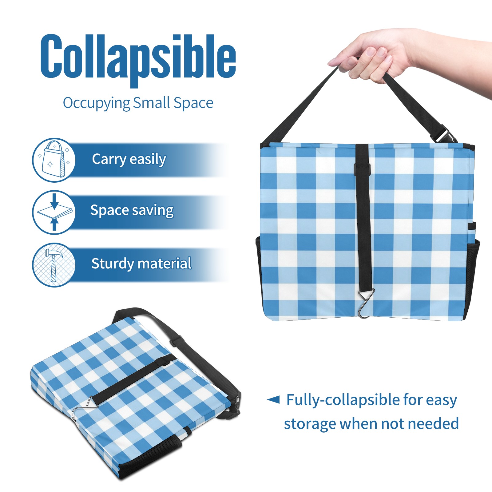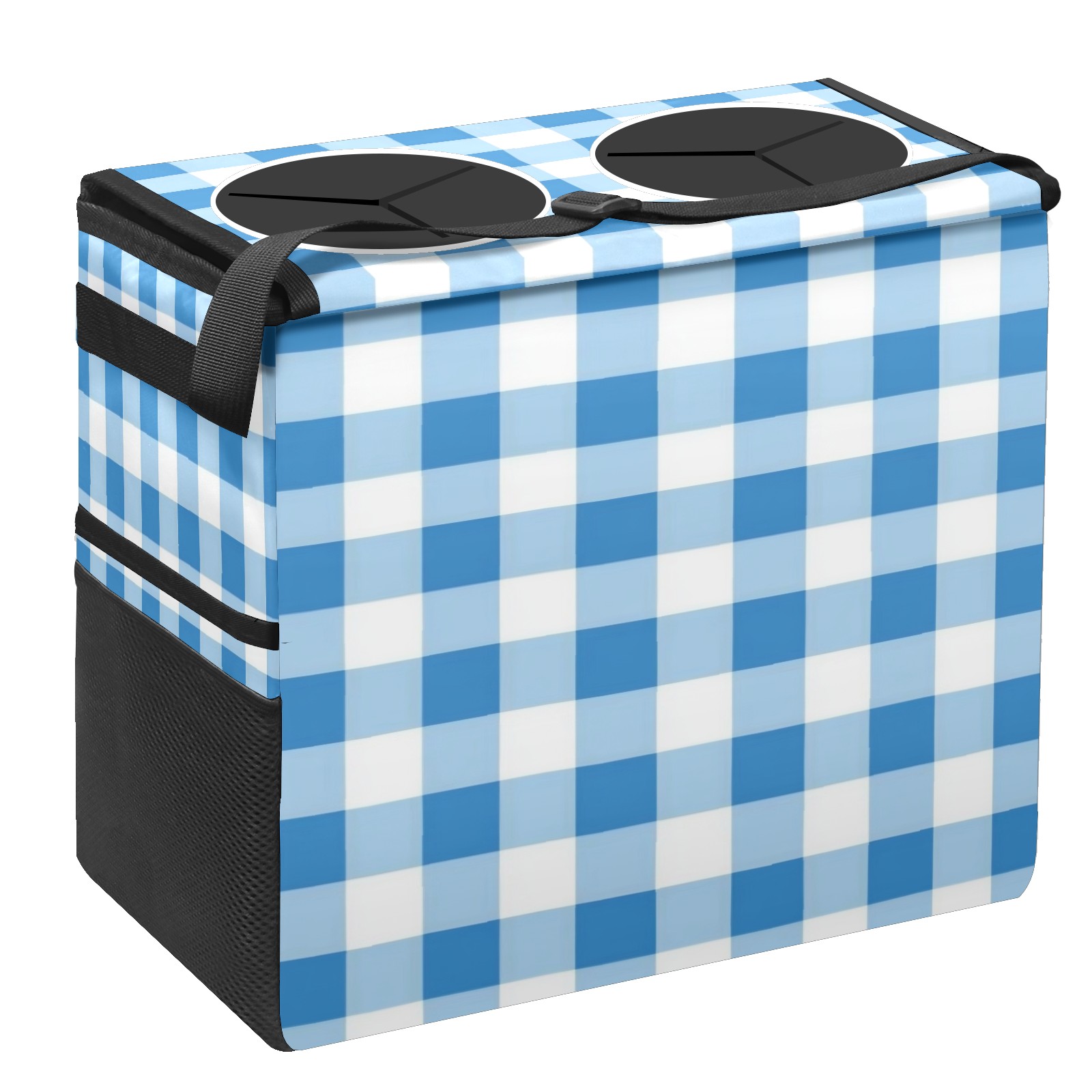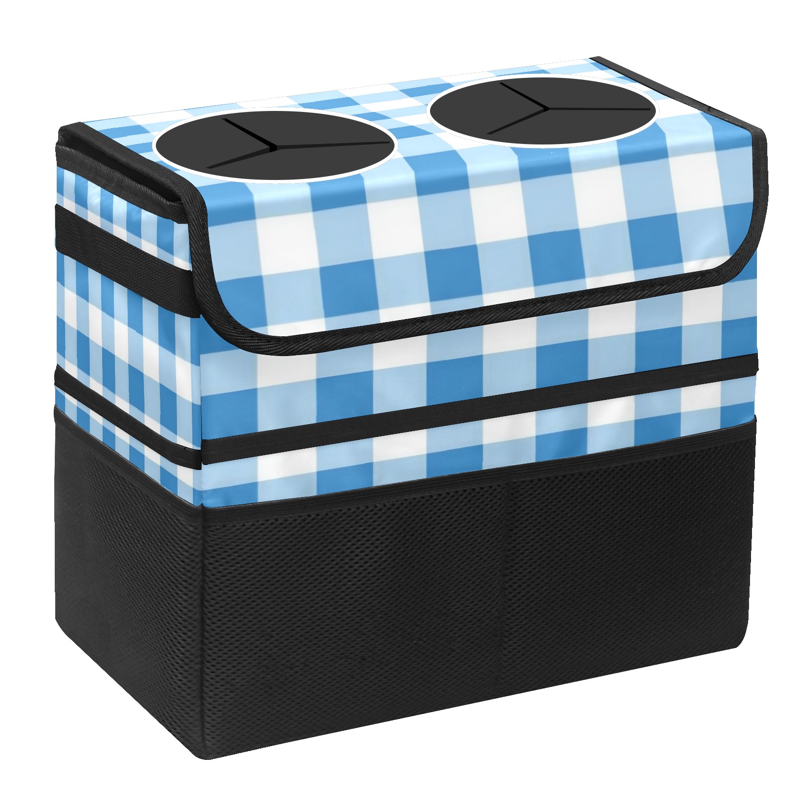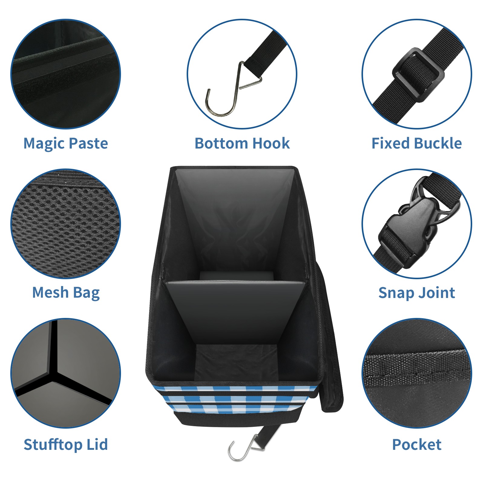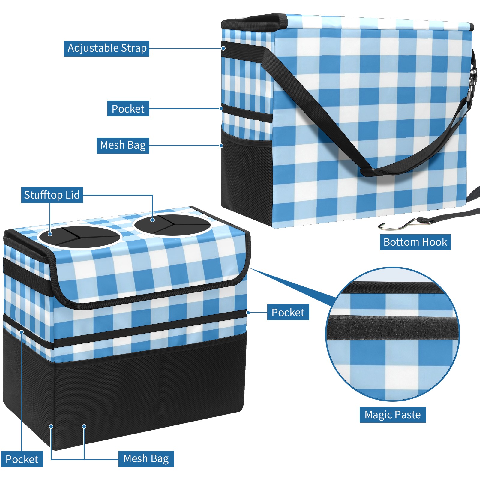 Car Trash Can with Lid, Portable Hanging Automotive Garbage Bin for Vehicles, Leakproof Waste Bag Container for SUV Truck Van Interior Auto Travel Road Trips(Light Blue Gingham)