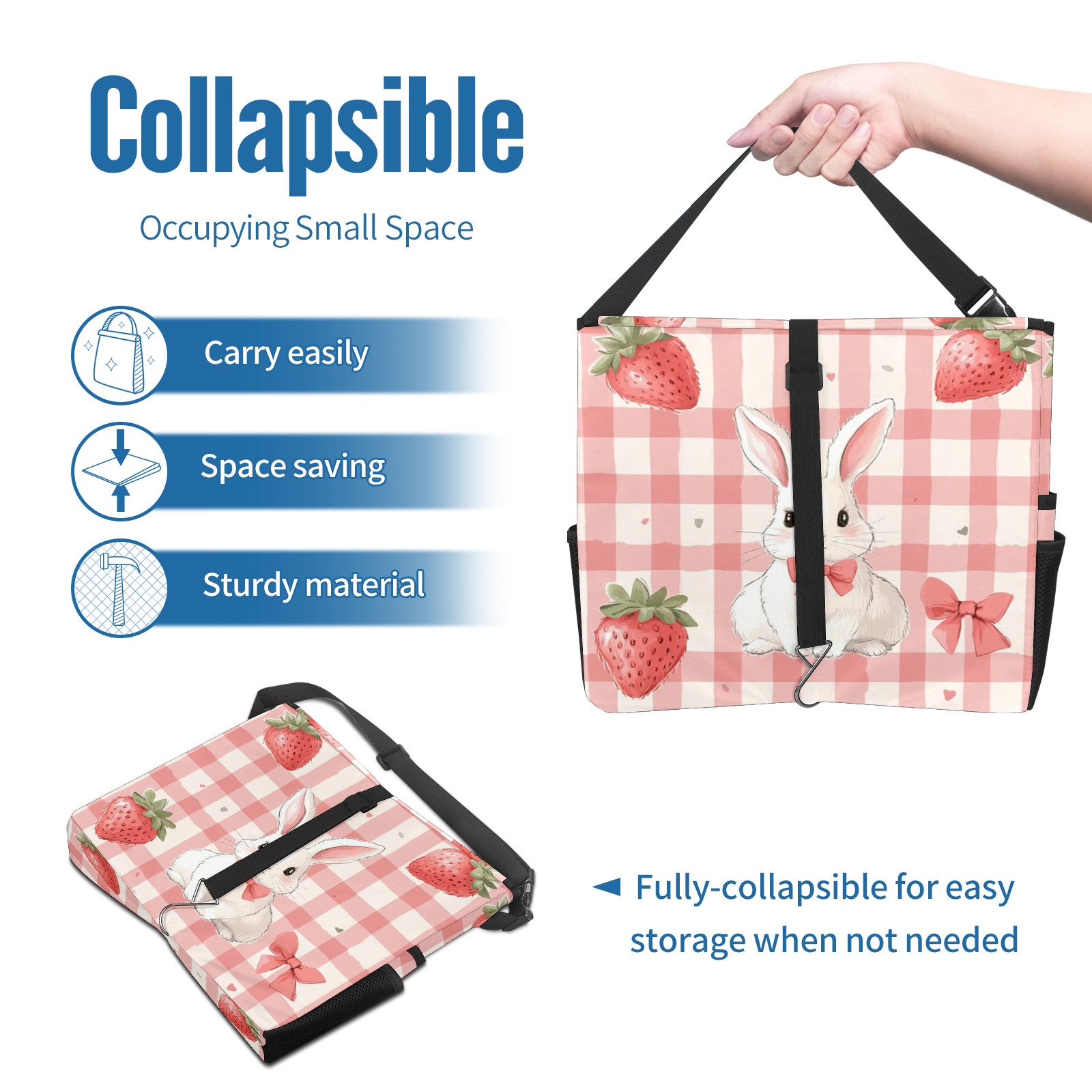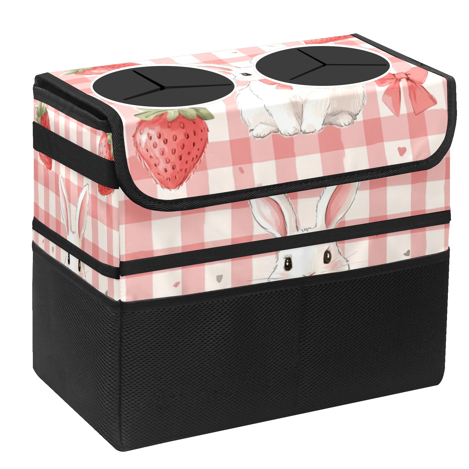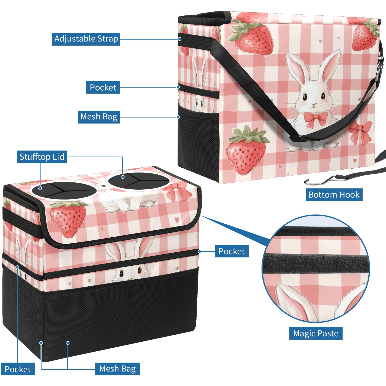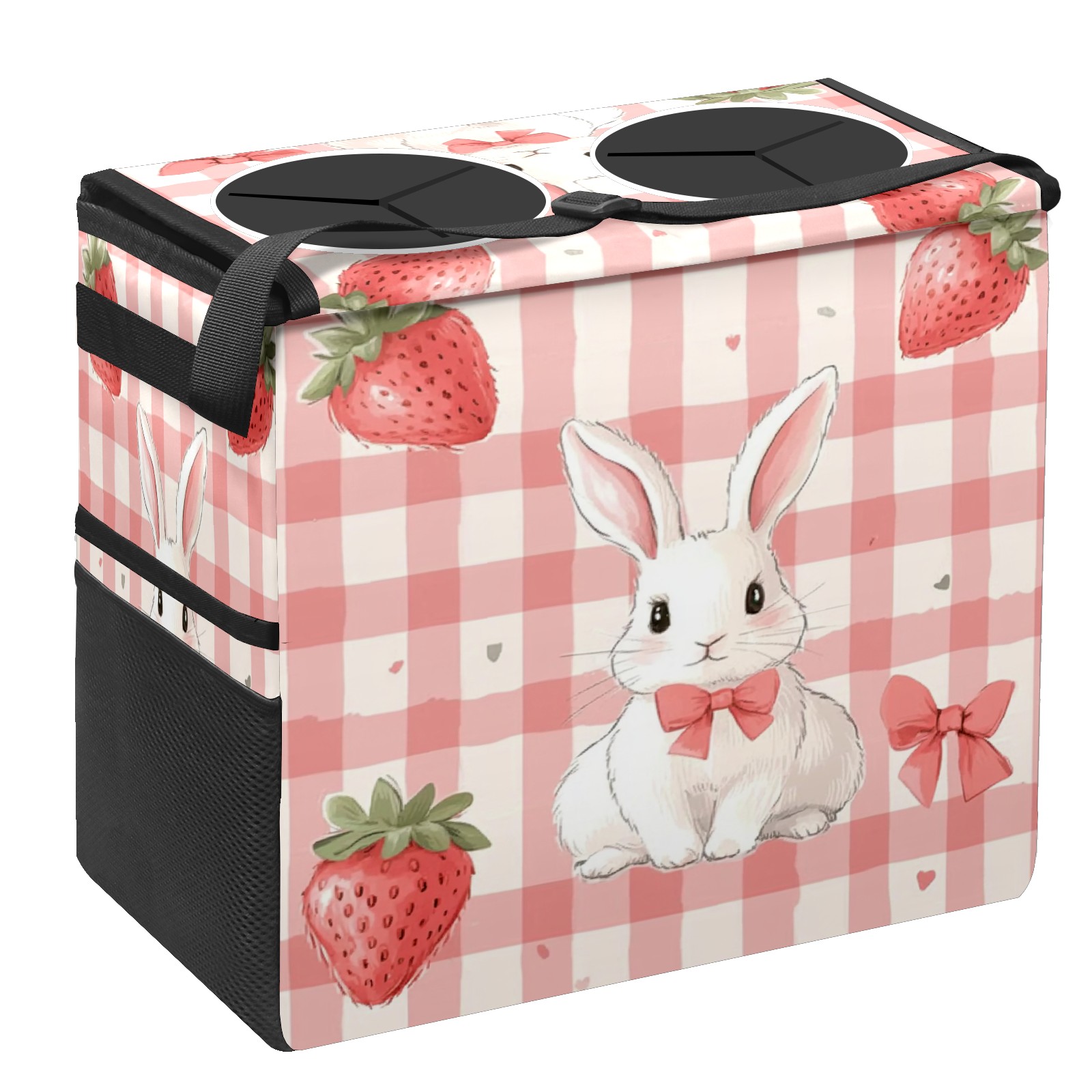 Car Trash Can with Lid, Portable Hanging Automotive Garbage Bin for Vehicles, Leakproof Waste Bag Container for SUV Truck Van Interior Auto Travel Road Trips(Pink Gingham With White Rabbit)