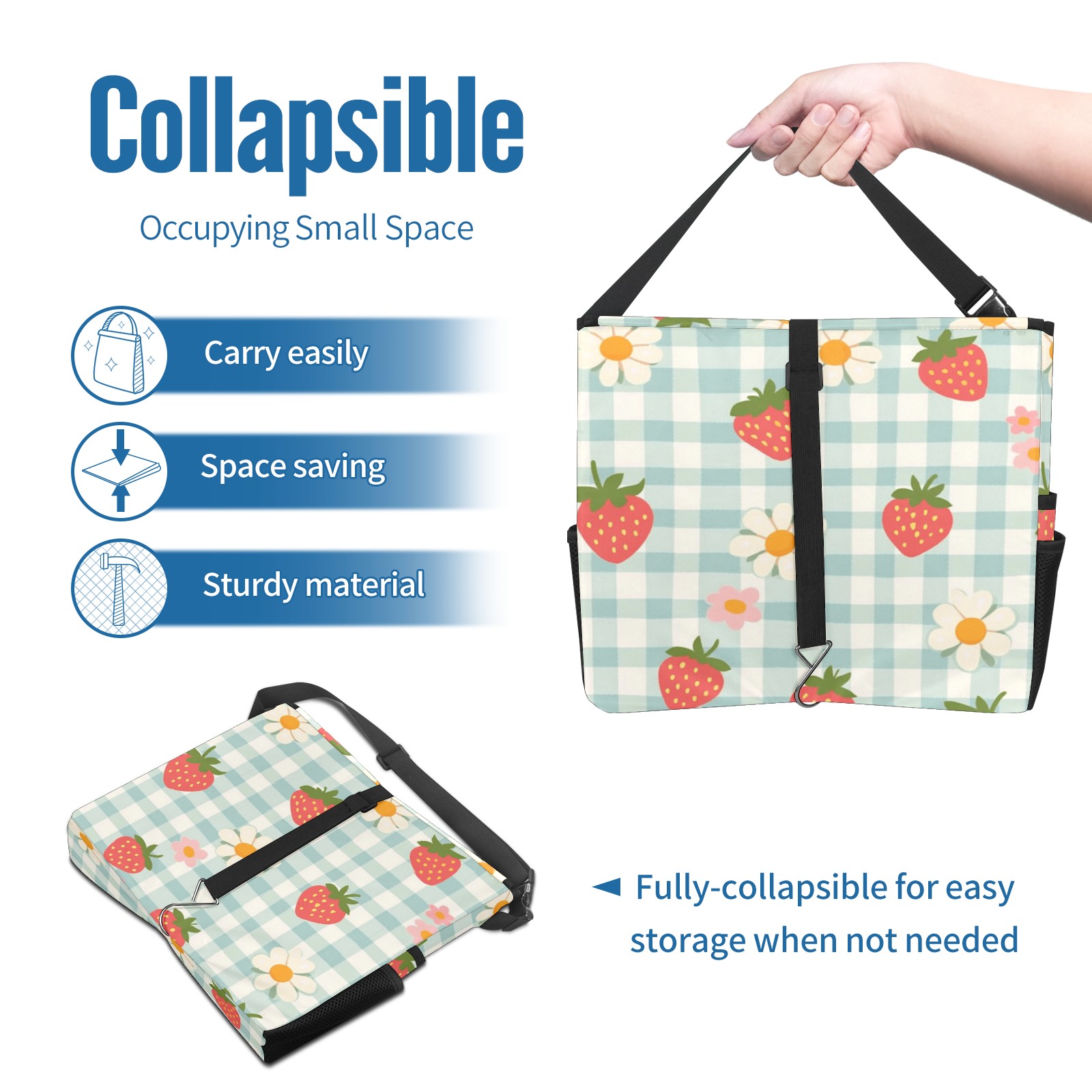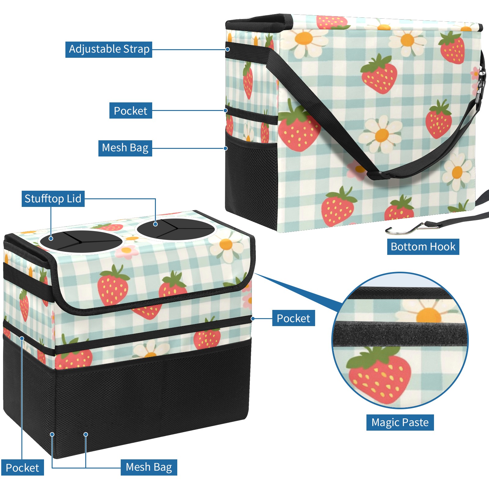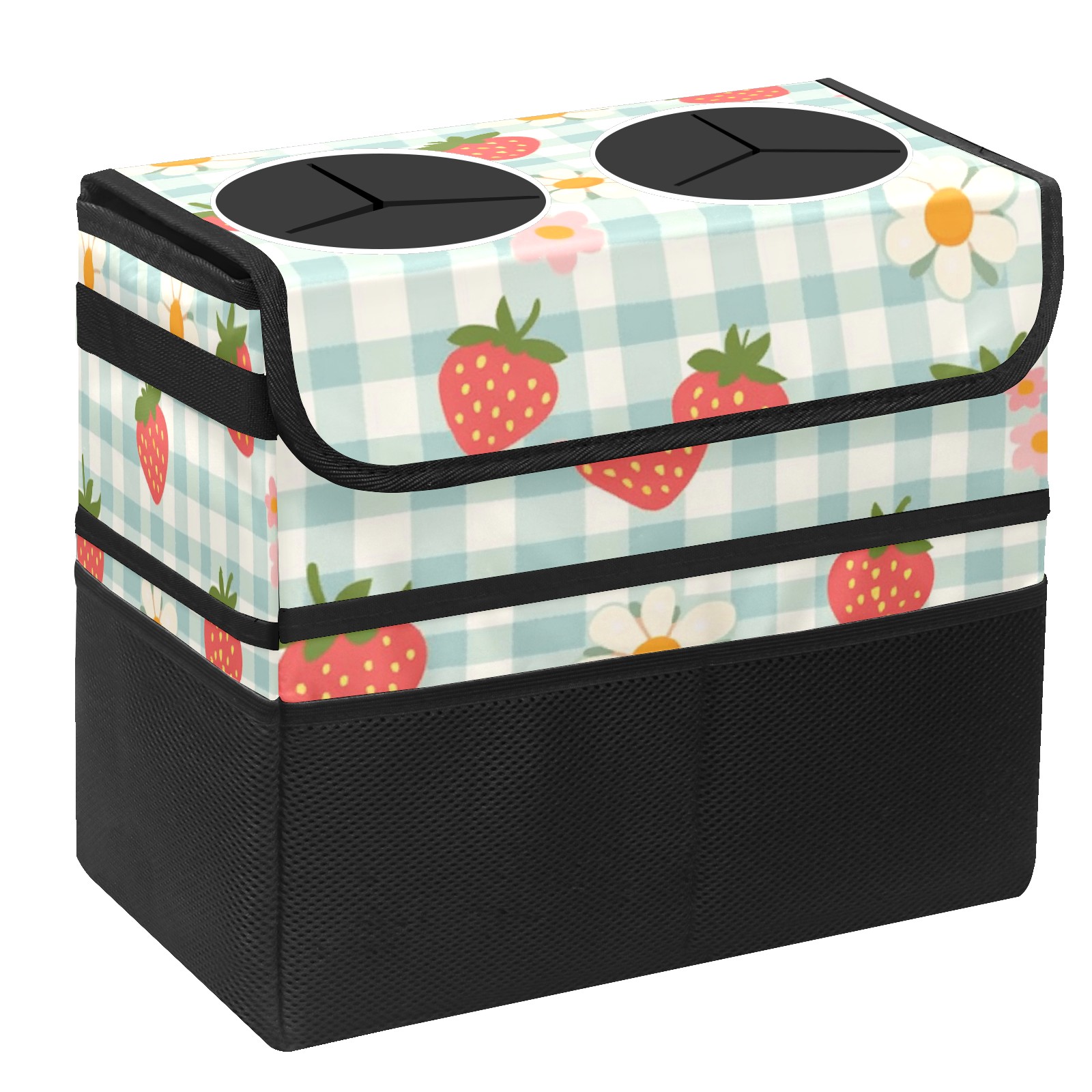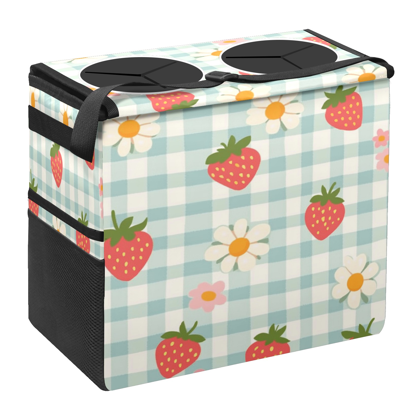 Car Trash Can with Lid, Portable Hanging Automotive Garbage Bin for Vehicles, Leakproof Waste Bag Container for SUV Truck Van Interior Auto Travel Road Trips(Strawberries And Daisies)