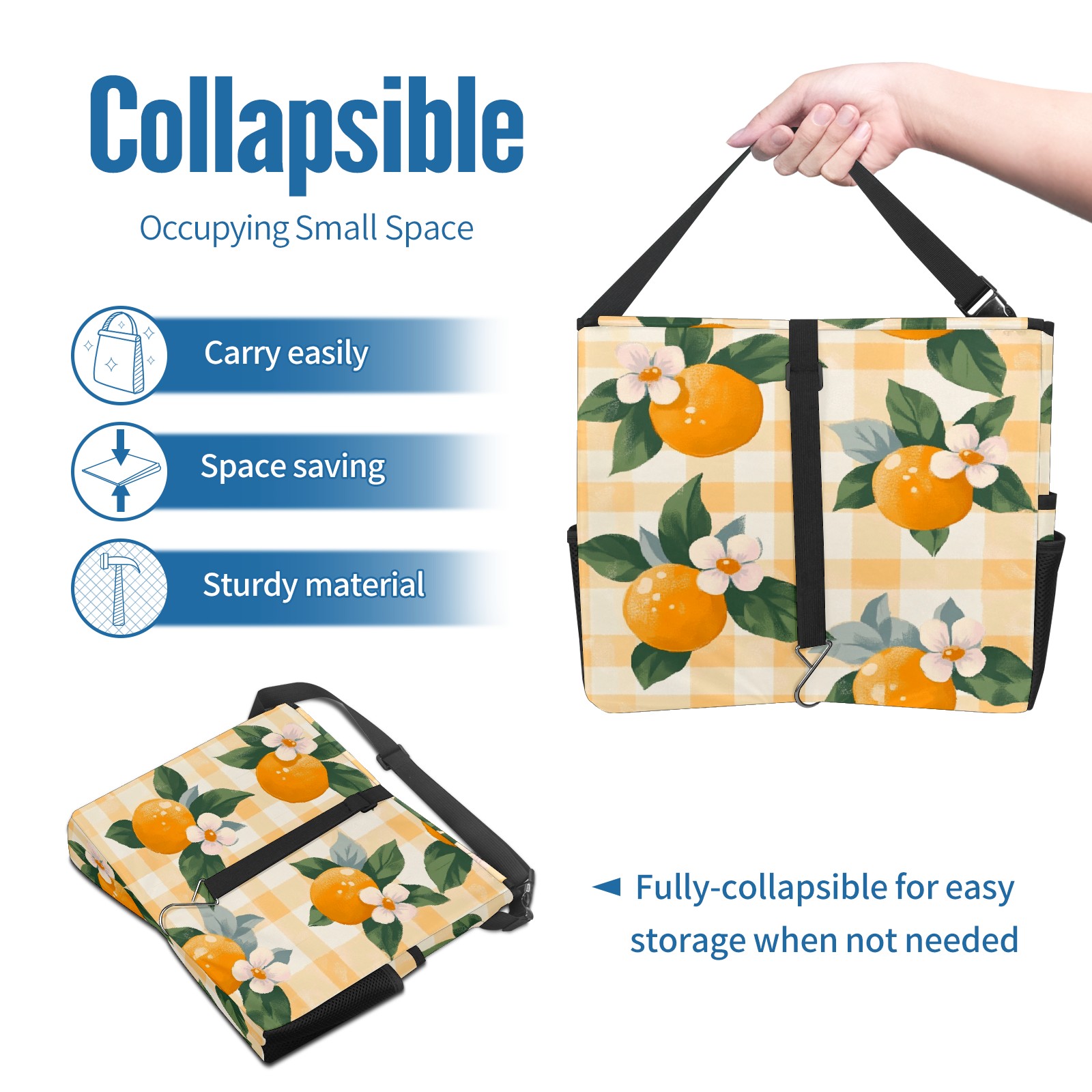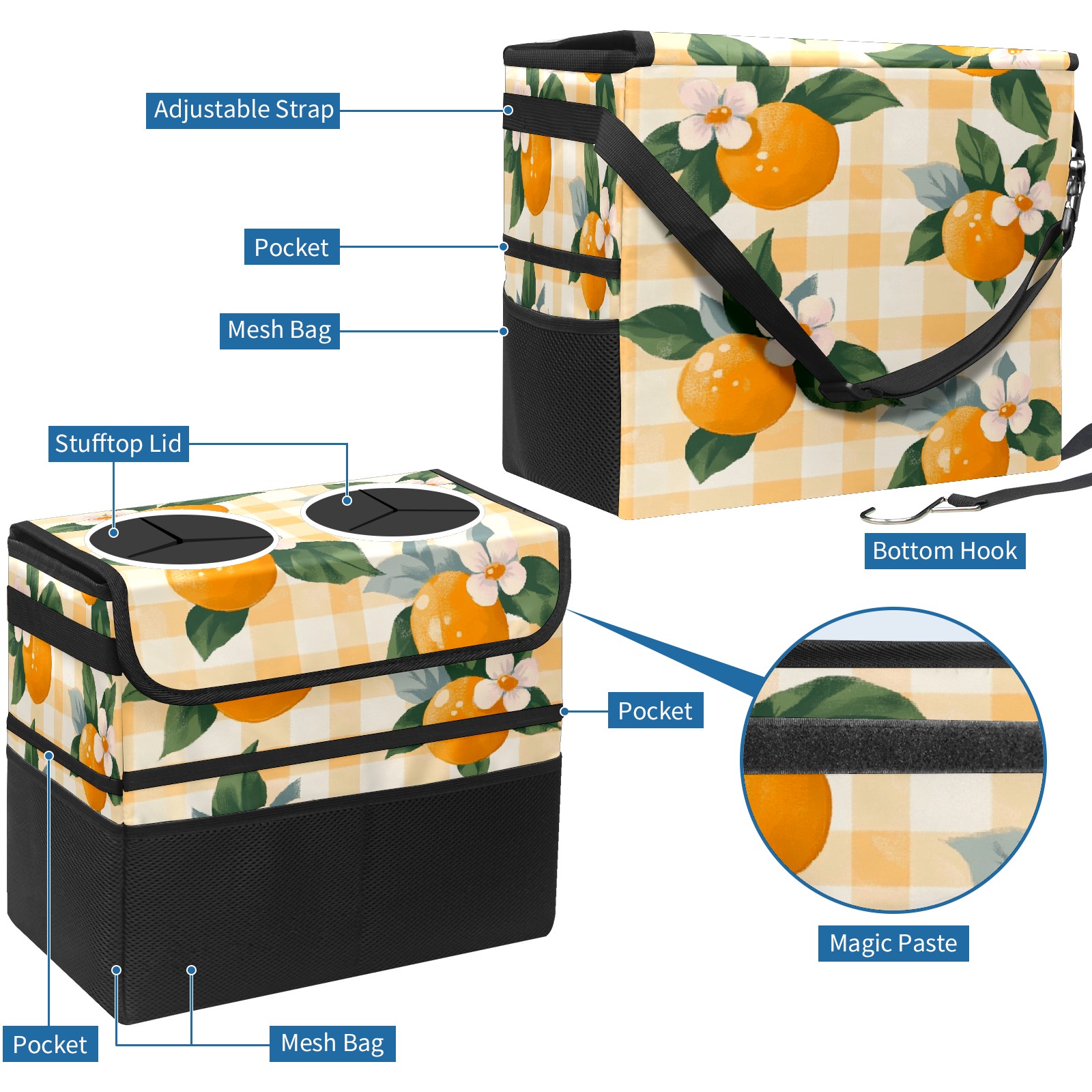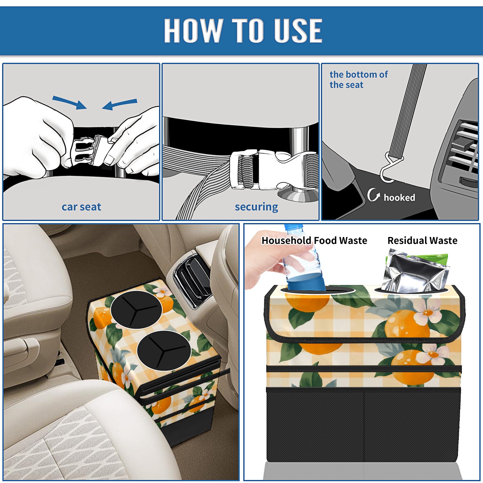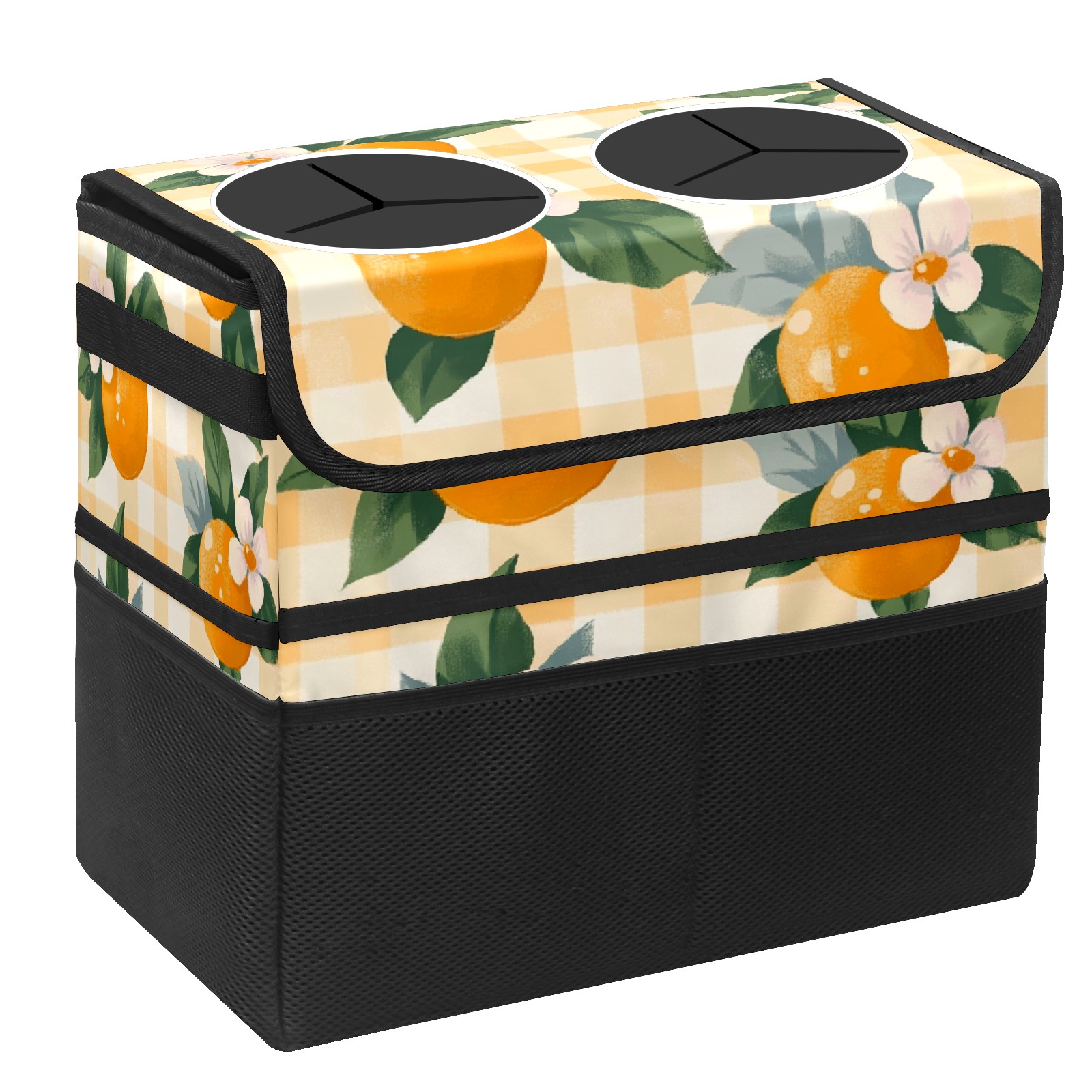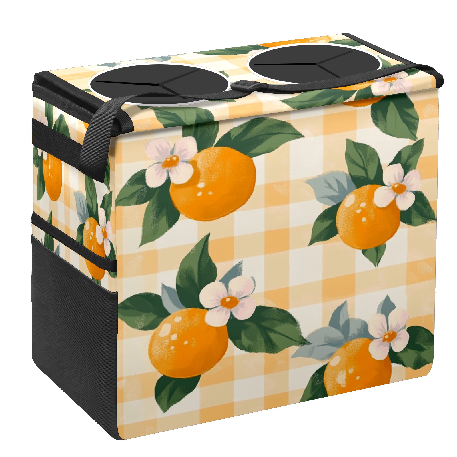 Car Trash Can with Lid, Portable Hanging Automotive Garbage Bin for Vehicles, Leakproof Waste Bag Container for SUV Truck Van Interior Auto Travel Road Trips(Oranges And Flowers)