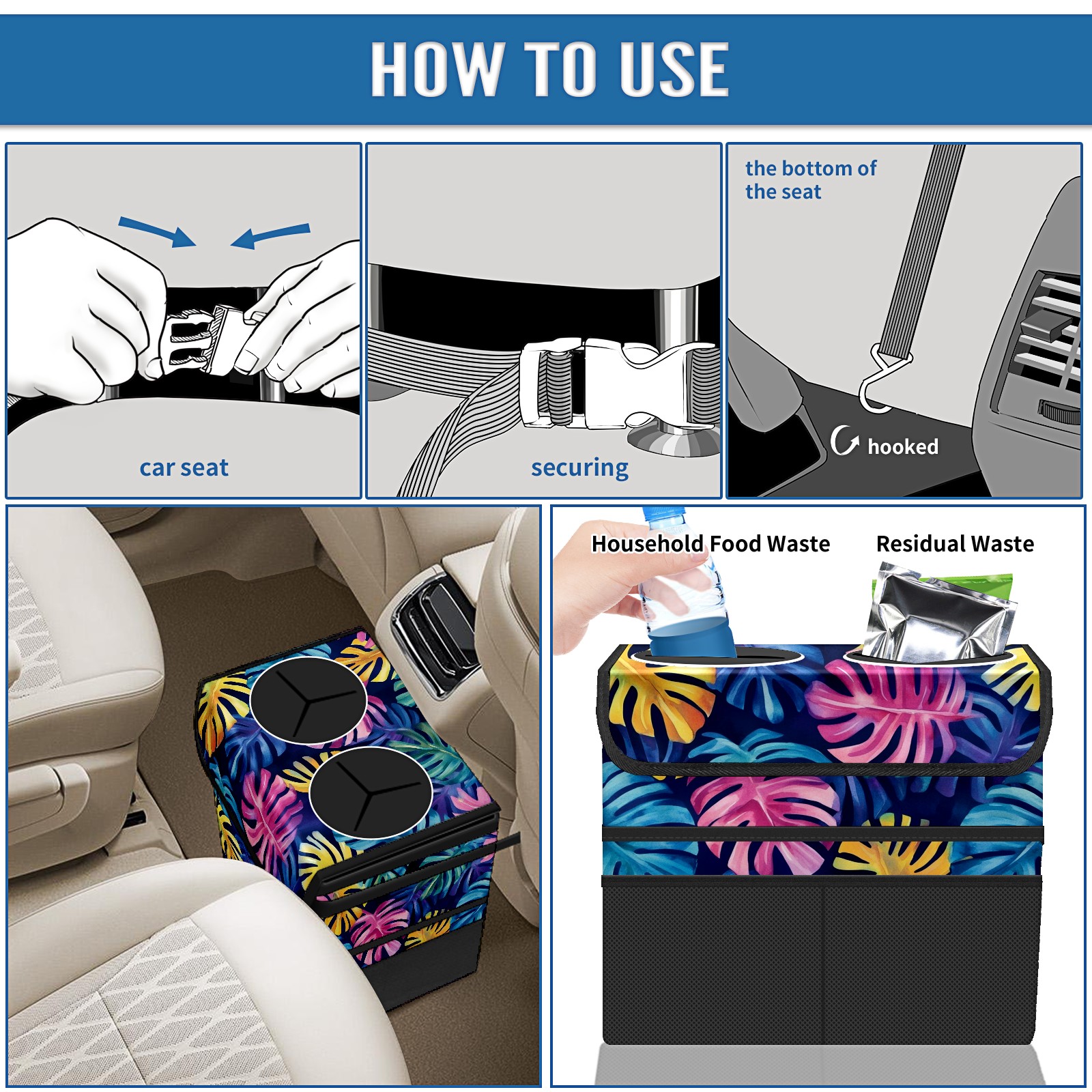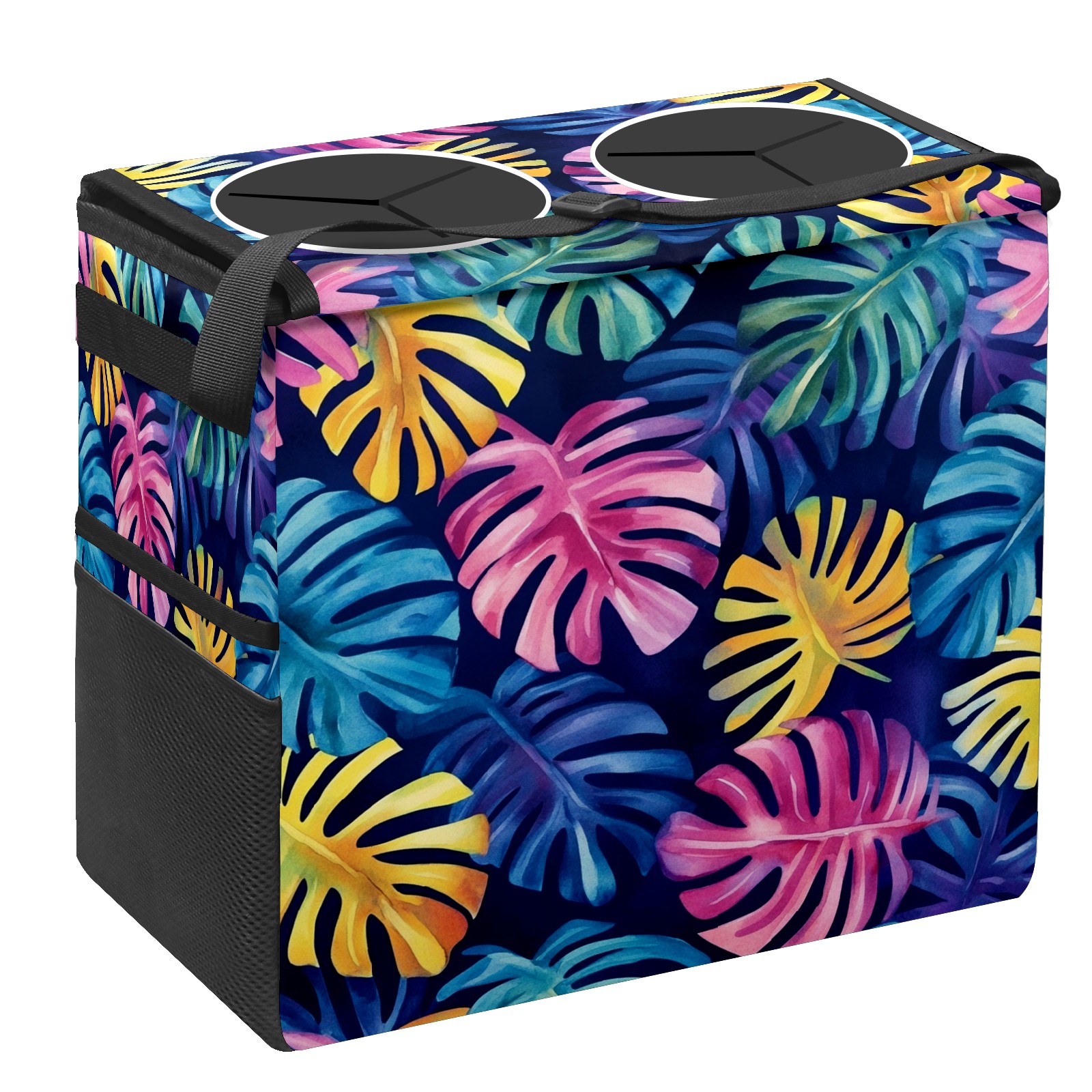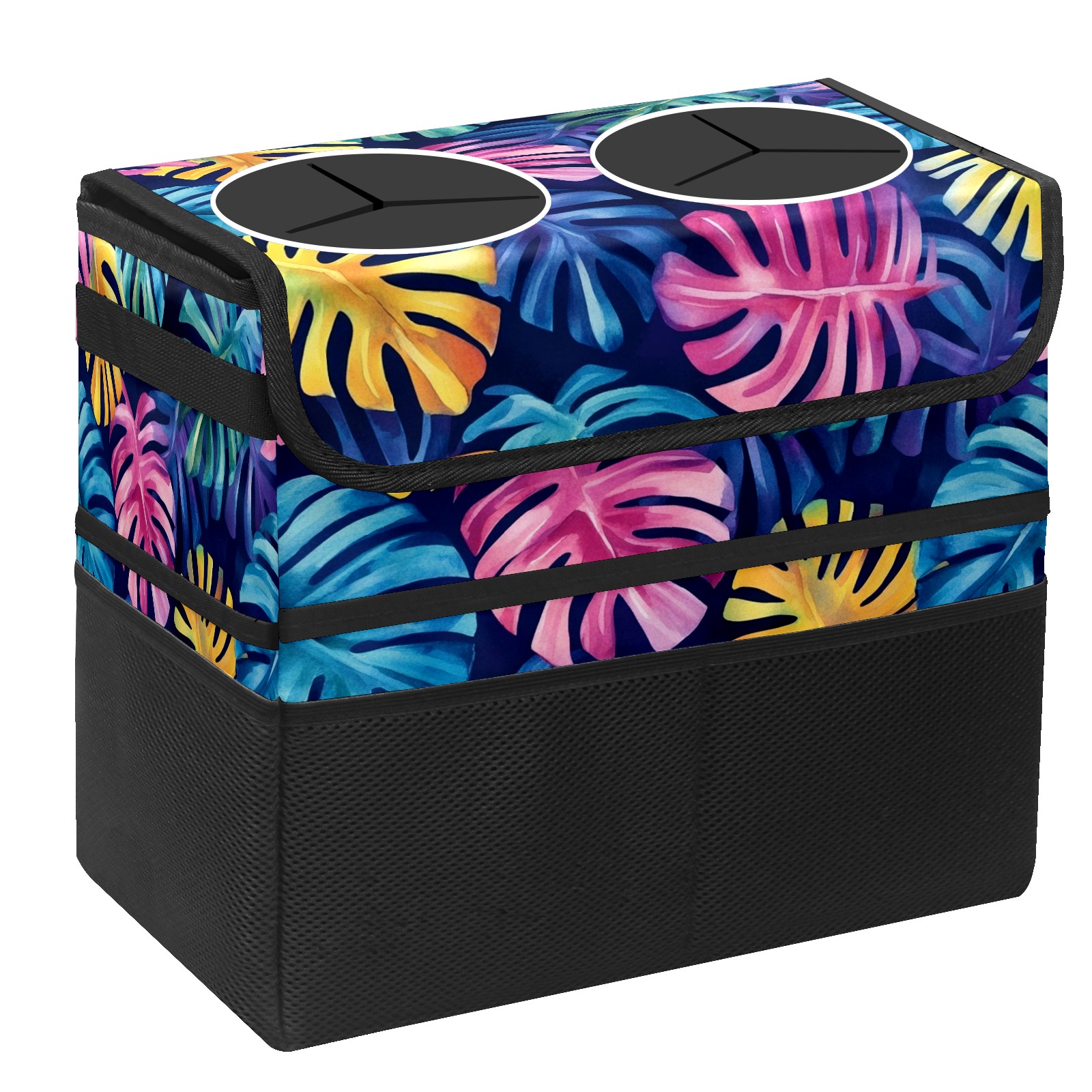 Car Trash Can with Lid, Portable Hanging Automotive Garbage Bin for Vehicles, Leakproof Waste Bag Container for SUV Truck Van Interior Auto Travel Road Trips(Watercolor Tropical Leaves)