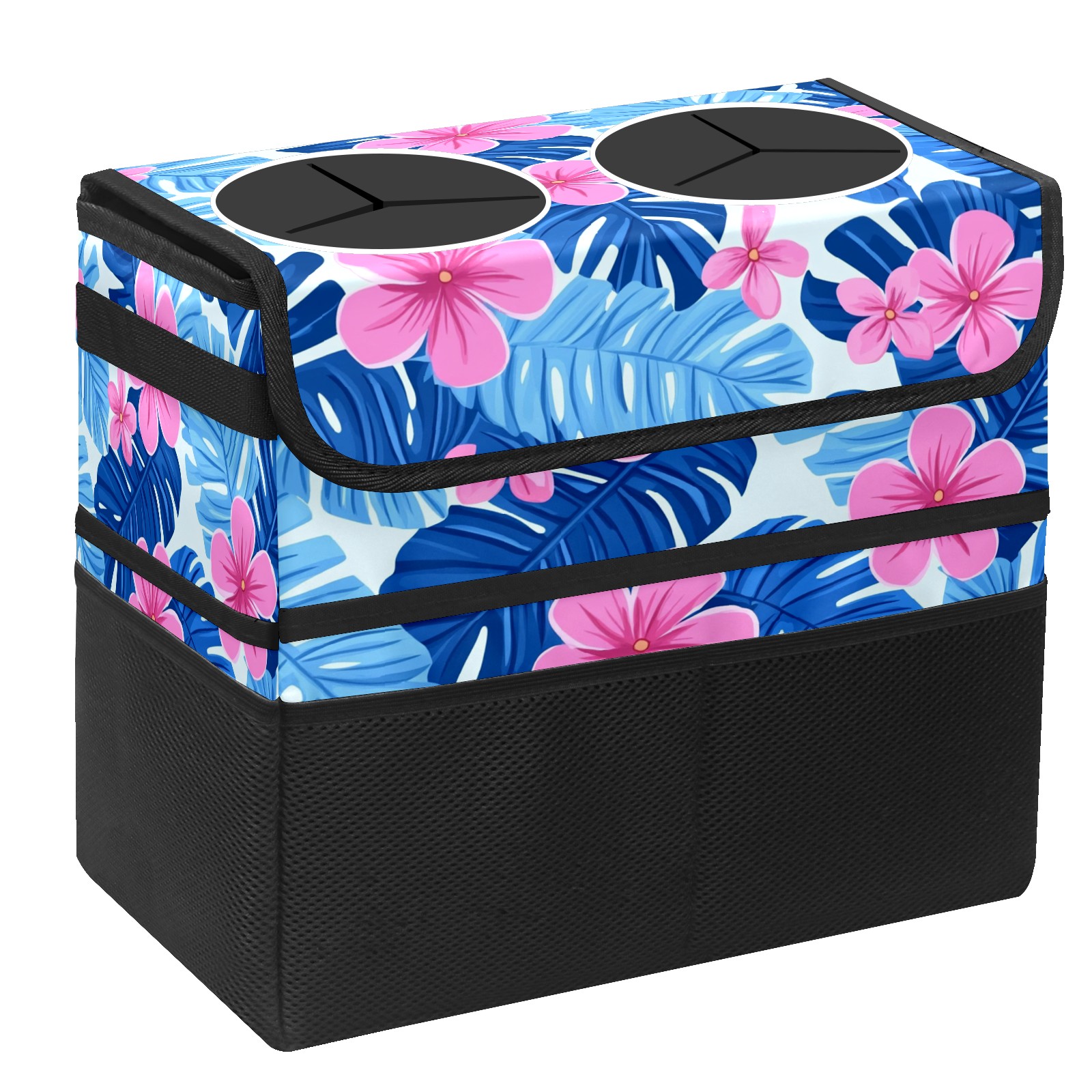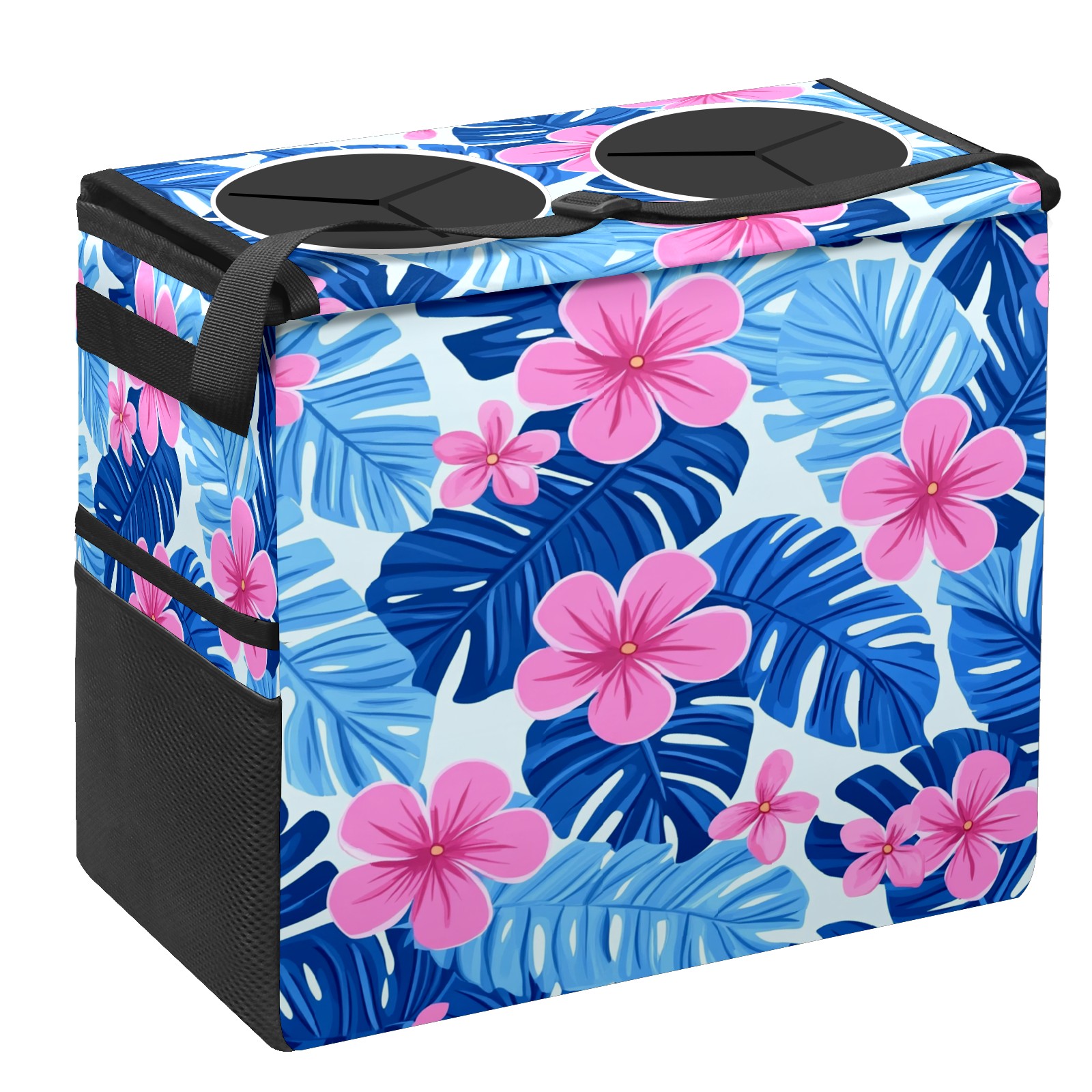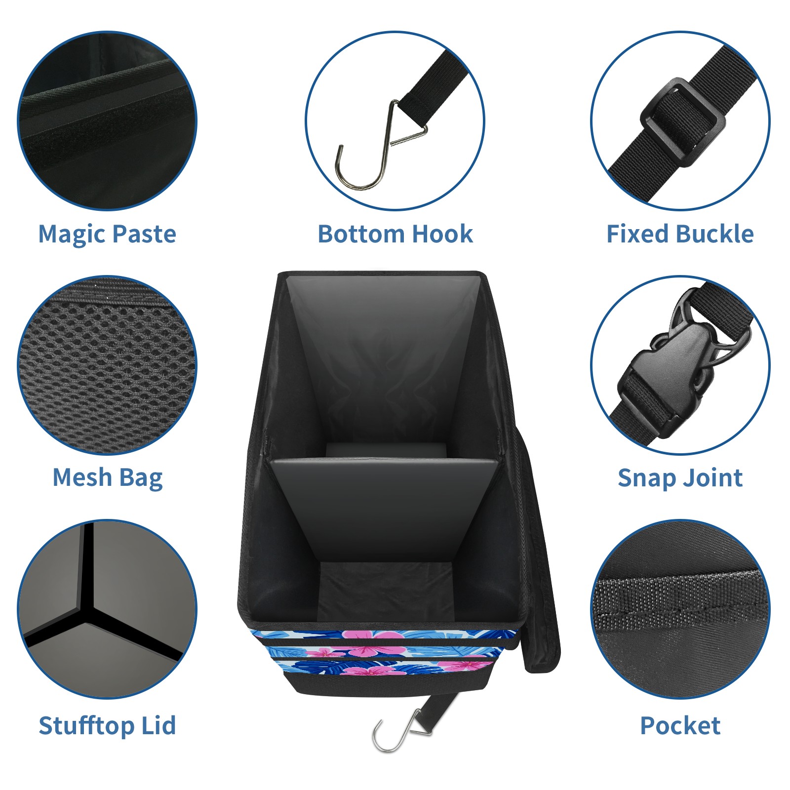 Car Trash Can with Lid, Portable Hanging Automotive Garbage Bin for Vehicles, Leakproof Waste Bag Container for SUV Truck Van Interior Auto Travel Road Trips(Pink Floral And Blue Leaves)