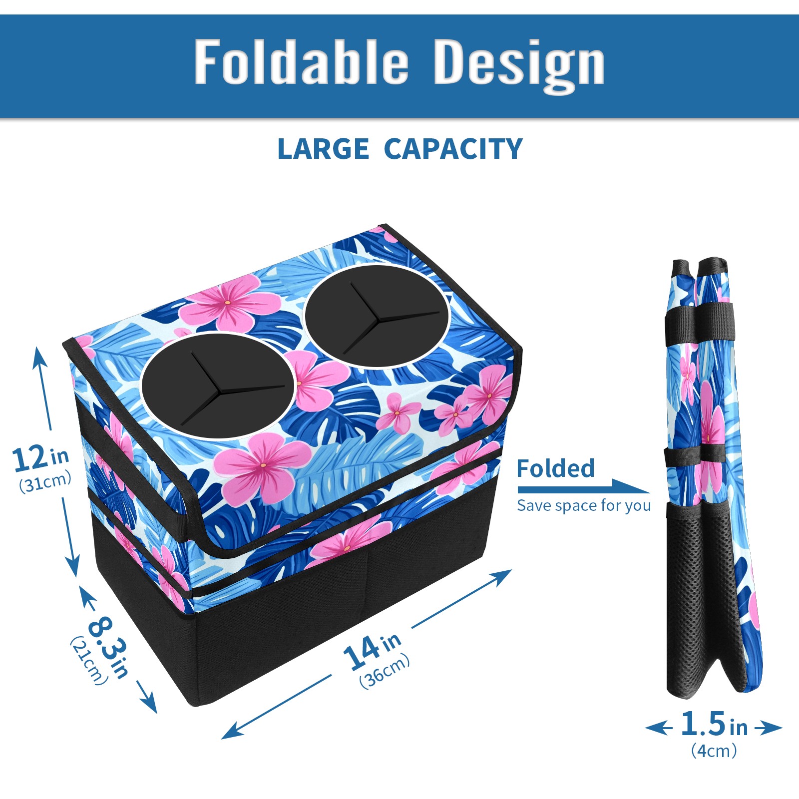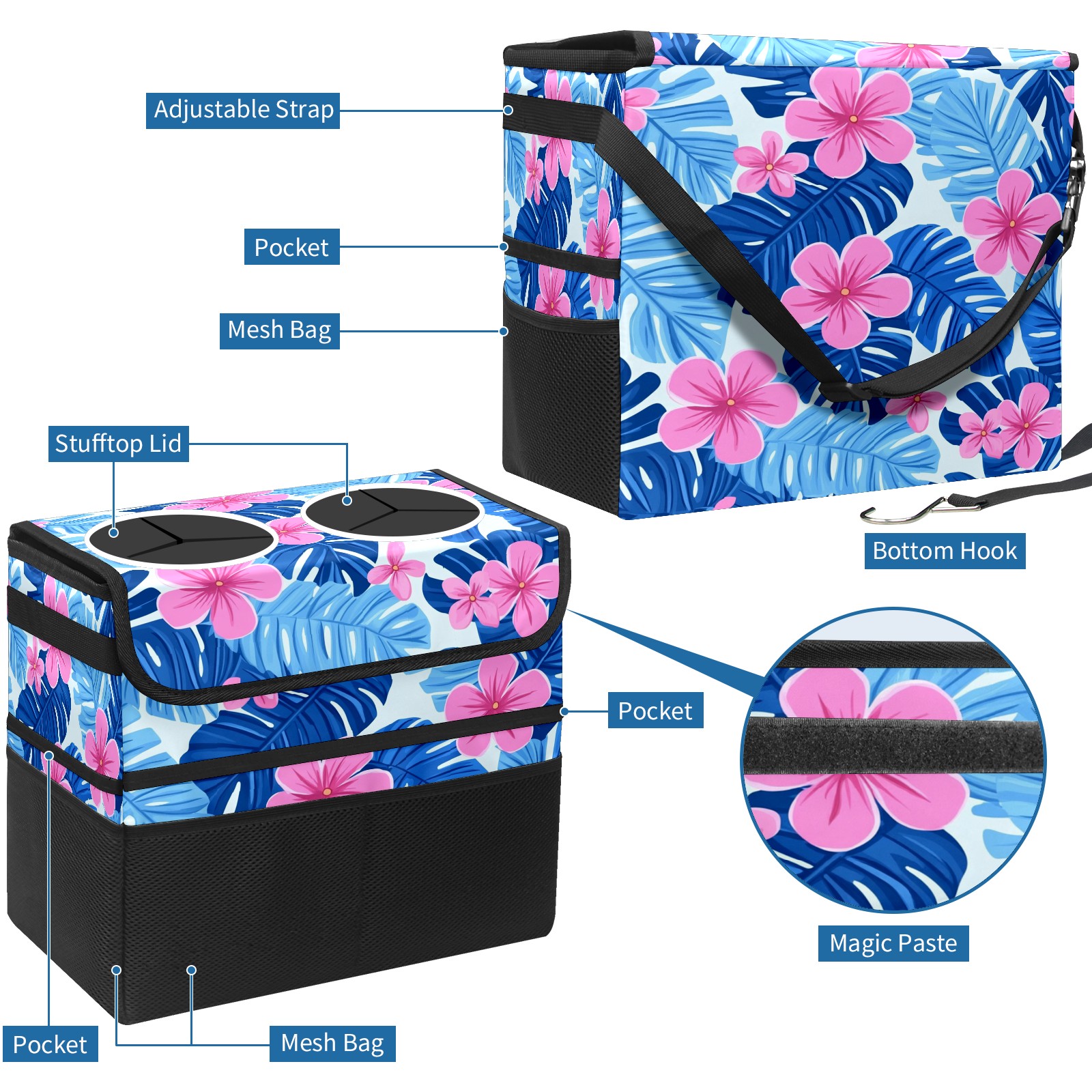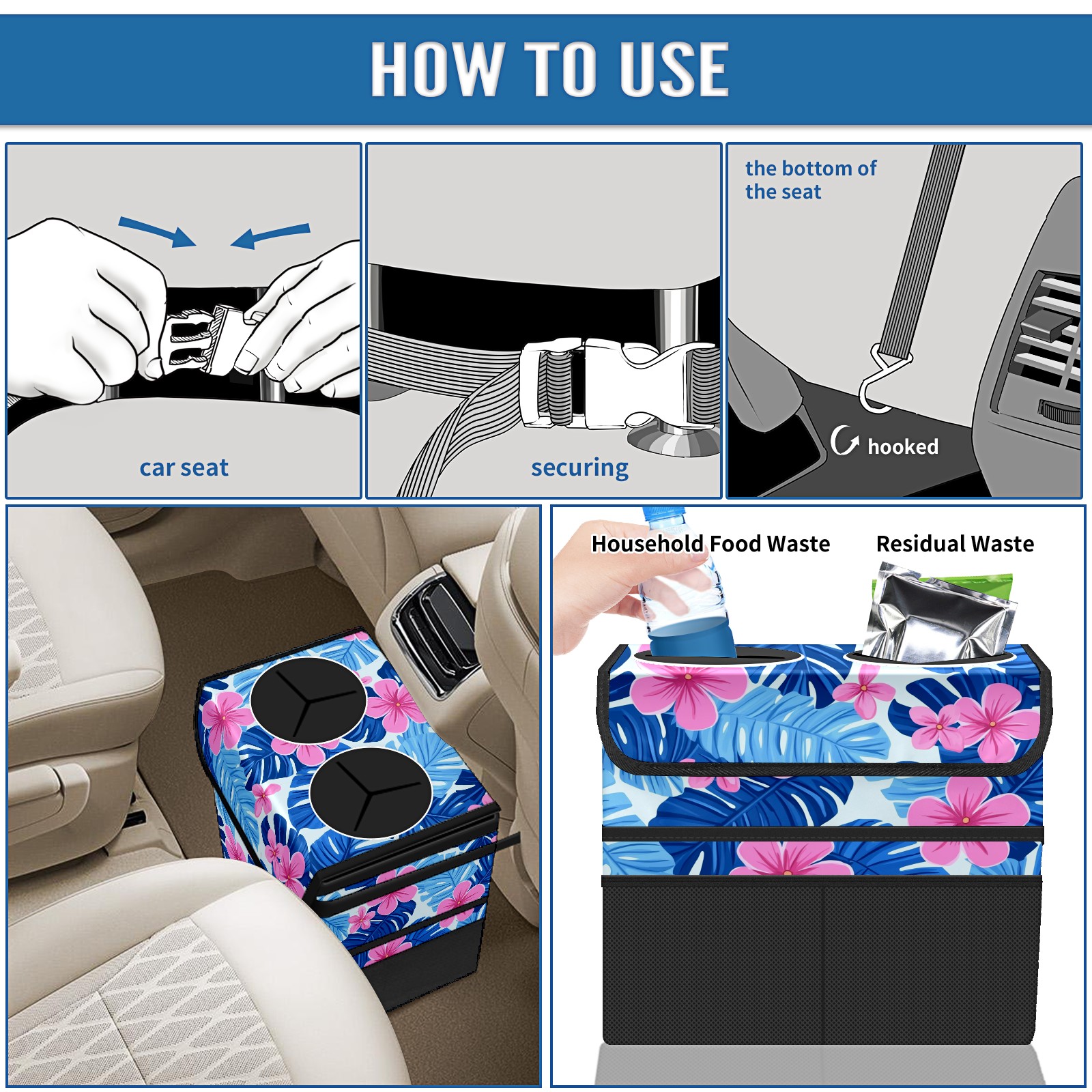 Car Trash Can with Lid, Portable Hanging Automotive Garbage Bin for Vehicles, Leakproof Waste Bag Container for SUV Truck Van Interior Auto Travel Road Trips(Pink Floral And Blue Leaves)