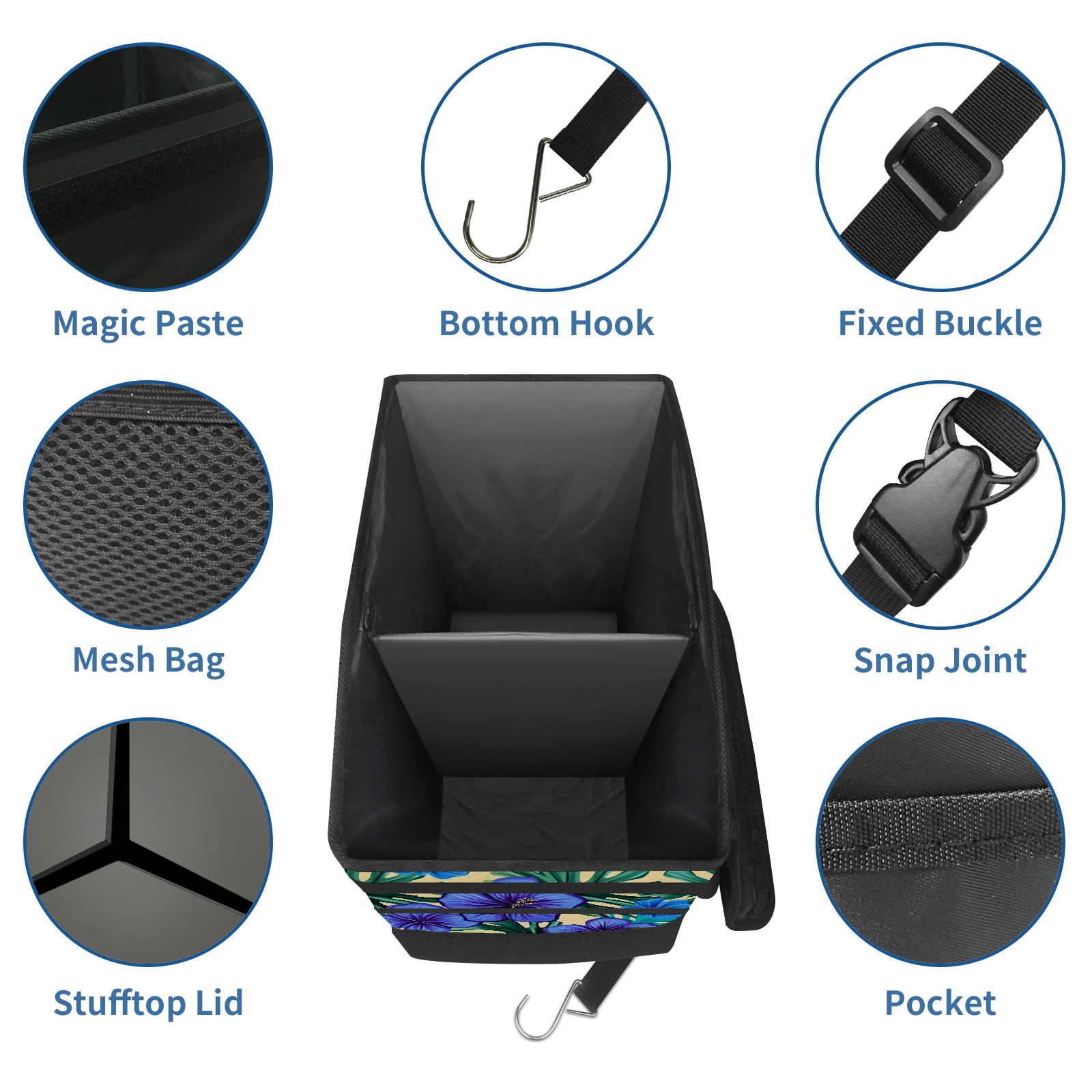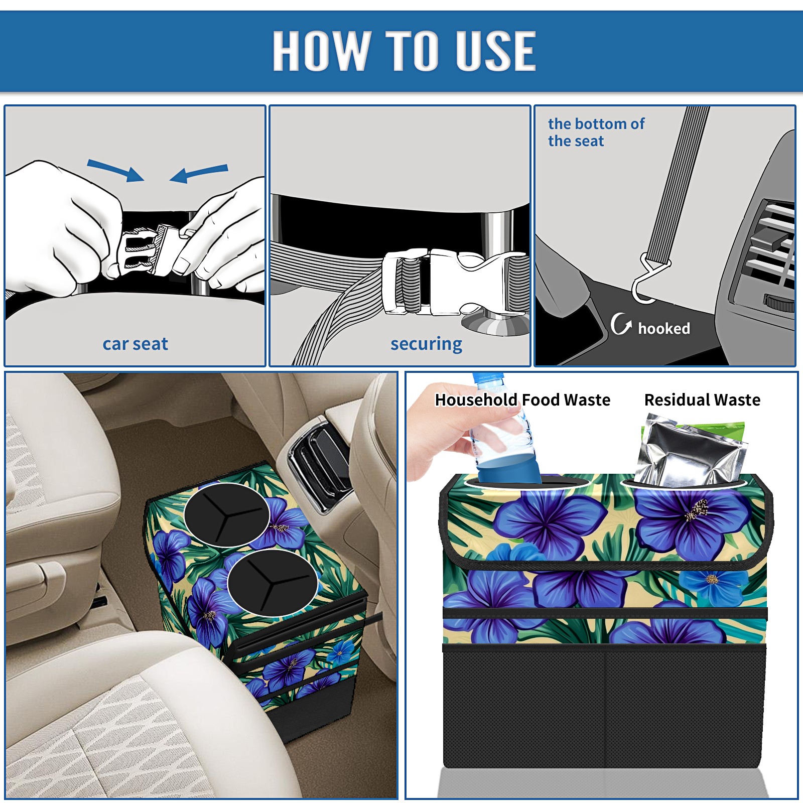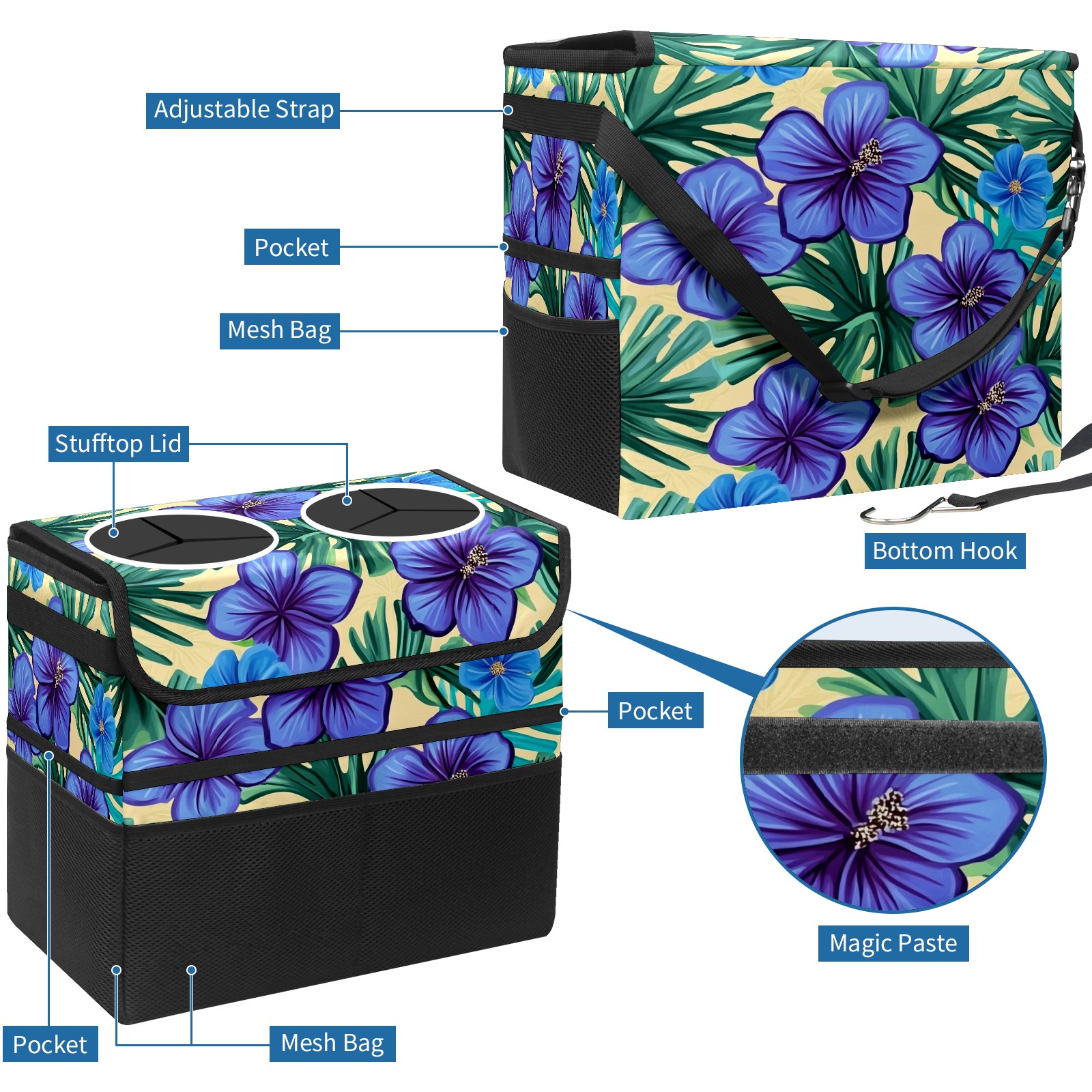 Car Trash Can with Lid, Portable Hanging Automotive Garbage Bin for Vehicles, Leakproof Waste Bag Container for SUV Truck Van Interior Auto Travel Road Trips(Blue Hibiscus Flowers)