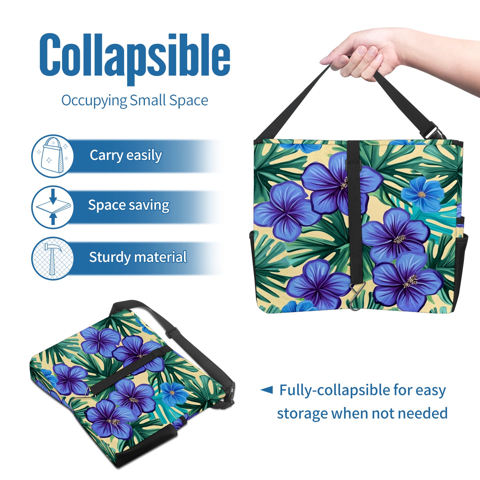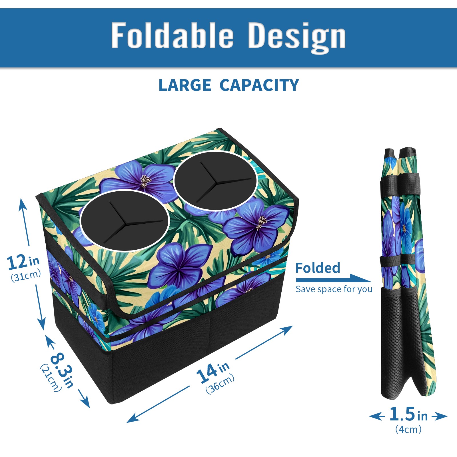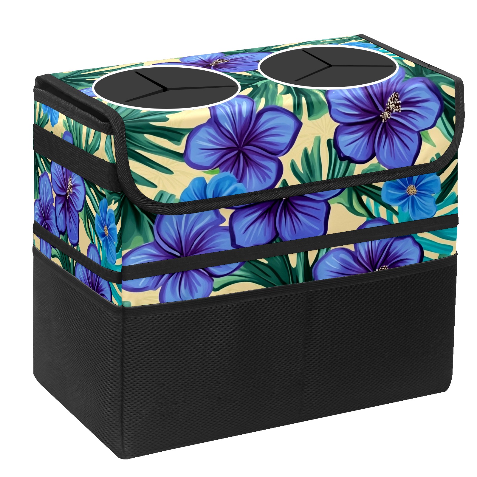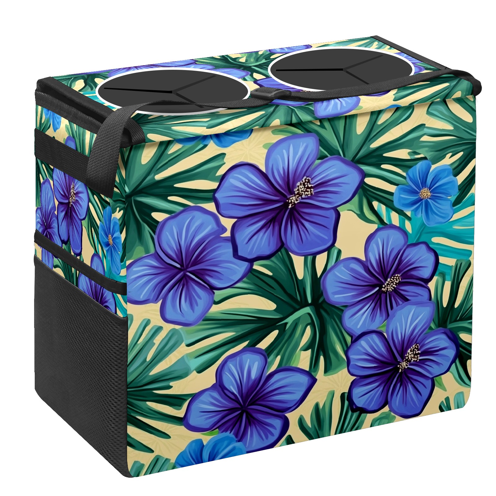 Car Trash Can with Lid, Portable Hanging Automotive Garbage Bin for Vehicles, Leakproof Waste Bag Container for SUV Truck Van Interior Auto Travel Road Trips(Blue Hibiscus Flowers)