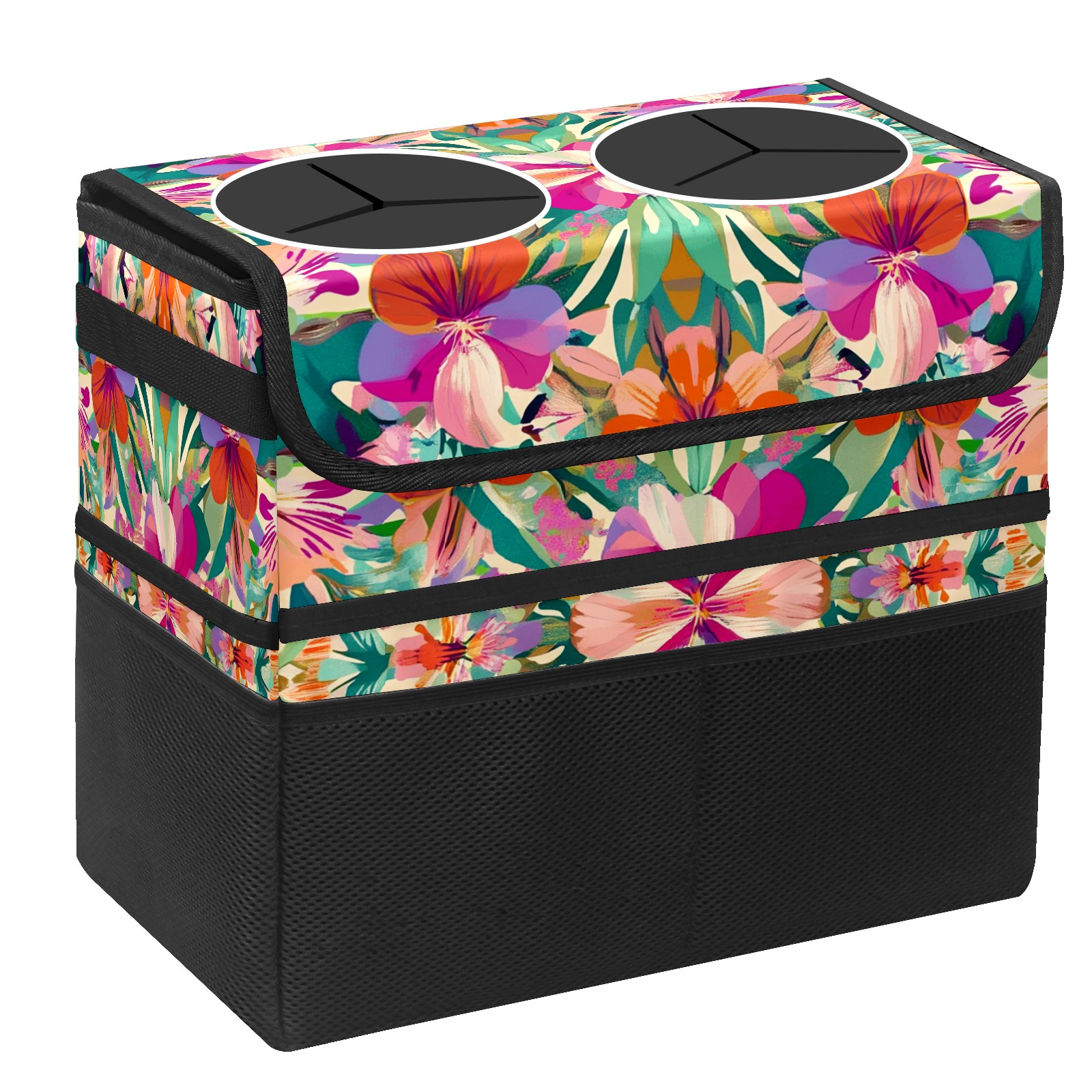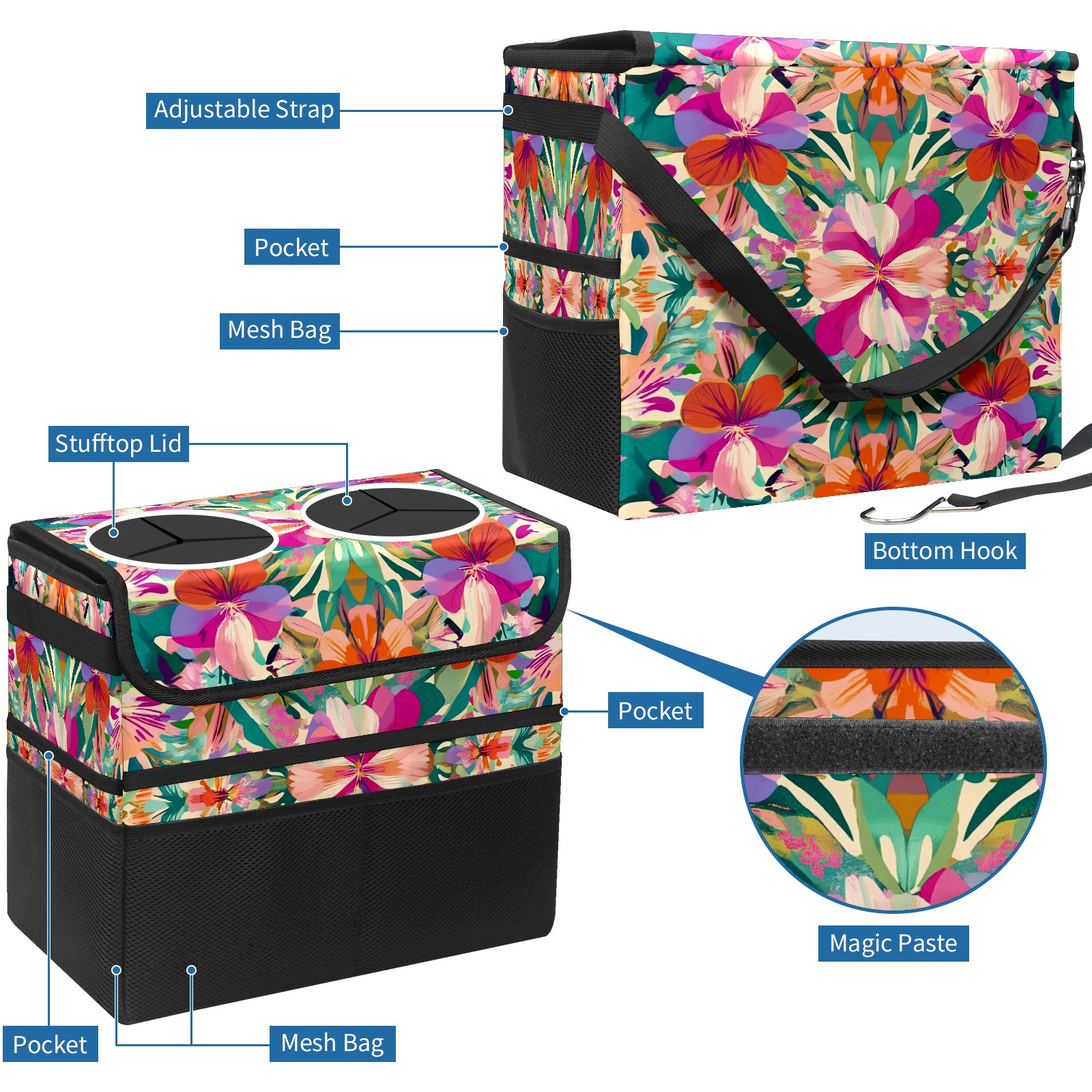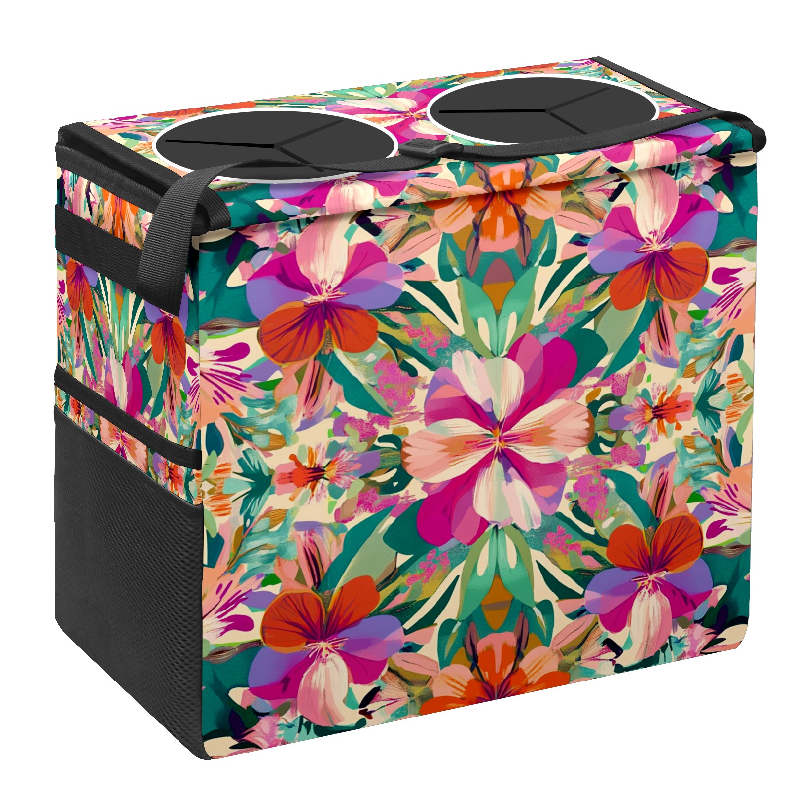 Car Trash Can with Lid, Portable Hanging Automotive Garbage Bin for Vehicles, Leakproof Waste Bag Container for SUV Truck Van Interior Auto Travel Road Trips(Exotic Flowers)