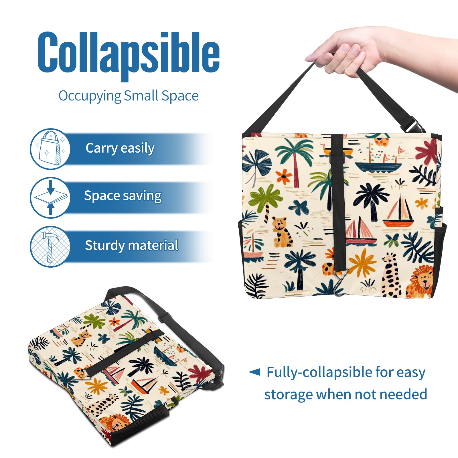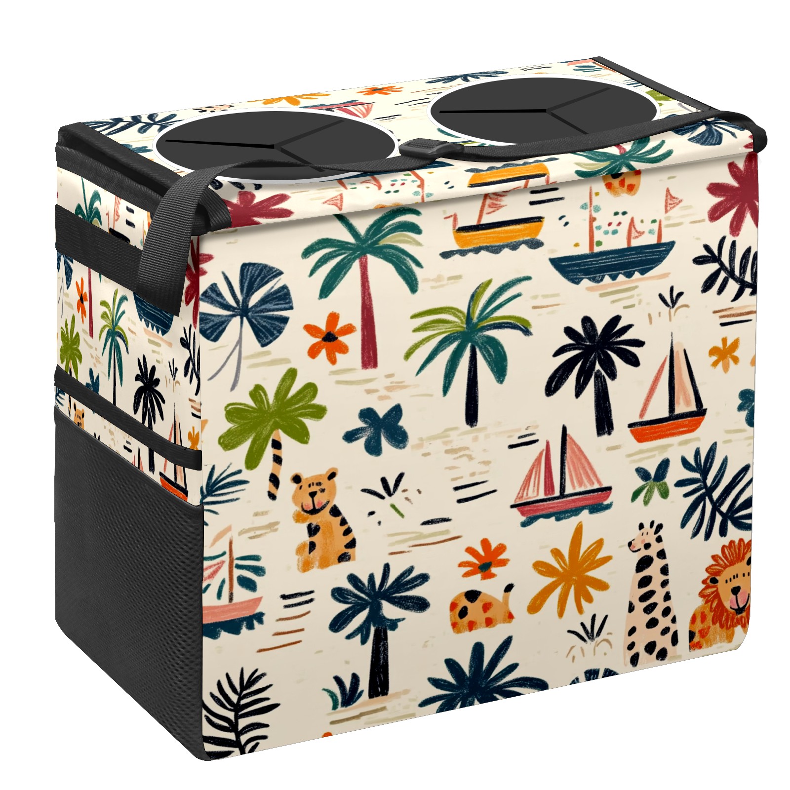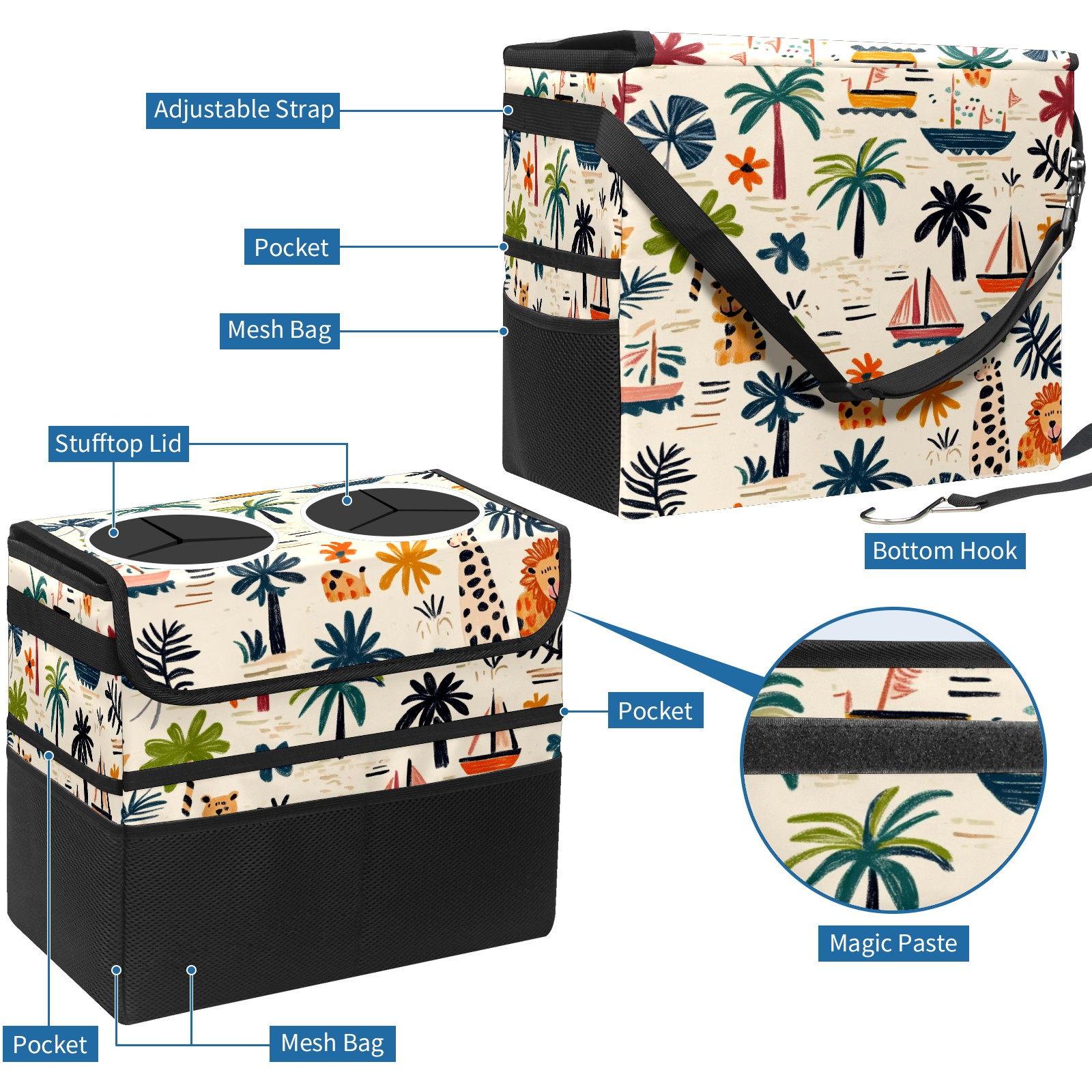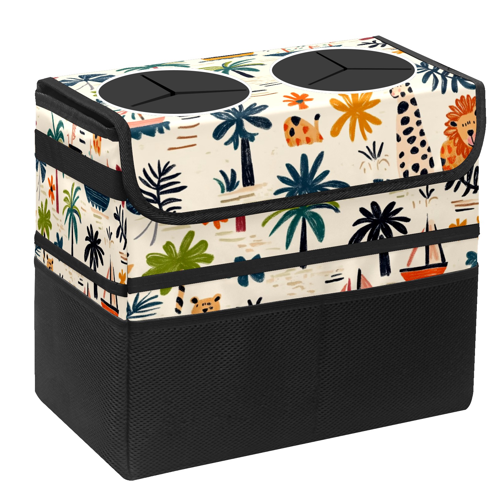 Car Trash Can with Lid, Portable Hanging Automotive Garbage Bin for Vehicles, Leakproof Waste Bag Container for SUV Truck Van Interior Auto Travel Road Trips(Palm Trees Boats And Lions)