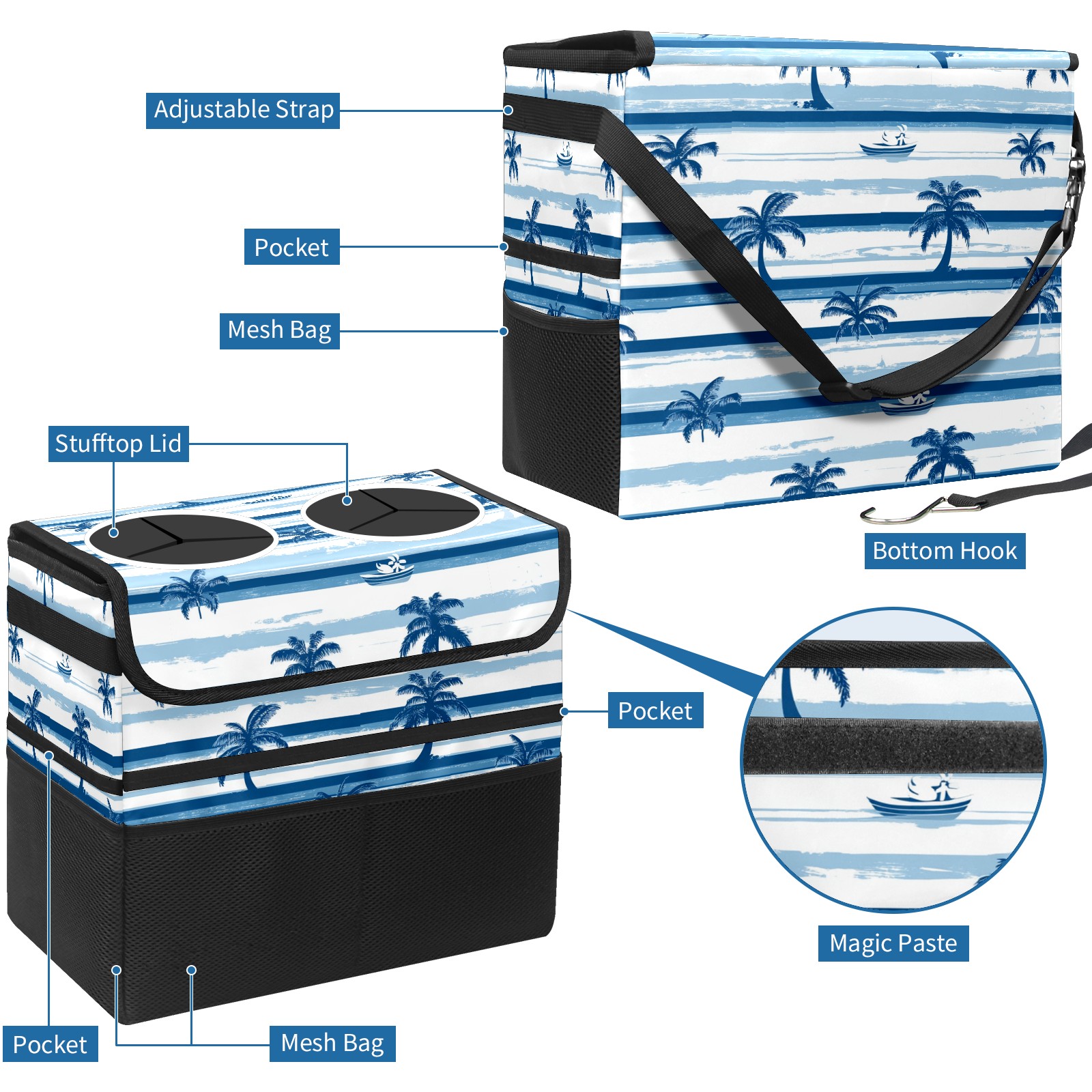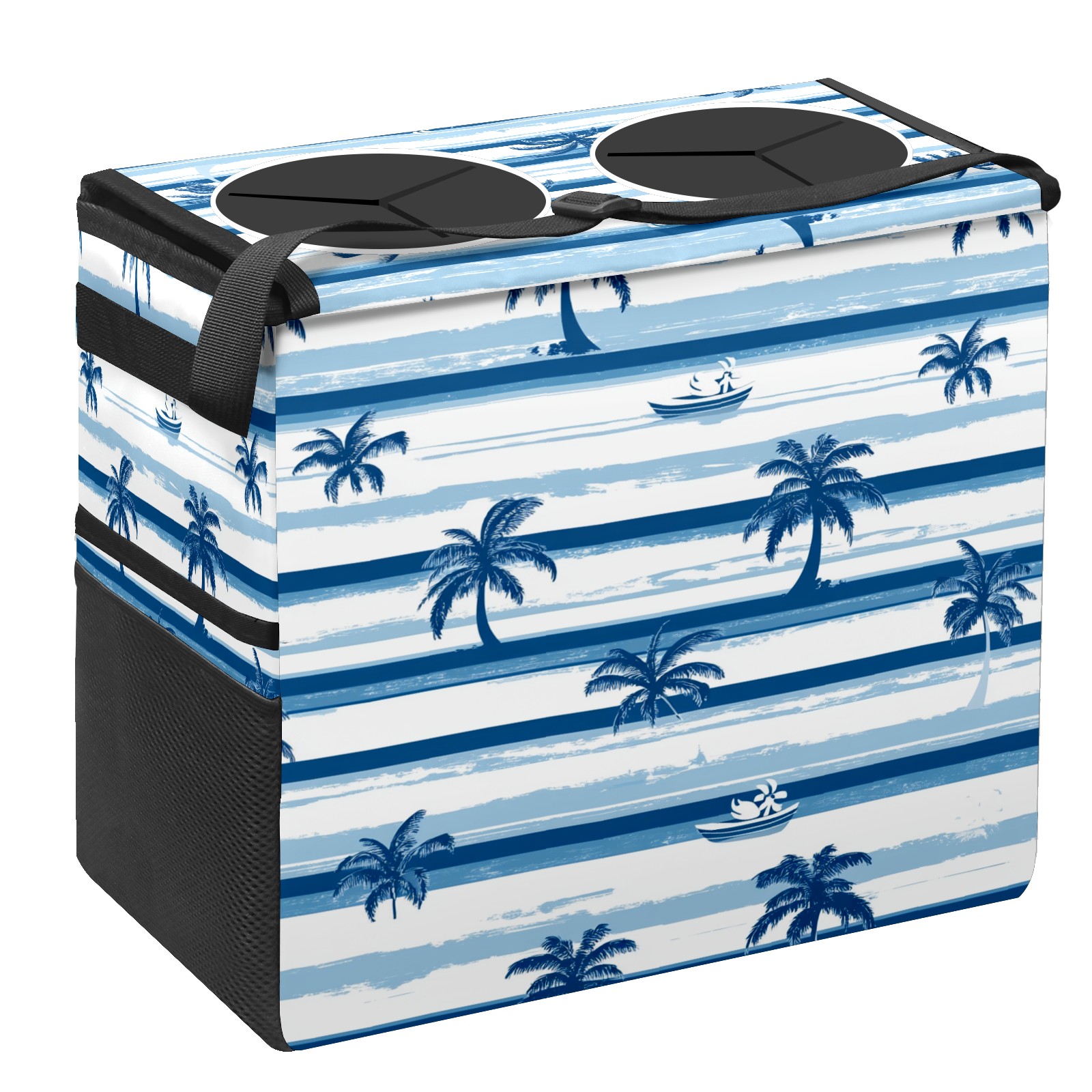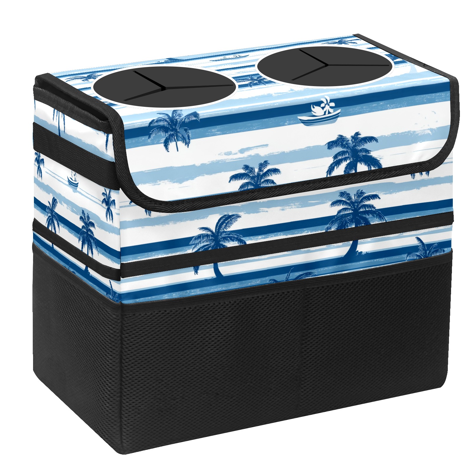 Car Trash Can with Lid, Portable Hanging Automotive Garbage Bin for Vehicles, Leakproof Waste Bag Container for SUV Truck Van Interior Auto Travel Road Trips(Palm Trees And Boats)