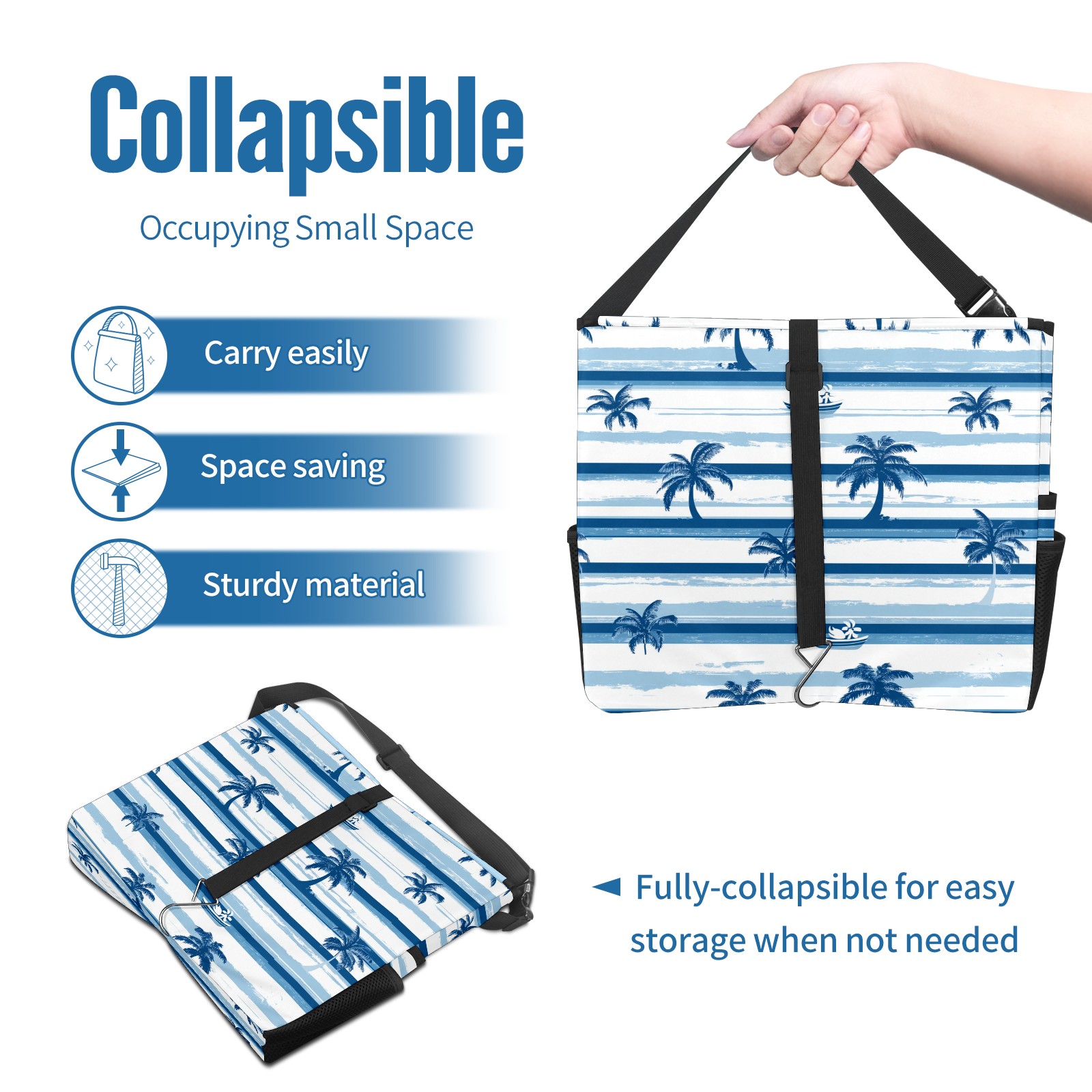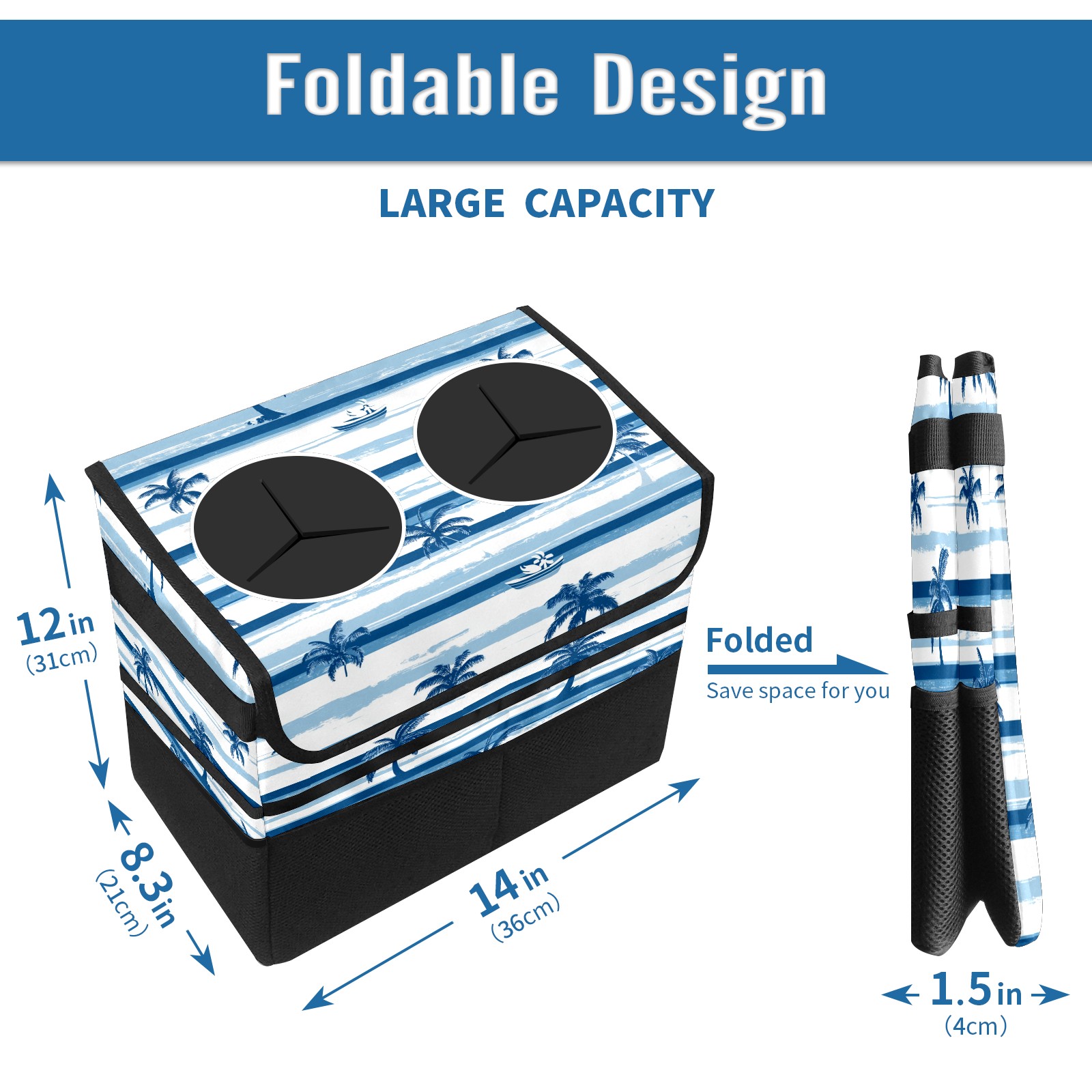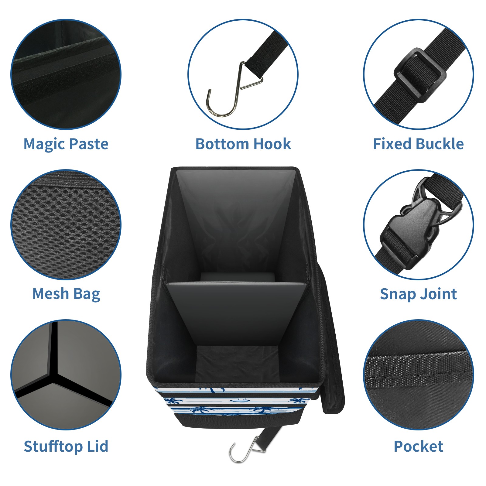 Car Trash Can with Lid, Portable Hanging Automotive Garbage Bin for Vehicles, Leakproof Waste Bag Container for SUV Truck Van Interior Auto Travel Road Trips(Palm Trees And Boats)