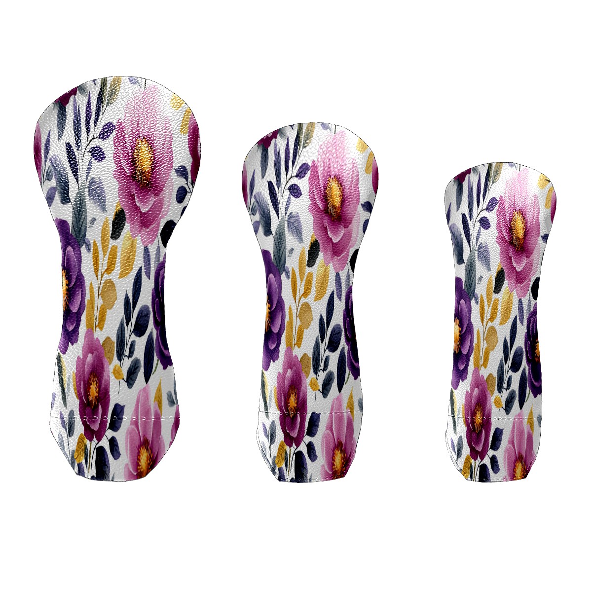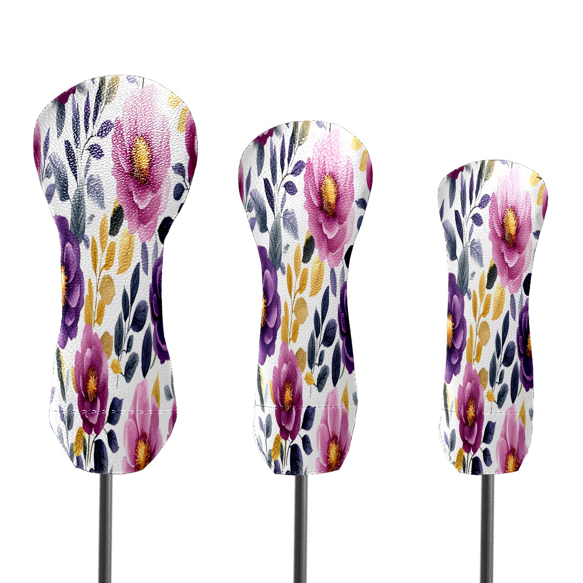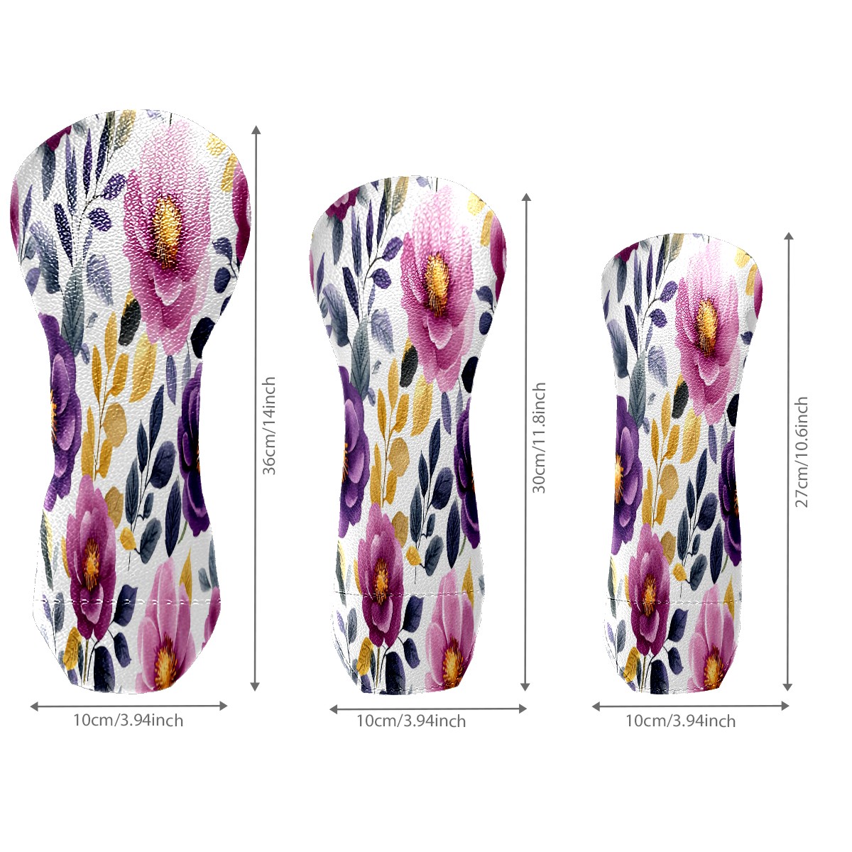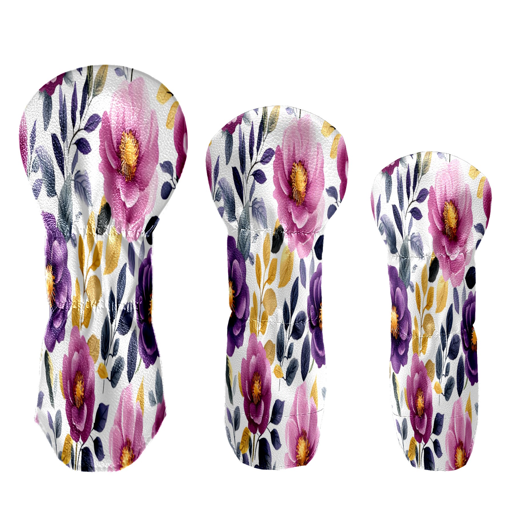 Golf Head Covers 3-Pack Purple Flowers Waterproof PU Leather & Plush Velvet Lining Fits Driver Fairway Hybrid Clubs, Scratch Protection Durable Golf Gift for Men & Women