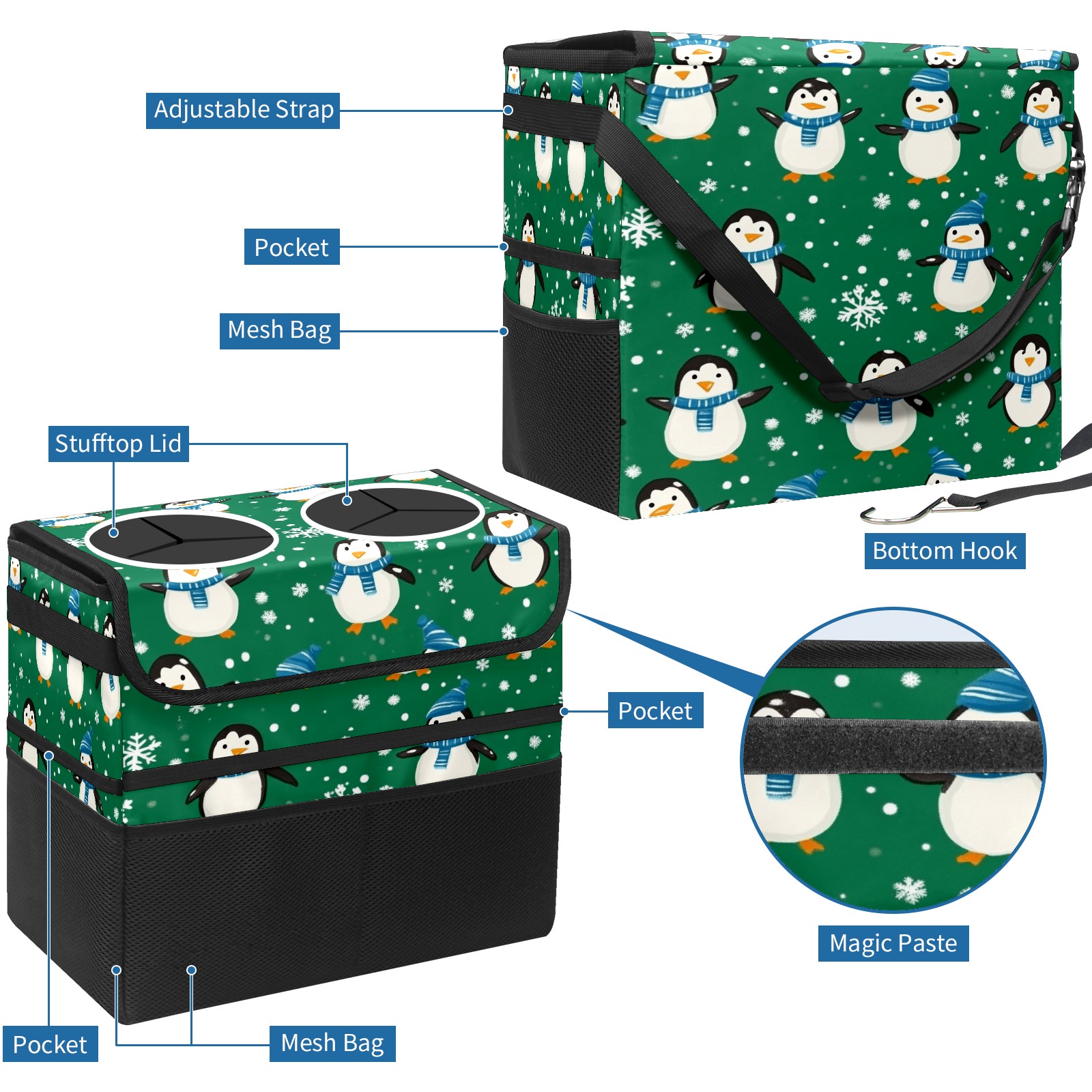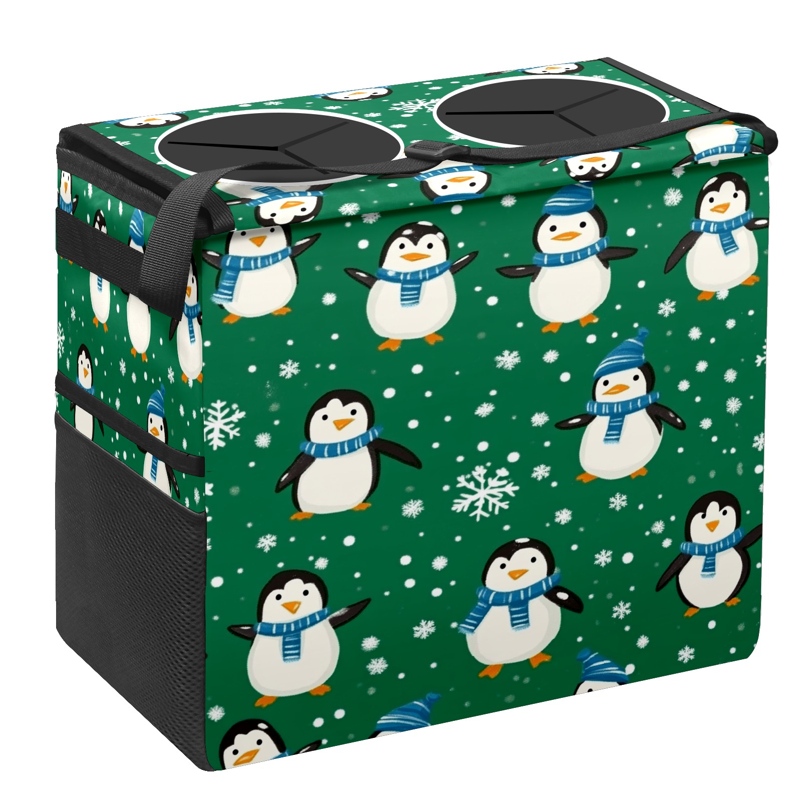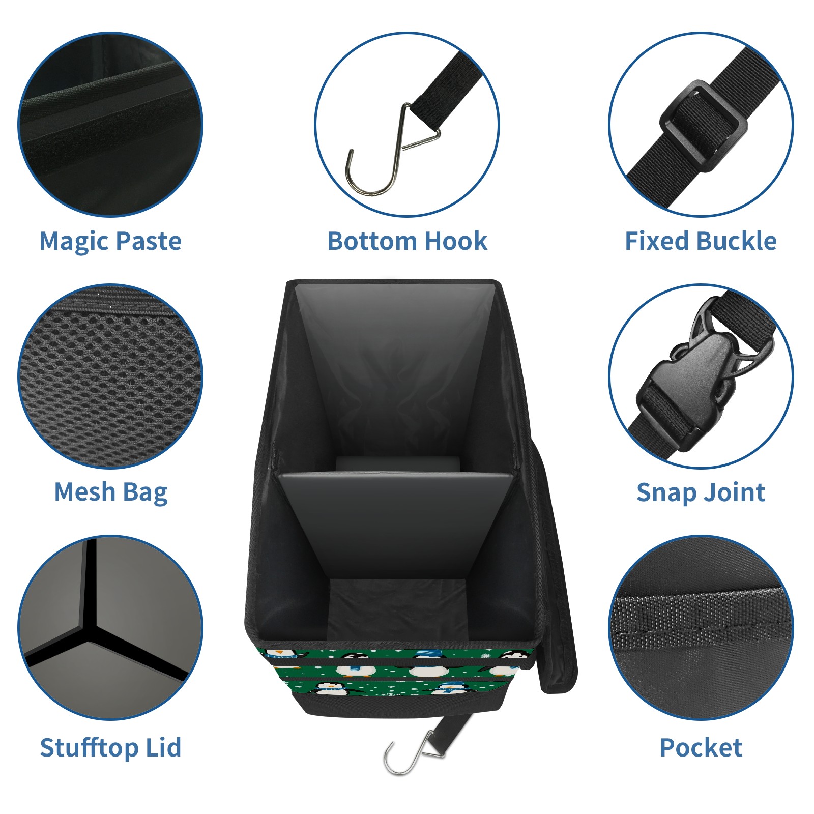 Car Trash Can with Lid, Portable Hanging Automotive Garbage Bin for Vehicles, Leakproof Waste Bag Container for SUV Truck Van Interior Auto Travel Road Trips(Penguins And Snowmen)