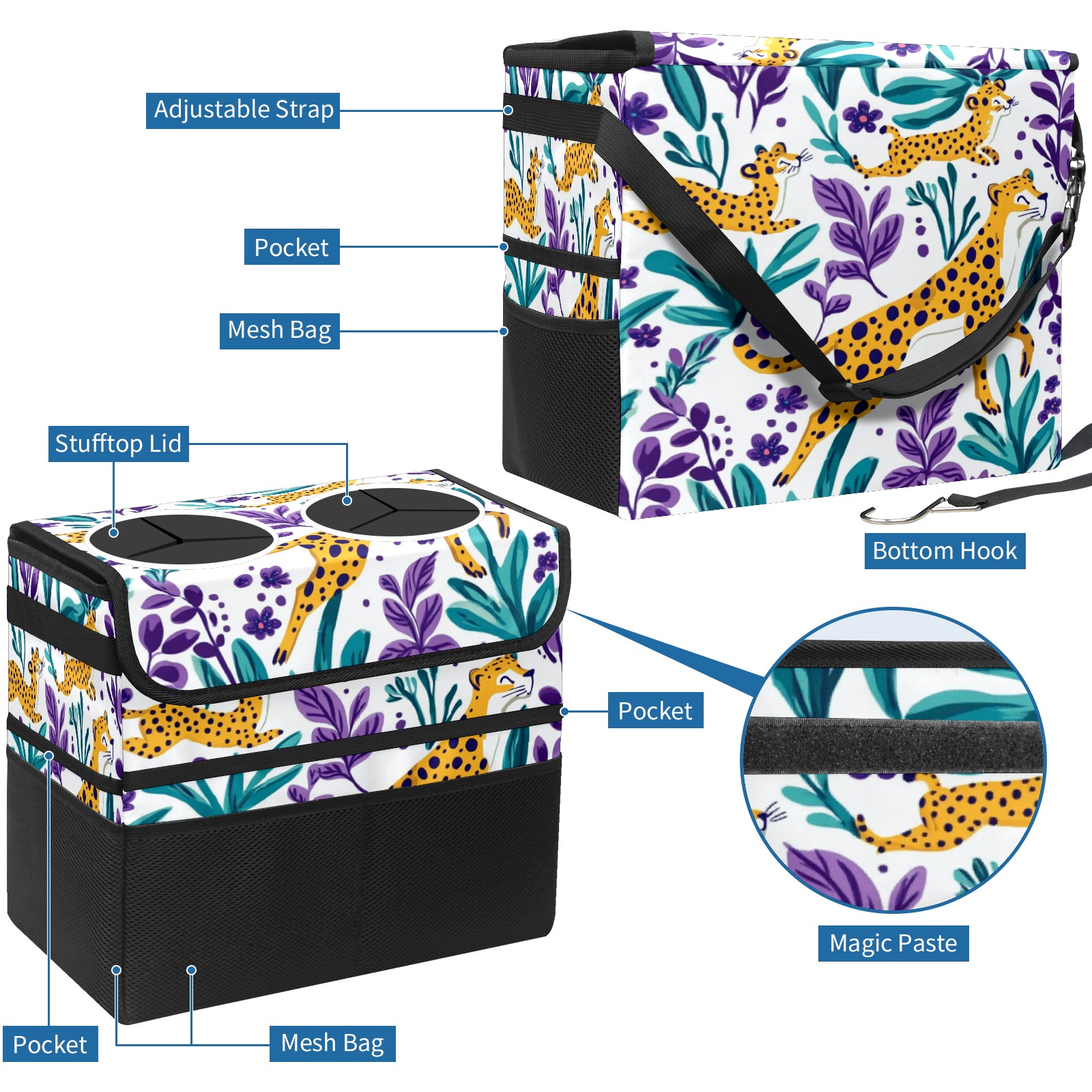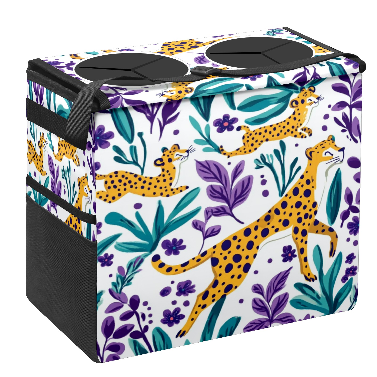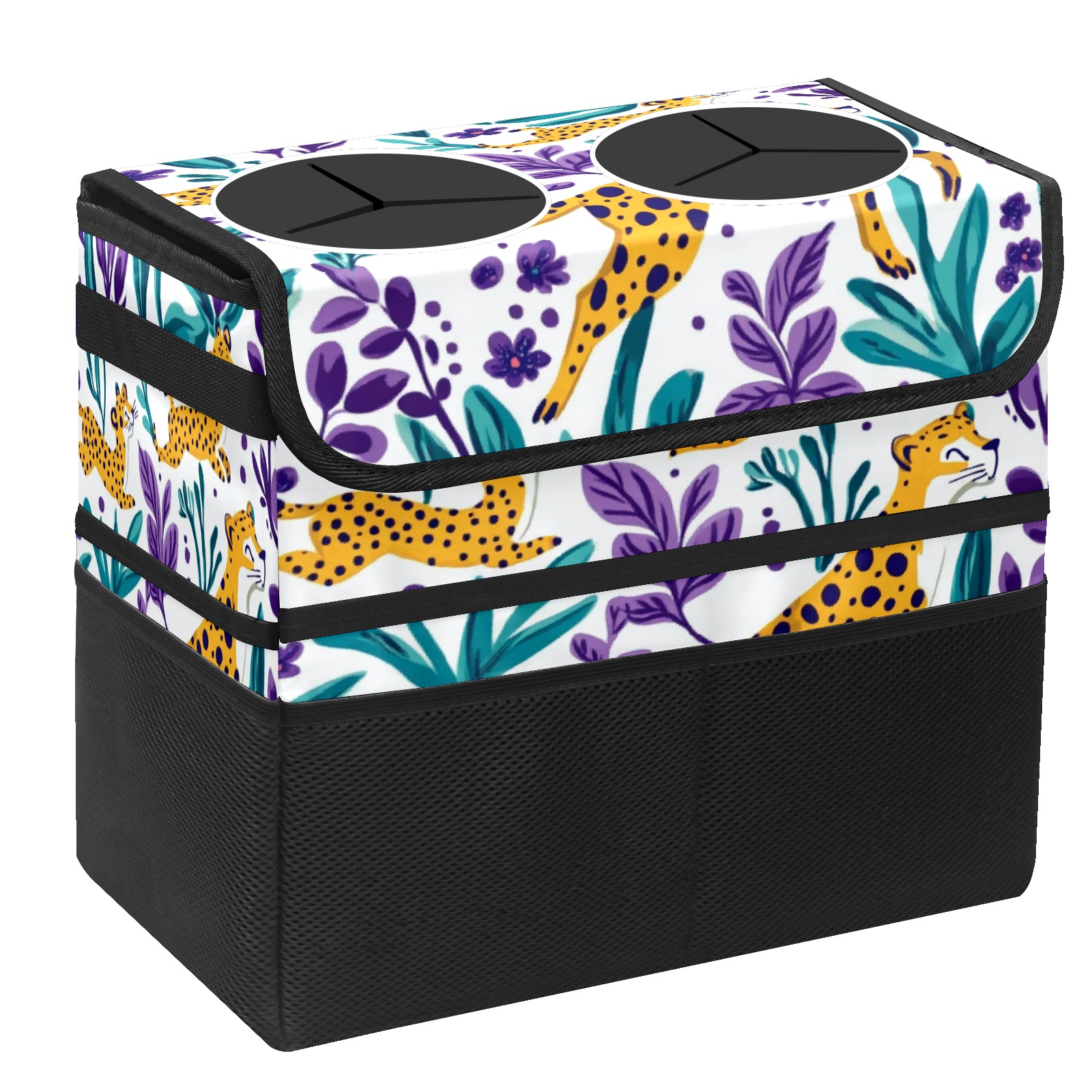 Car Trash Can with Lid, Portable Hanging Automotive Garbage Bin for Vehicles, Leakproof Waste Bag Container for SUV Truck Van Interior Auto Travel Road Trips(Leopard And Gazelle)