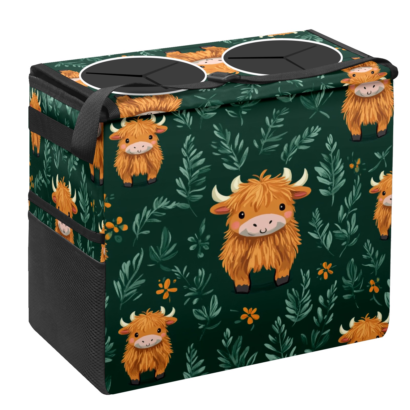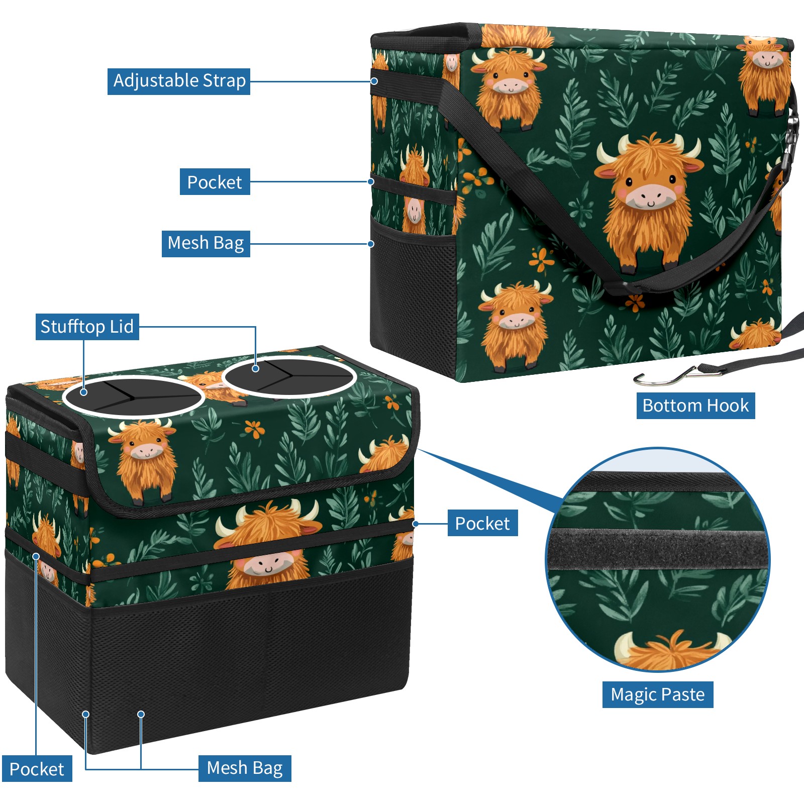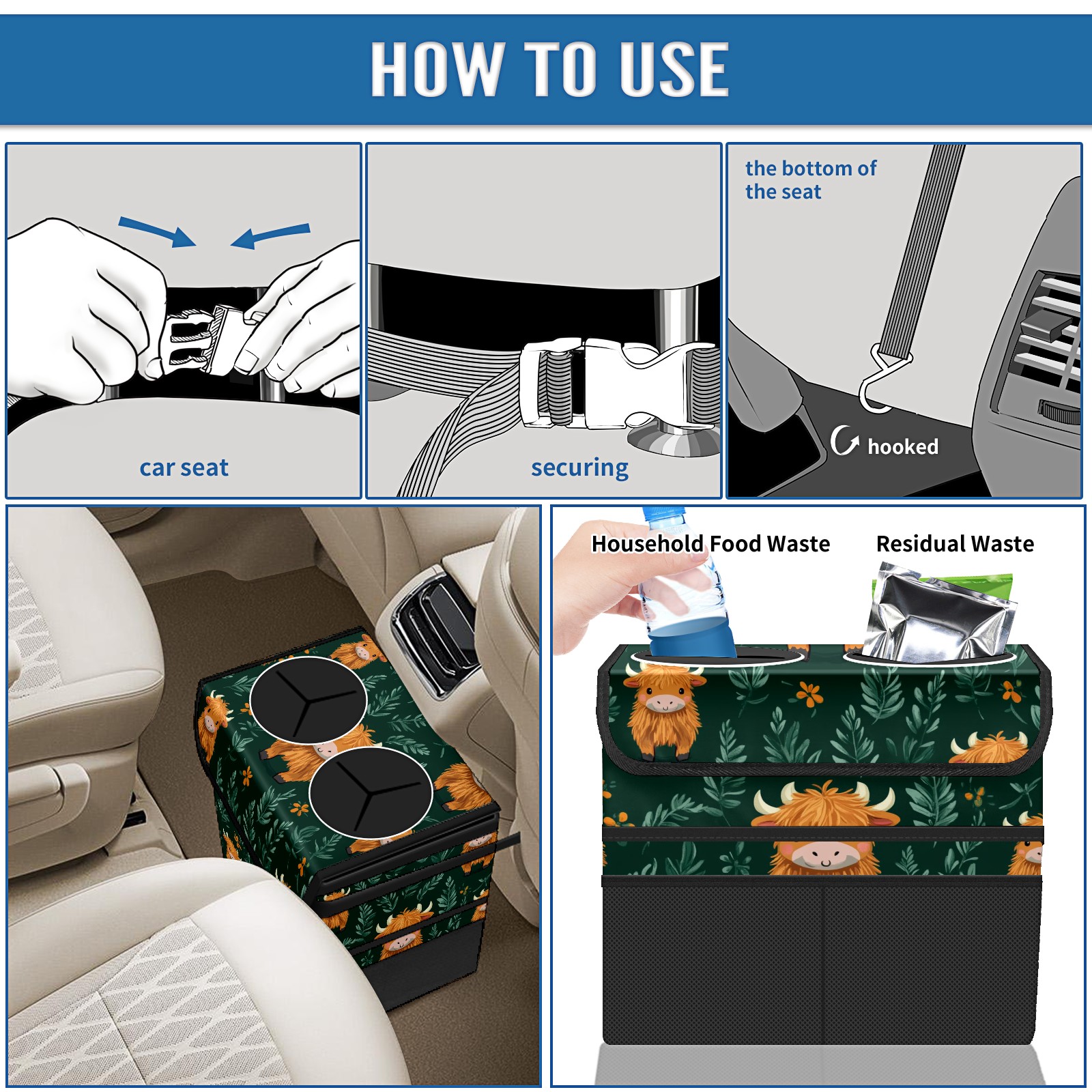 Car Trash Can with Lid, Portable Hanging Automotive Garbage Bin for Vehicles, Leakproof Waste Bag Container for SUV Truck Van Interior Auto Travel Road Trips(Highland Cow)