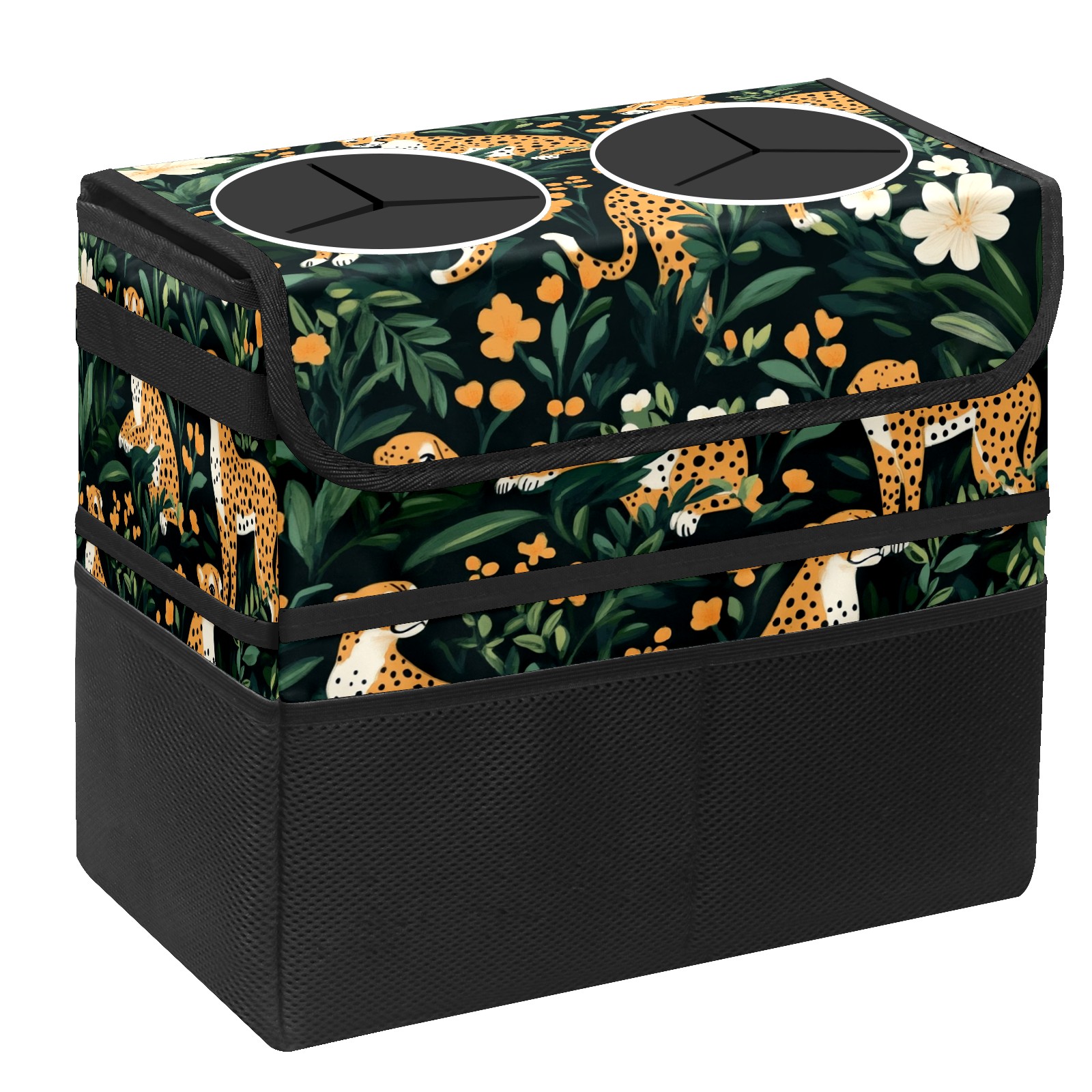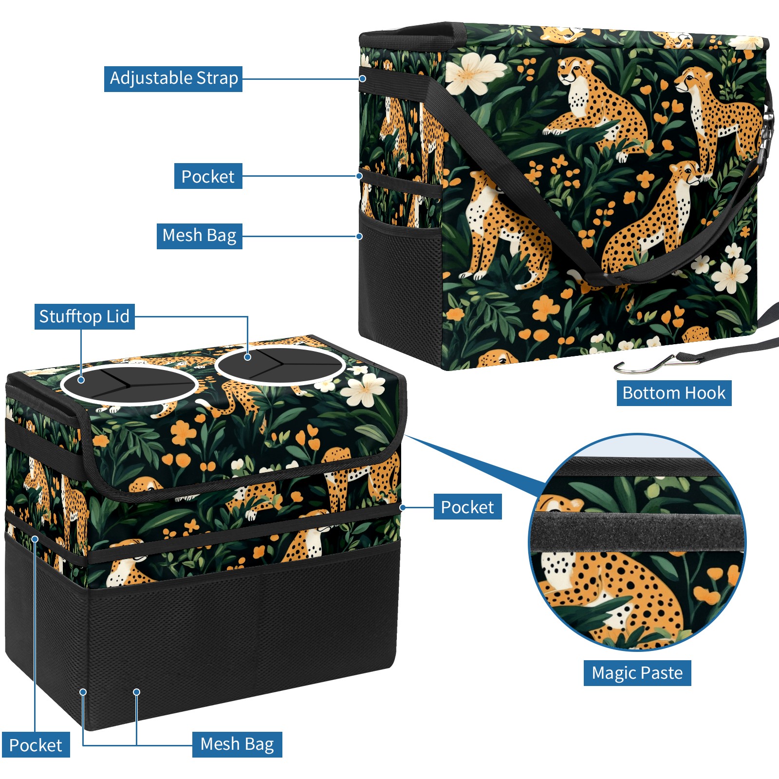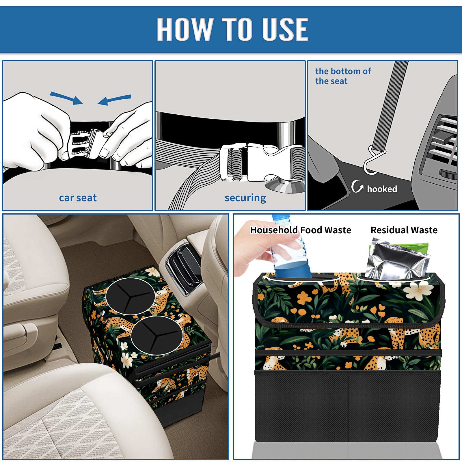 Car Trash Can with Lid, Portable Hanging Automotive Garbage Bin for Vehicles, Leakproof Waste Bag Container for SUV Truck Van Interior Auto Travel Road Trips(Cheetahs)