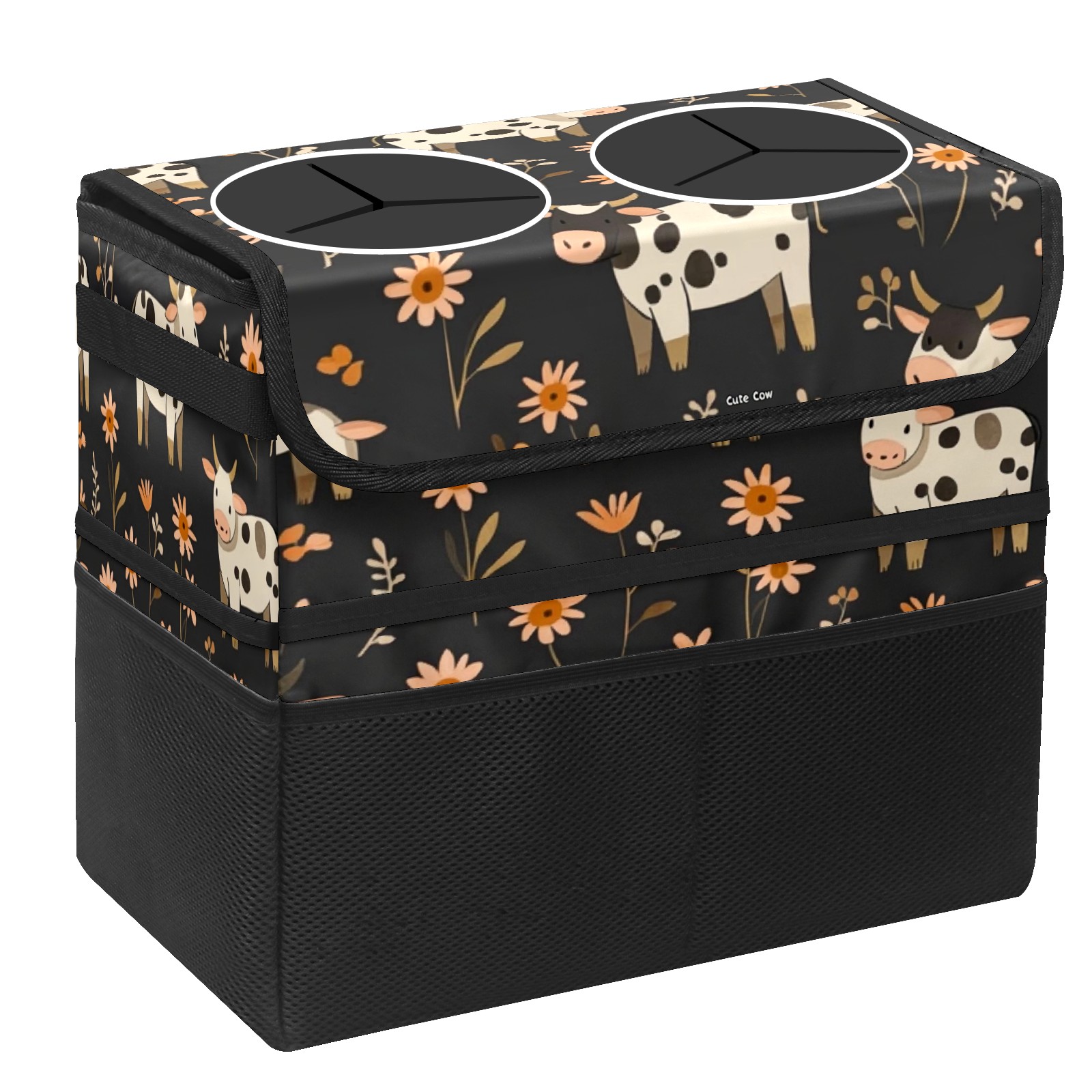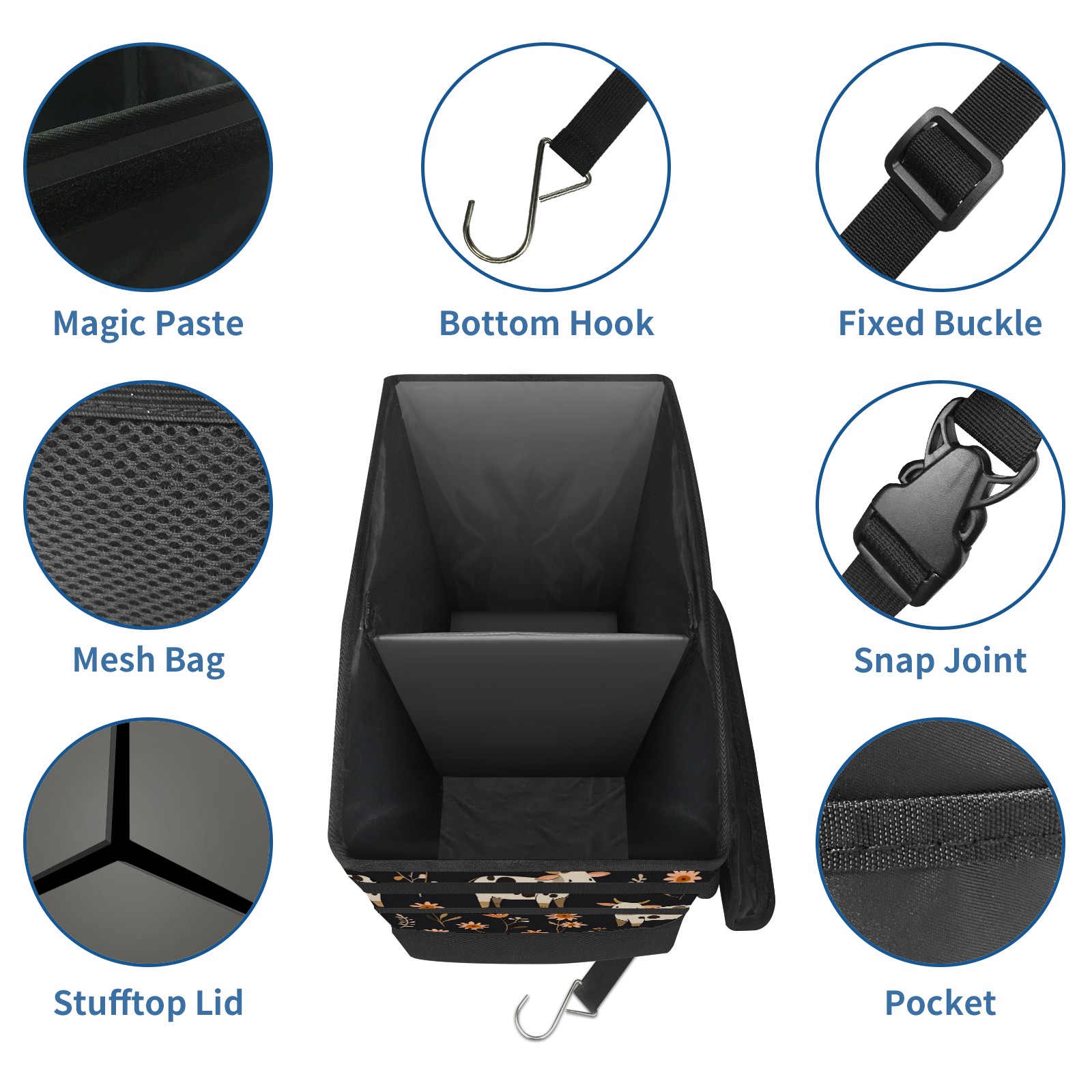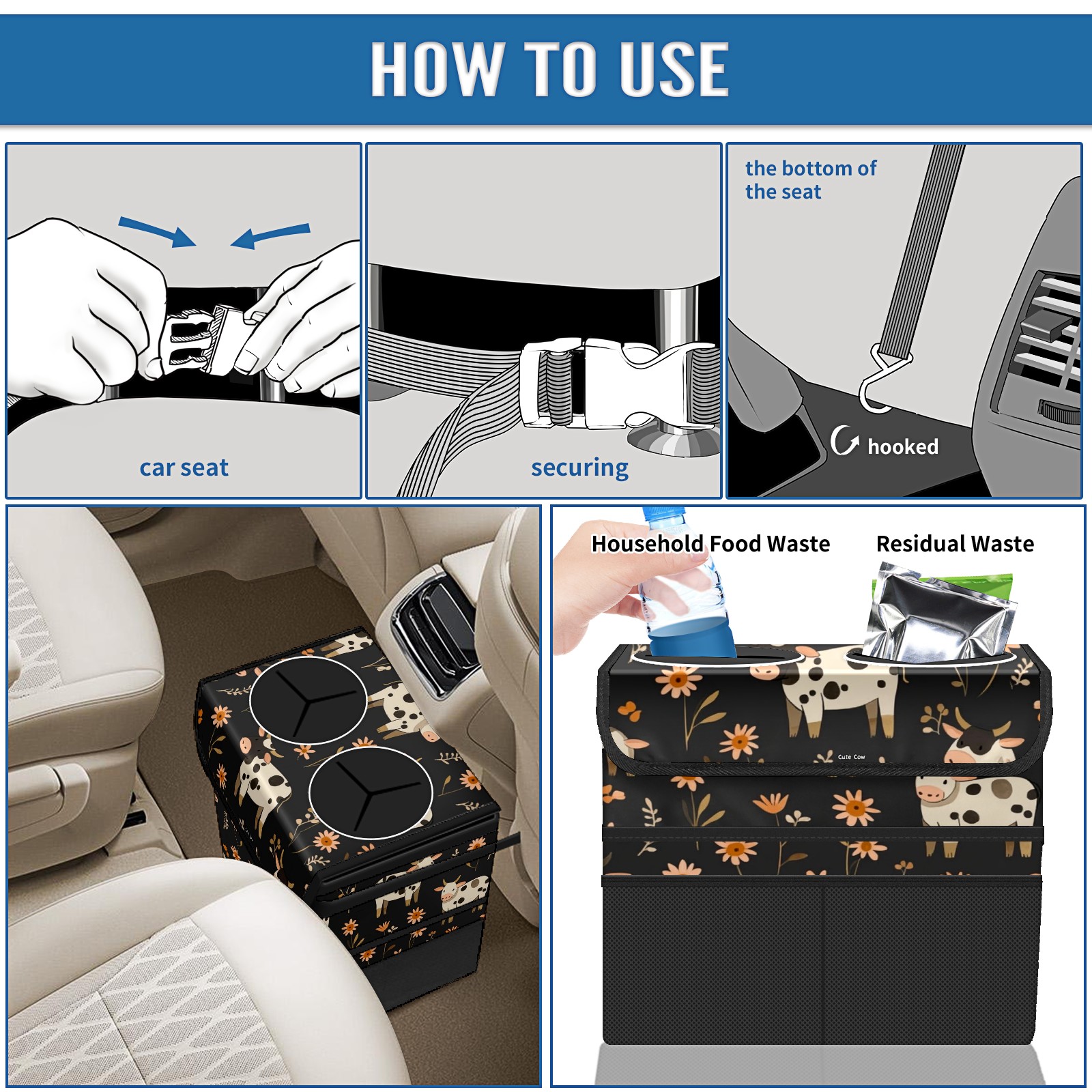 Car Trash Can with Lid, Portable Hanging Automotive Garbage Bin for Vehicles, Leakproof Waste Bag Container for SUV Truck Van Interior Auto Travel Road Trips(Cows And Flowers)
