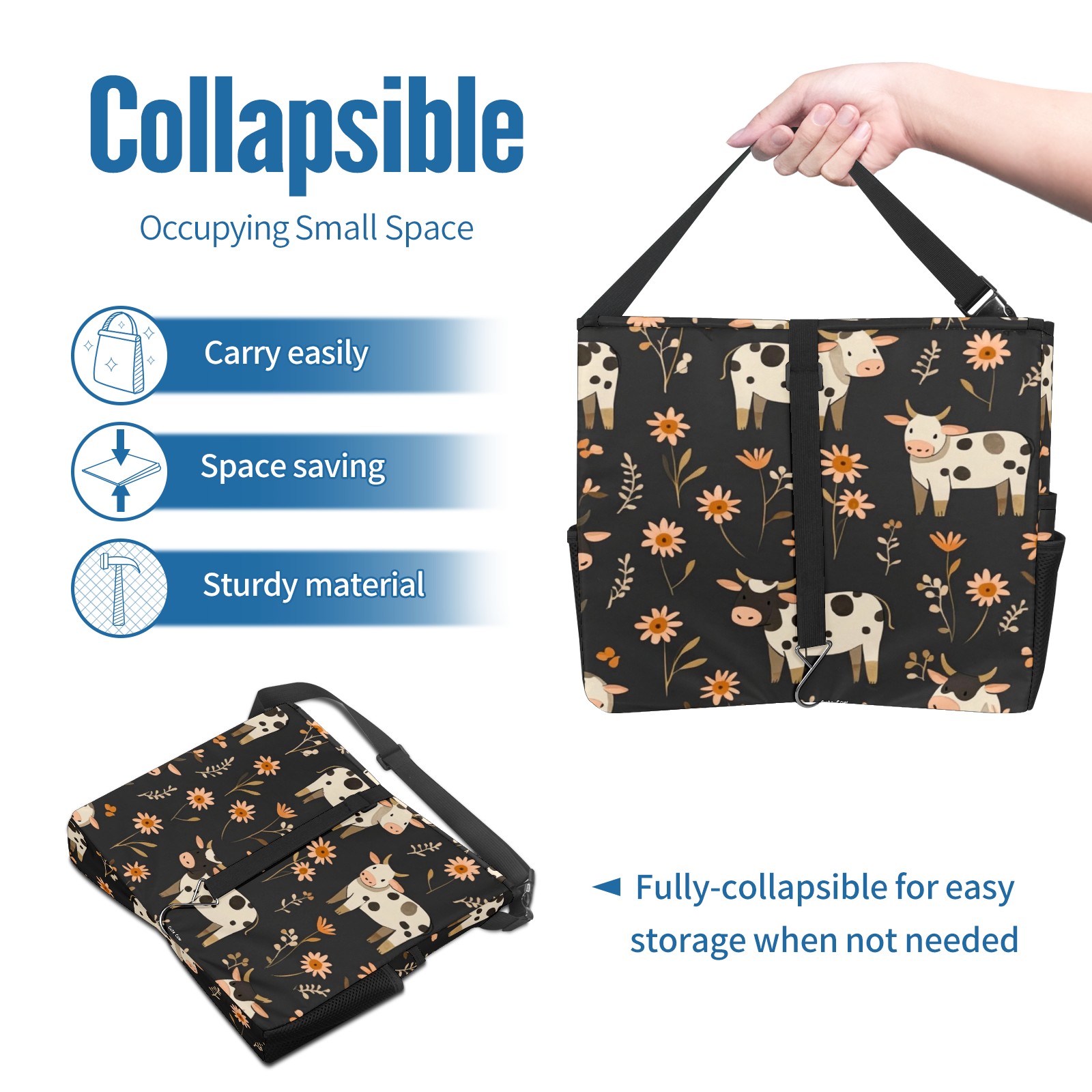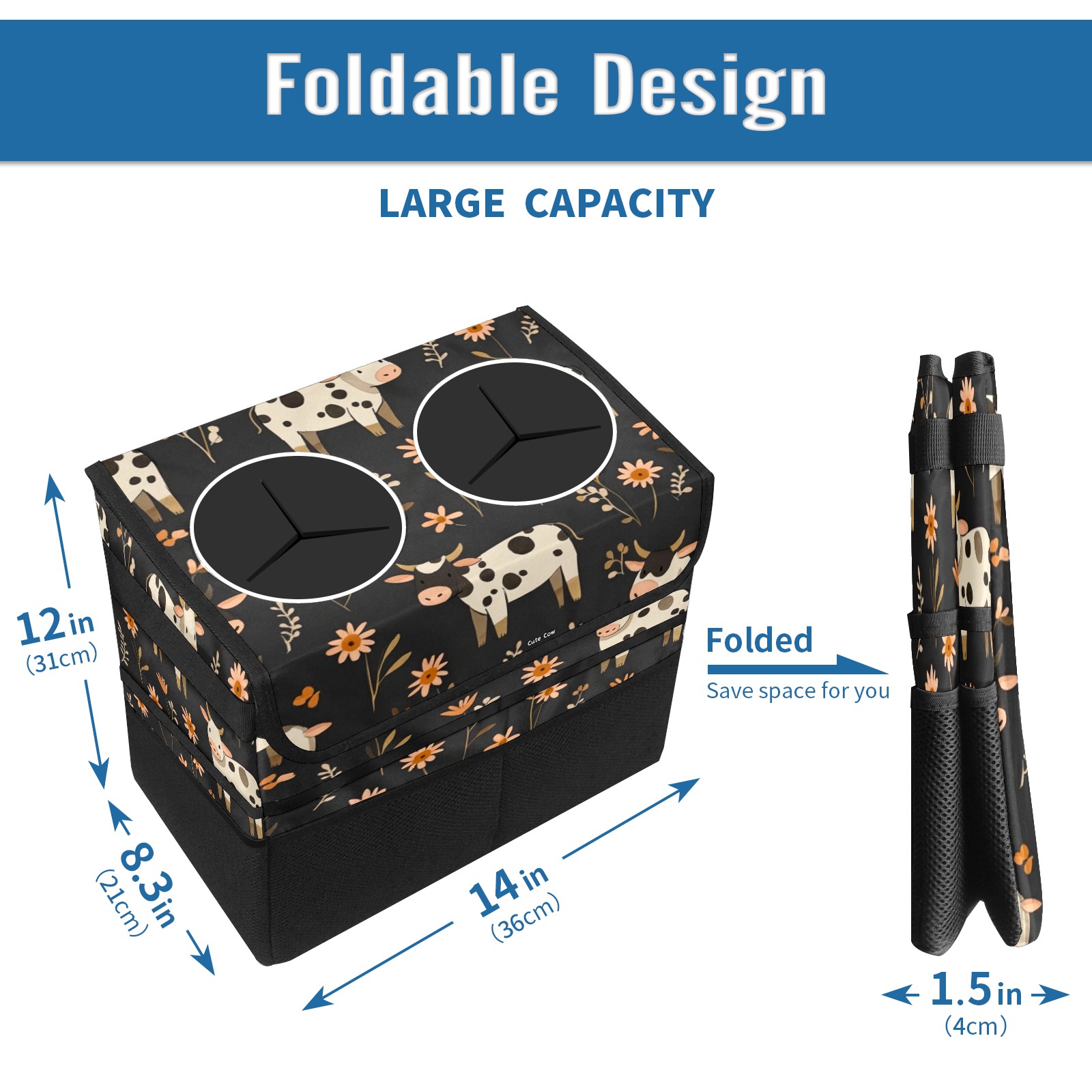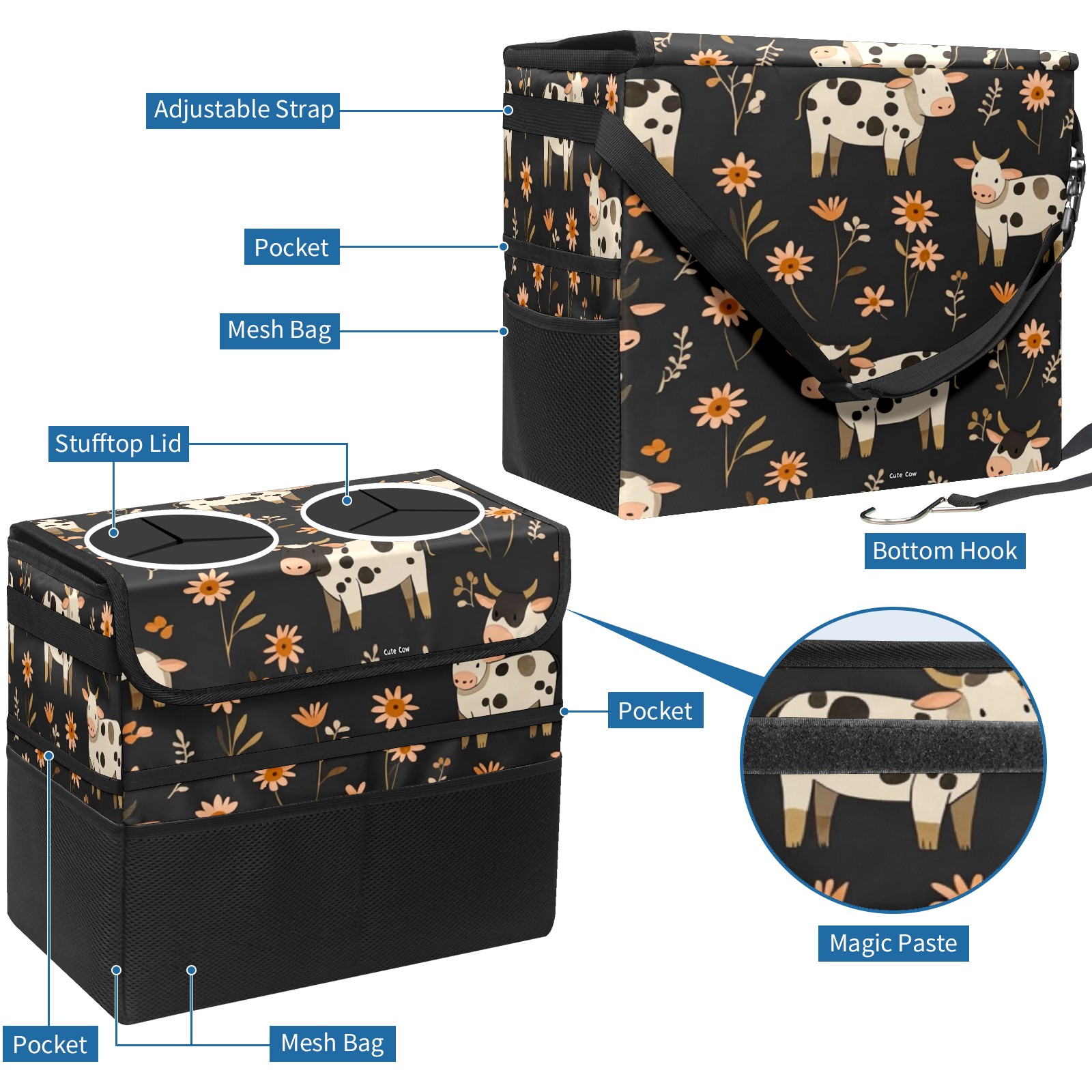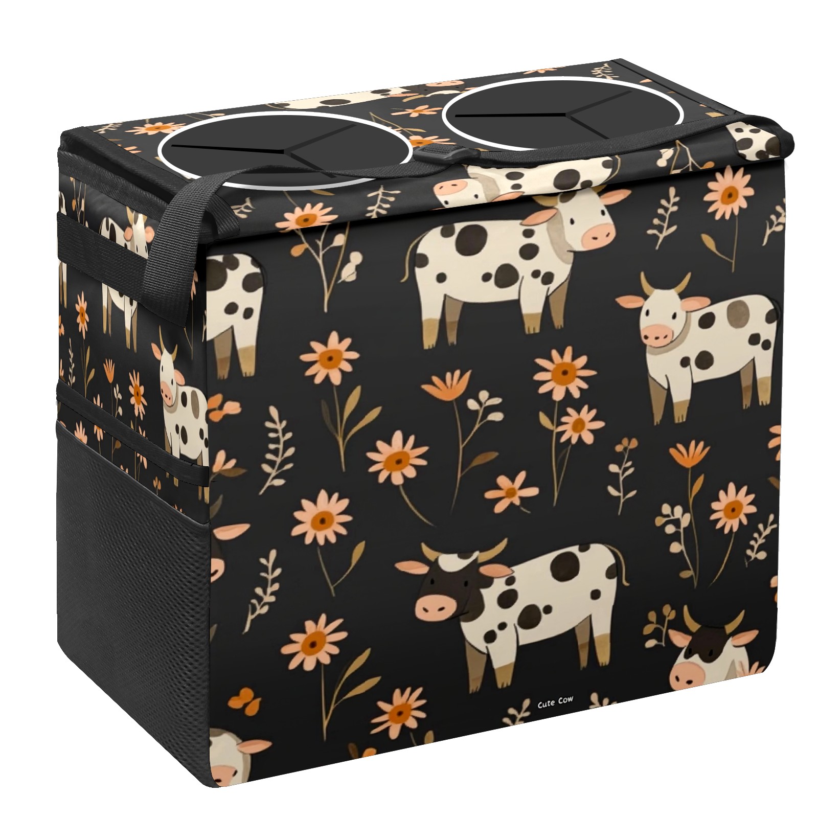 Car Trash Can with Lid, Portable Hanging Automotive Garbage Bin for Vehicles, Leakproof Waste Bag Container for SUV Truck Van Interior Auto Travel Road Trips(Cows And Flowers)