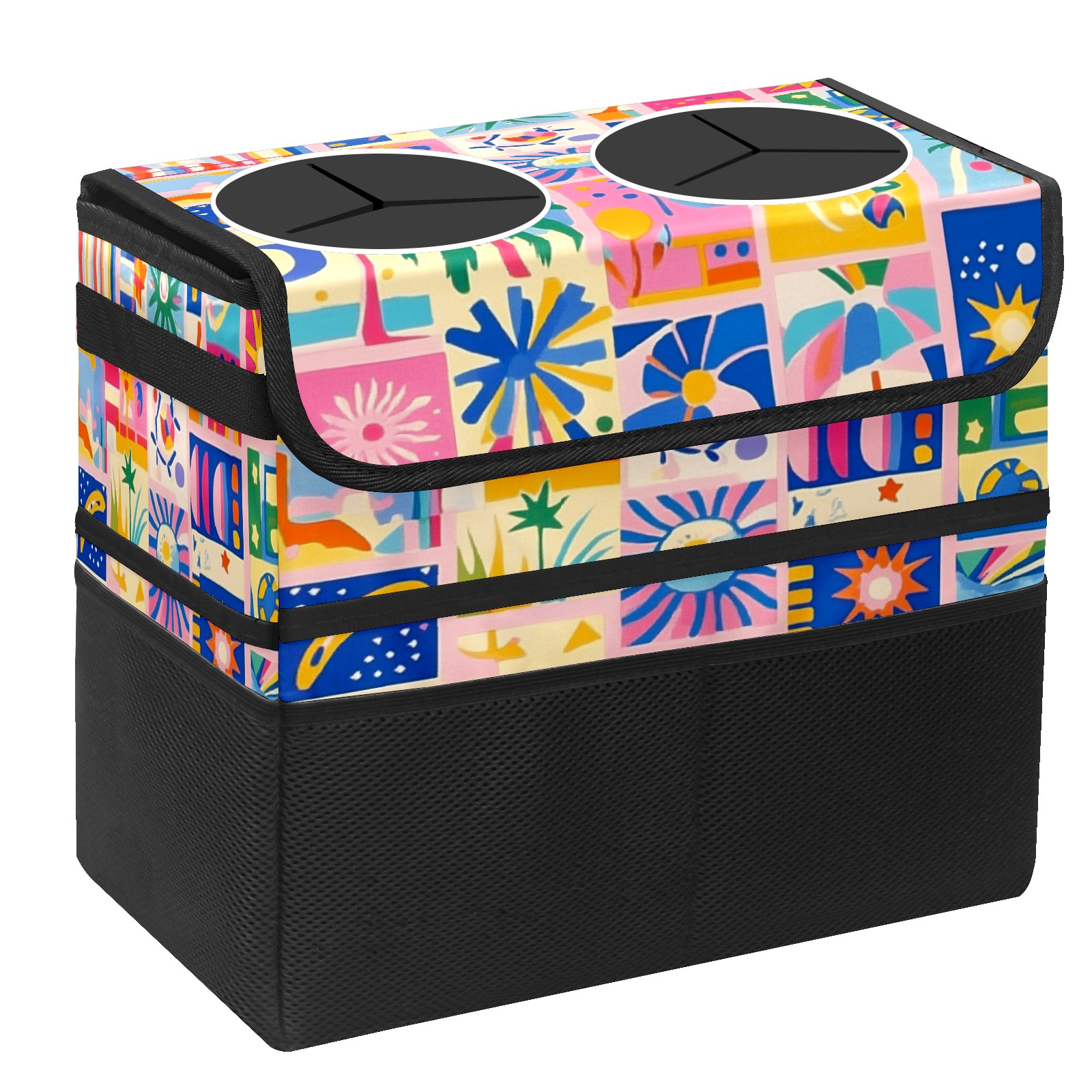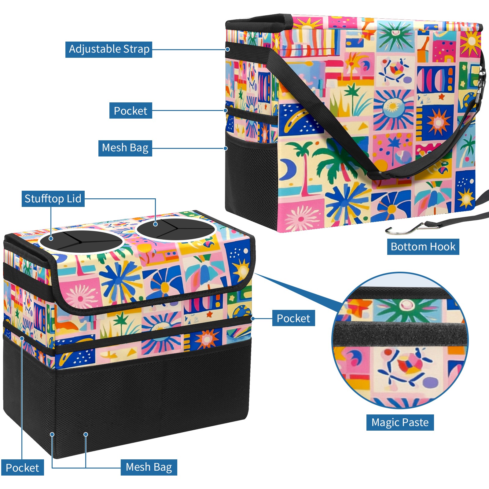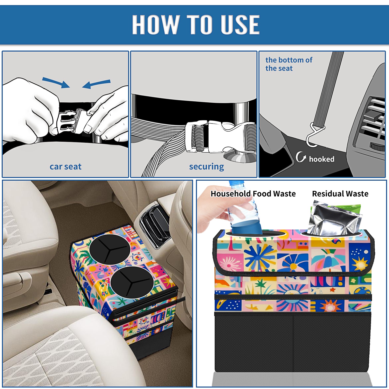 Car Trash Can with Lid, Portable Hanging Automotive Garbage Bin for Vehicles, Leakproof Waste Bag Container for SUV Truck Van Interior Auto Travel Road Trips(Vibrant Pattern)