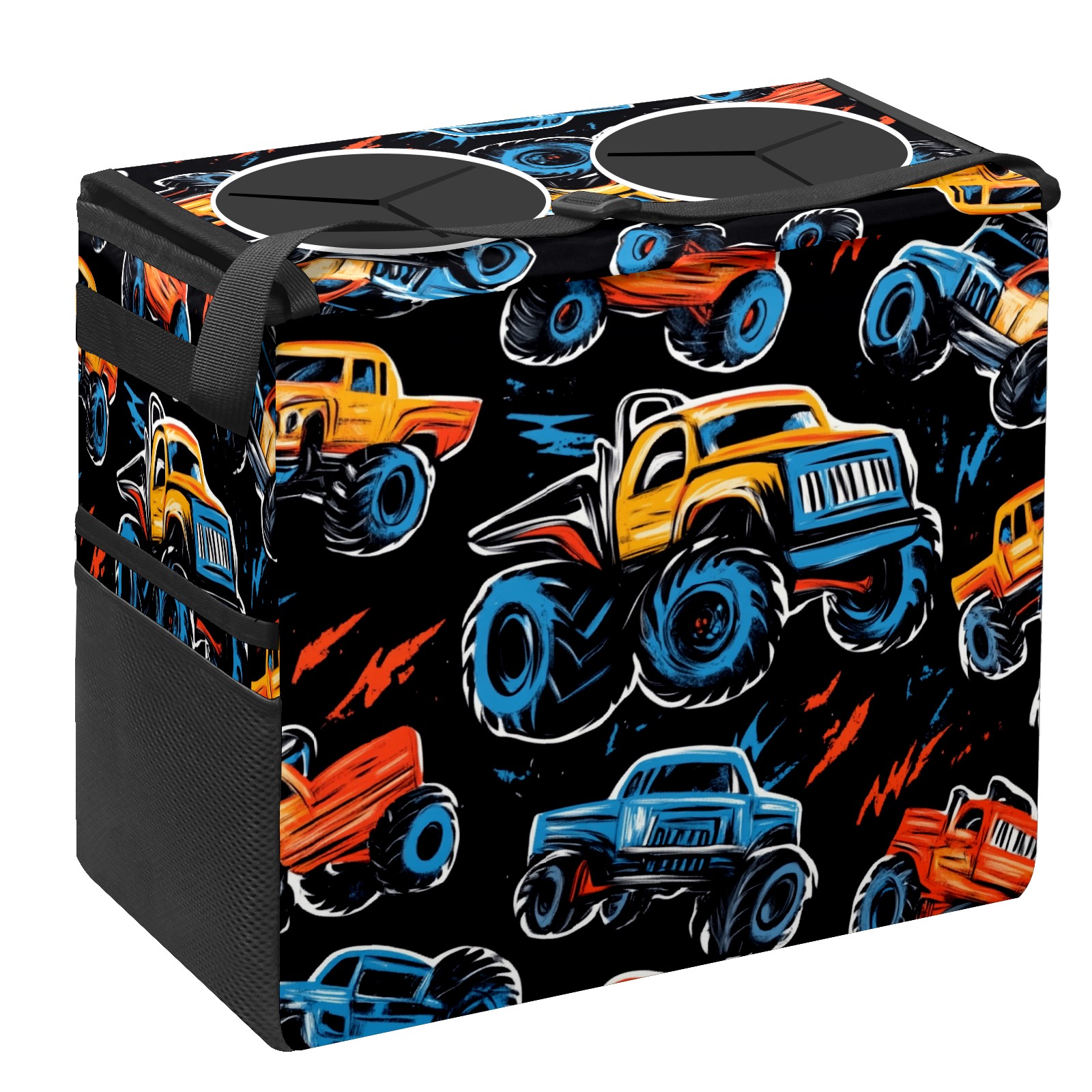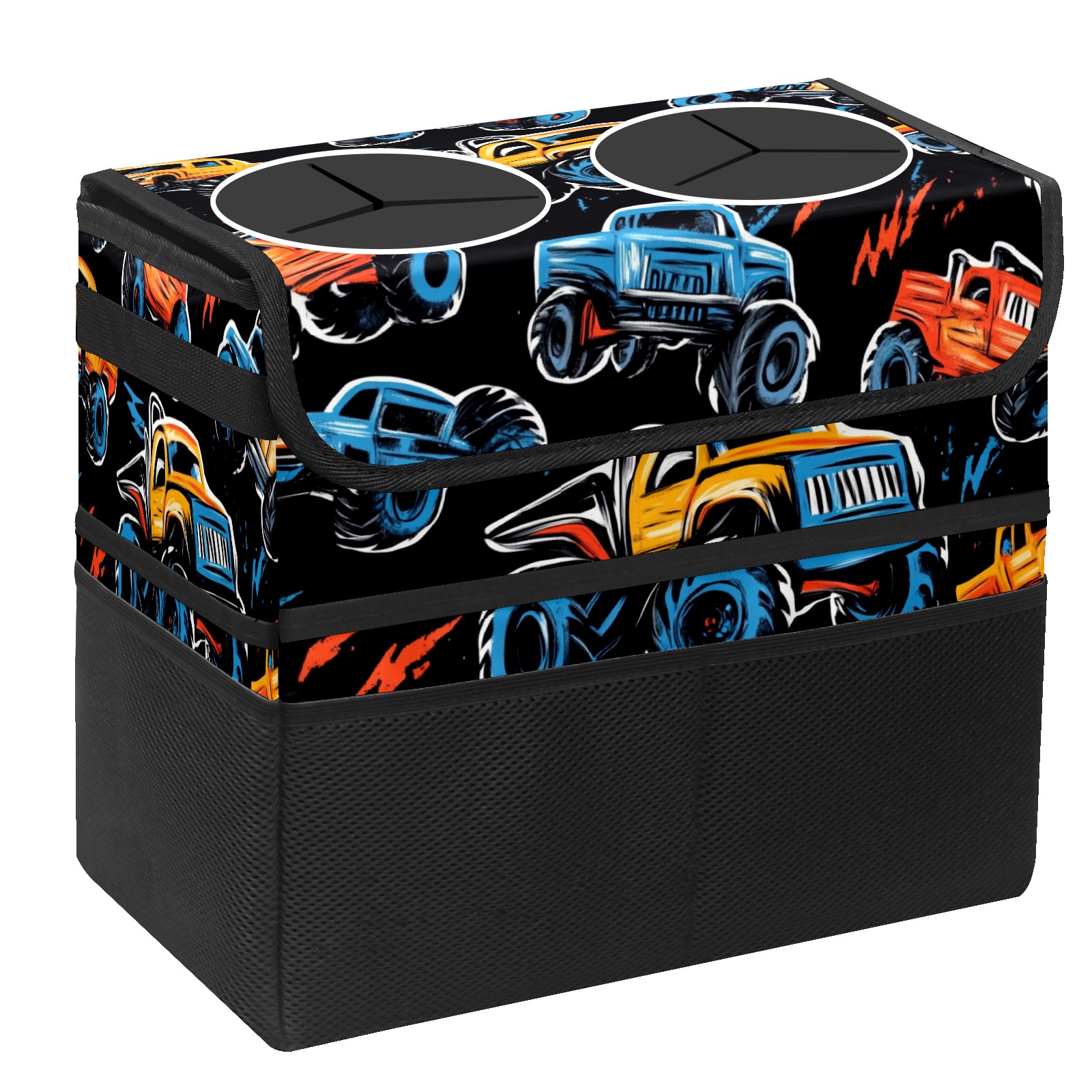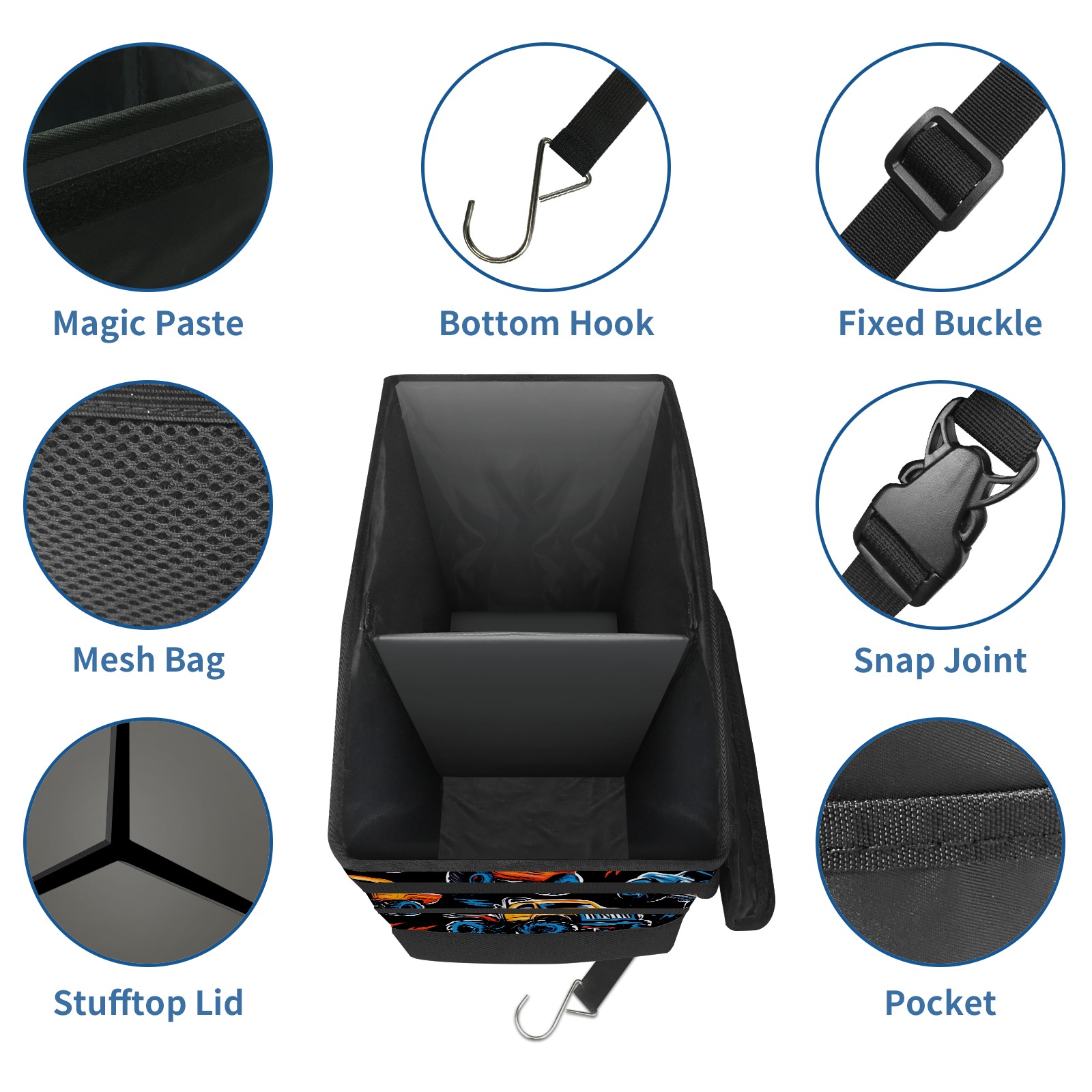 Car Trash Can with Lid, Portable Hanging Automotive Garbage Bin for Vehicles, Leakproof Waste Bag Container for SUV Truck Van Interior Auto Travel Road Trips(Monster Trucks)