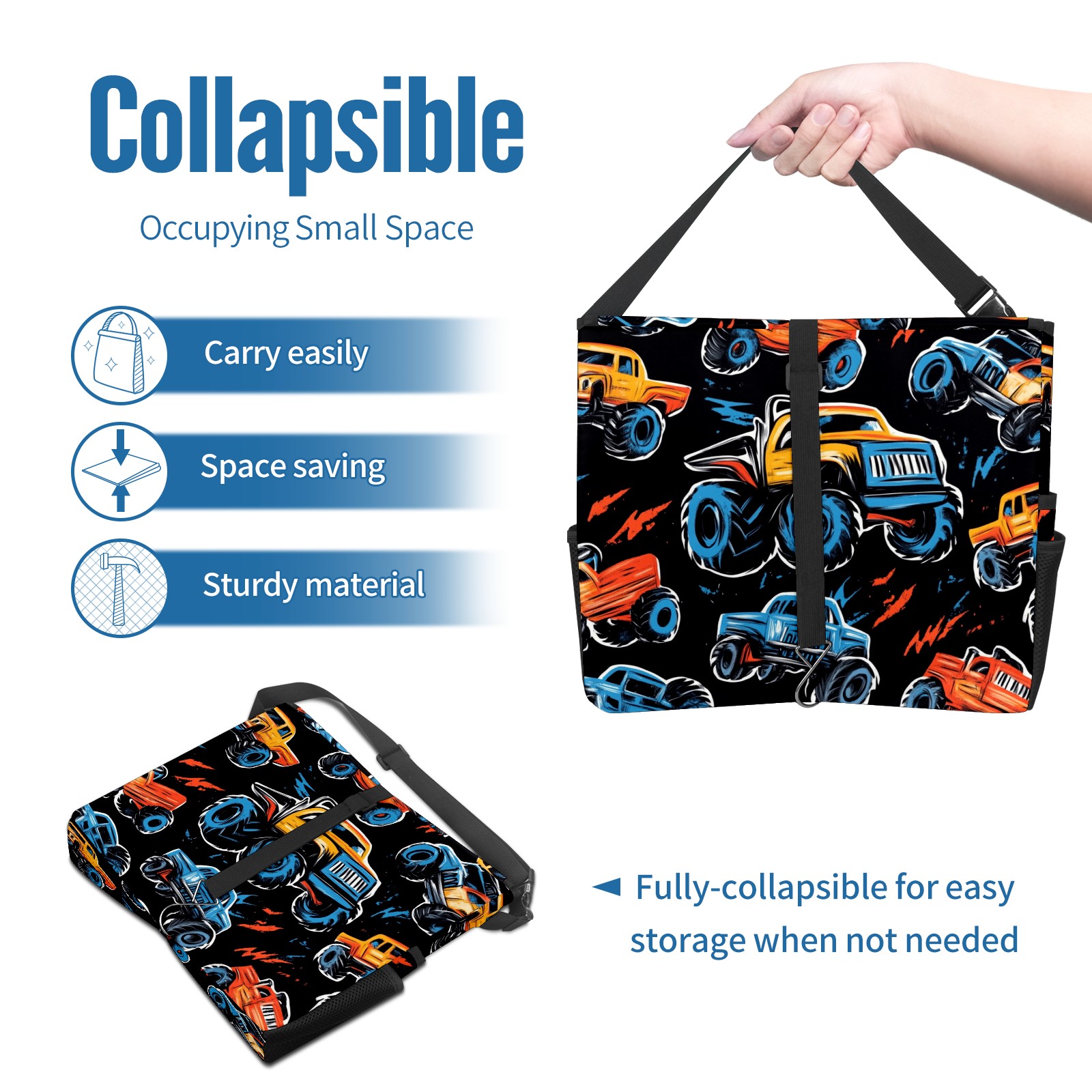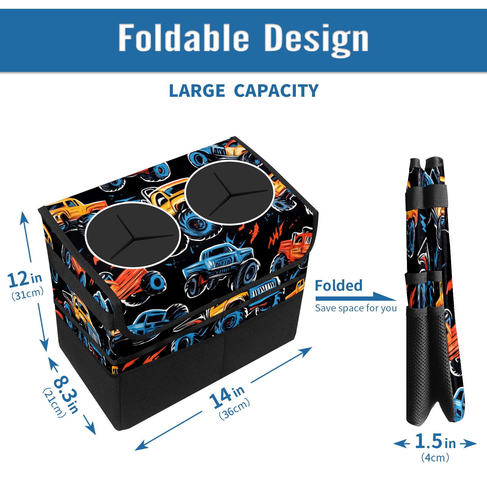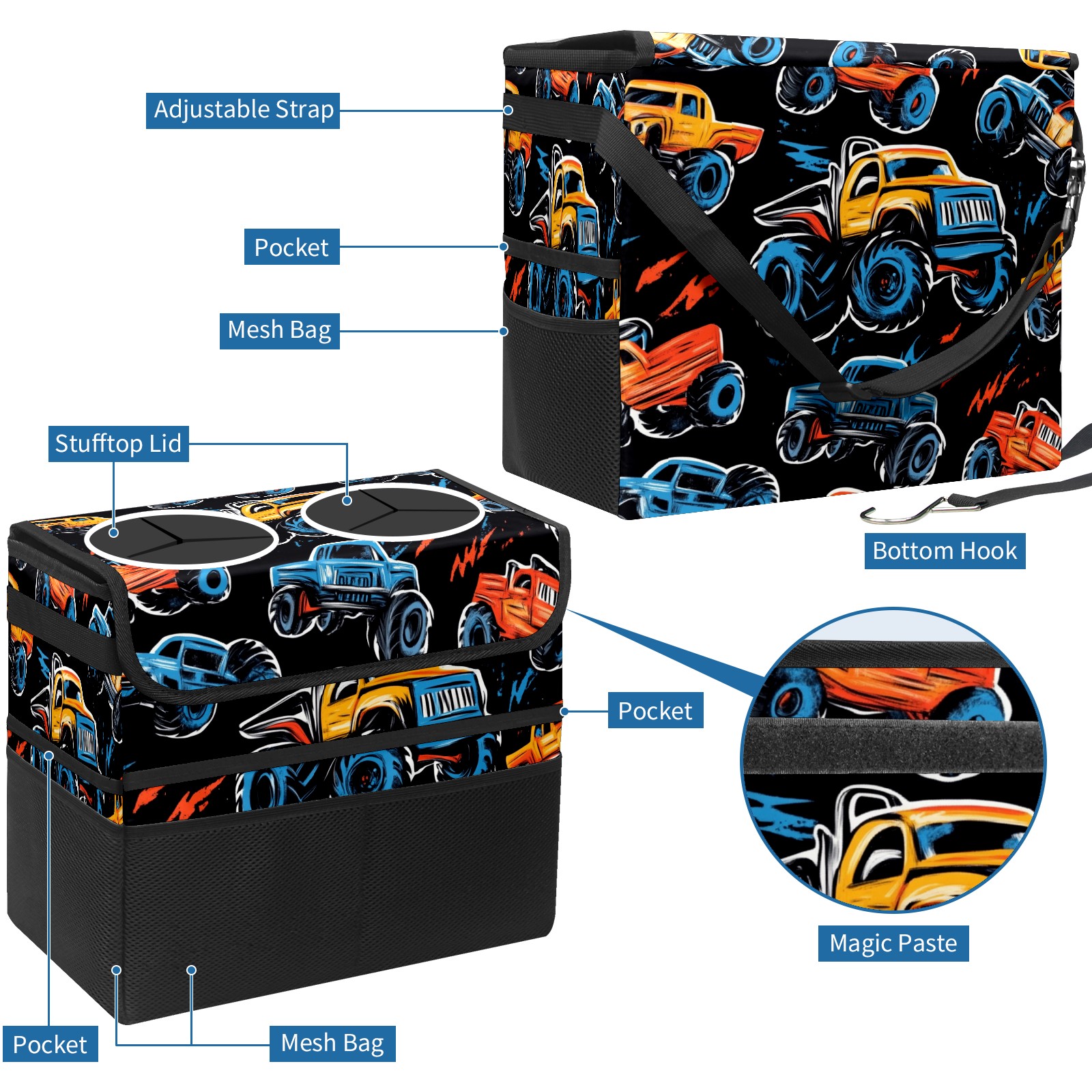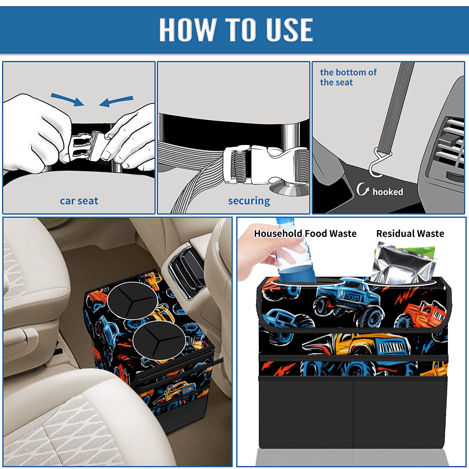 Car Trash Can with Lid, Portable Hanging Automotive Garbage Bin for Vehicles, Leakproof Waste Bag Container for SUV Truck Van Interior Auto Travel Road Trips(Monster Trucks)