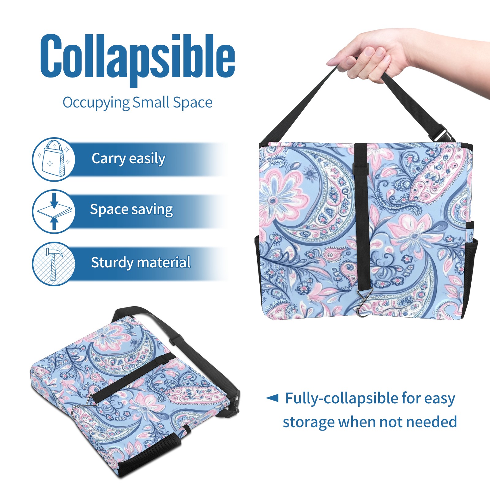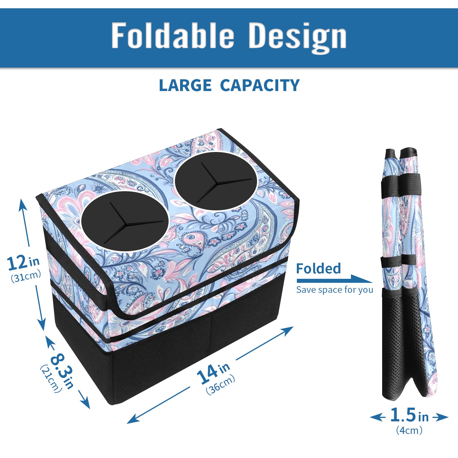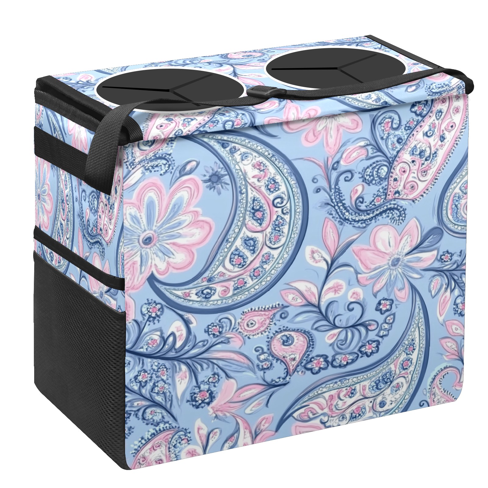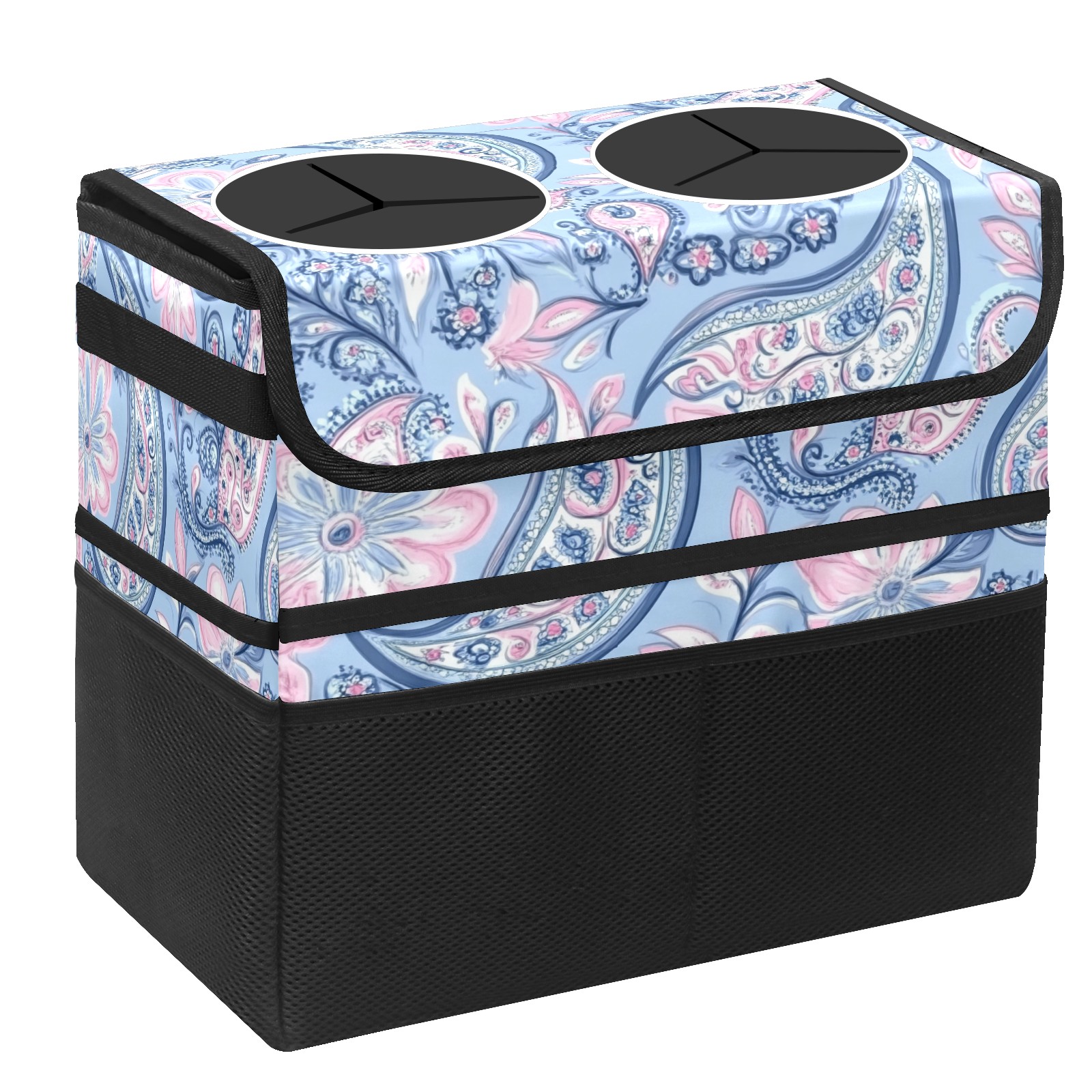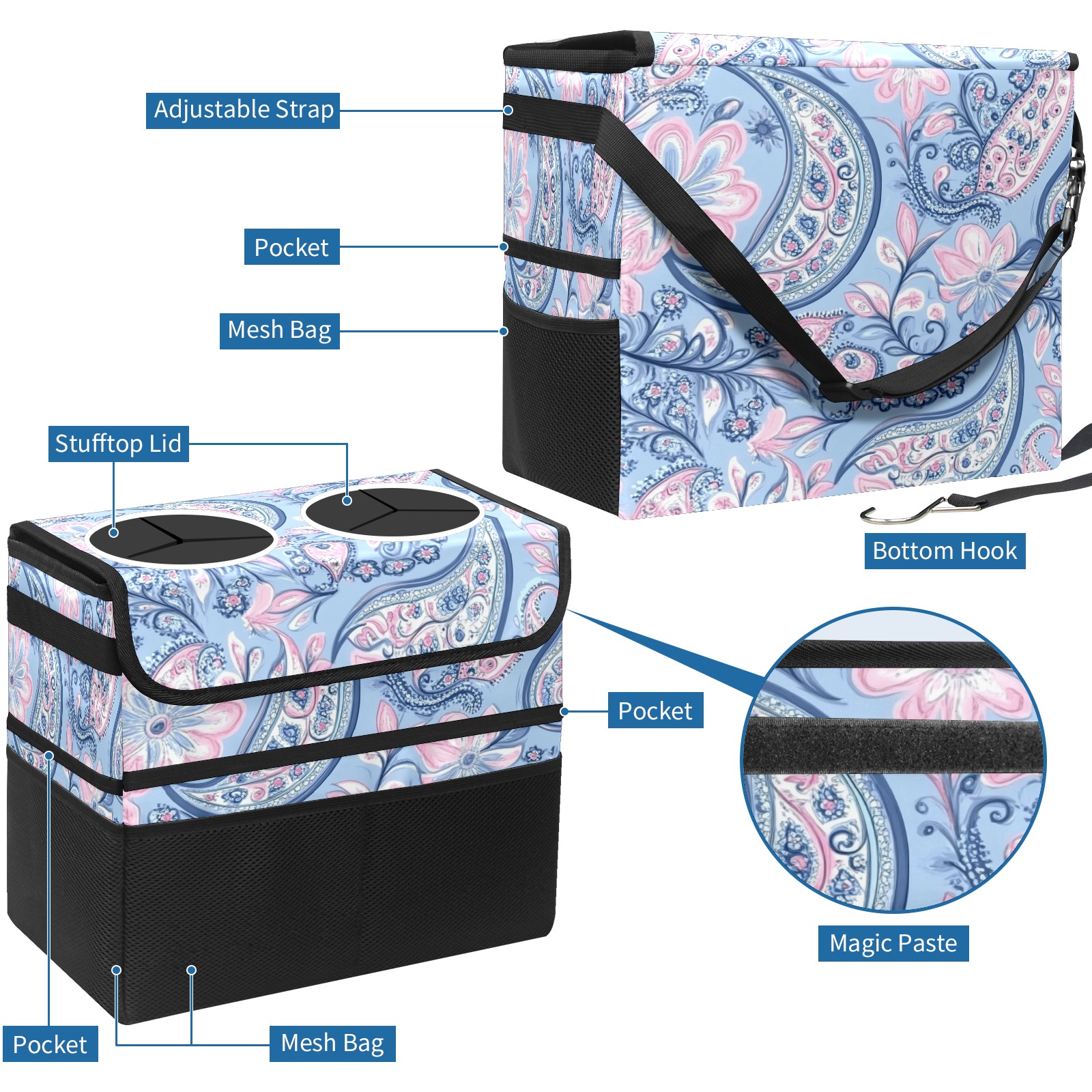 Car Trash Can with Lid, Portable Hanging Automotive Garbage Bin for Vehicles, Leakproof Waste Bag Container for SUV Truck Van Interior Auto Travel Road Trips(Blue Paisley)