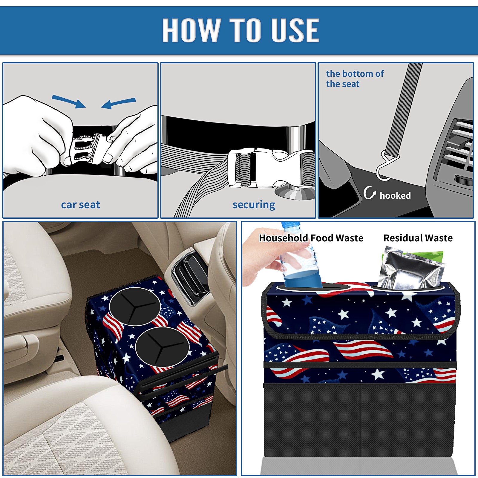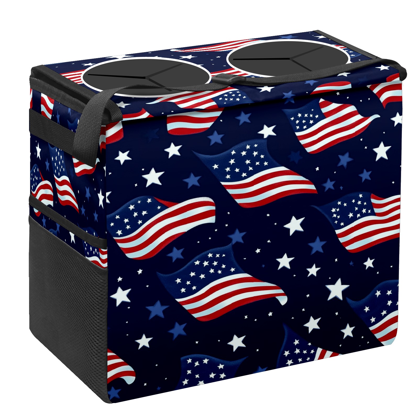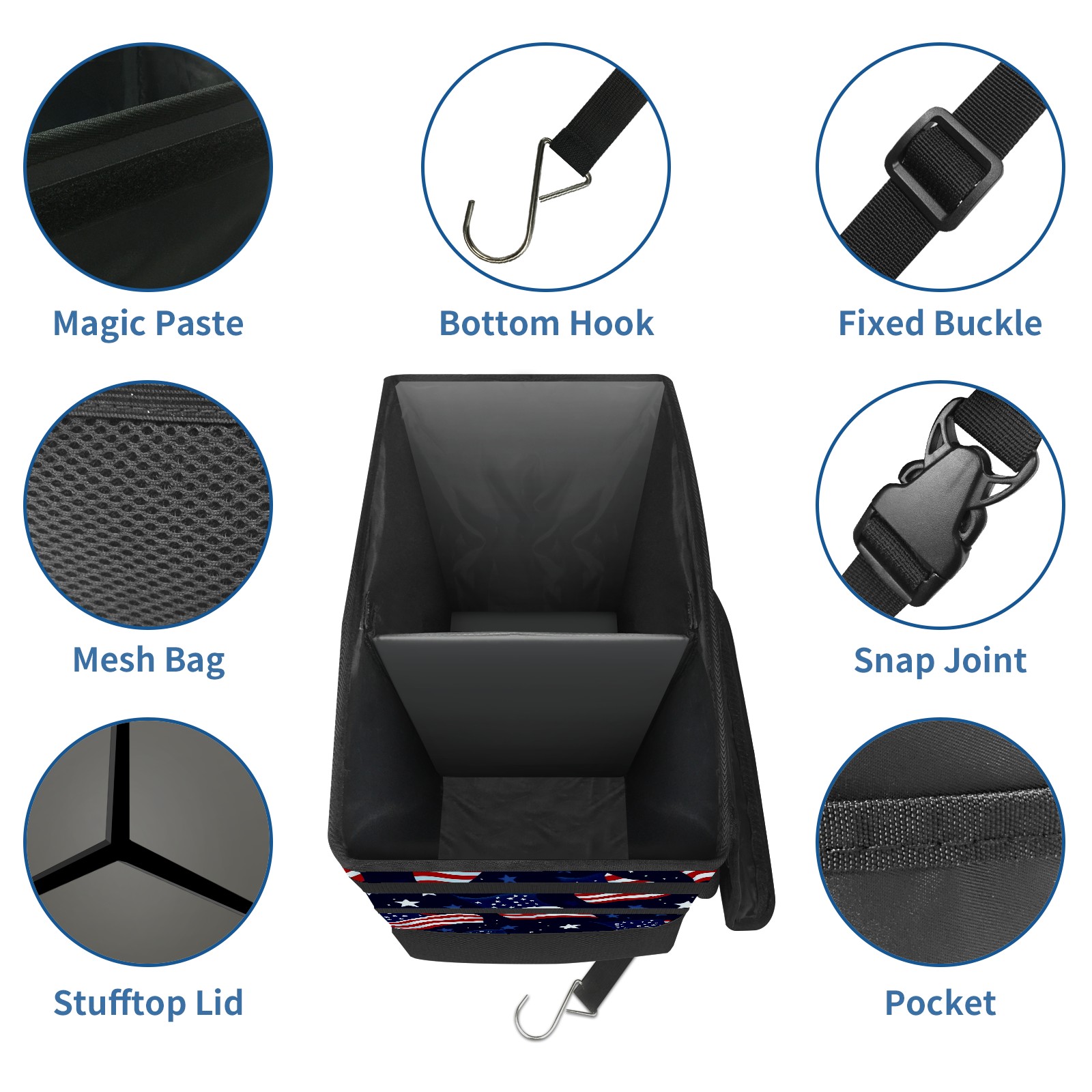 Car Trash Can with Lid, Portable Hanging Automotive Garbage Bin for Vehicles, Leakproof Waste Bag Container for SUV Truck Van Interior Auto Travel Road Trips(Realistic Waving American Flags)