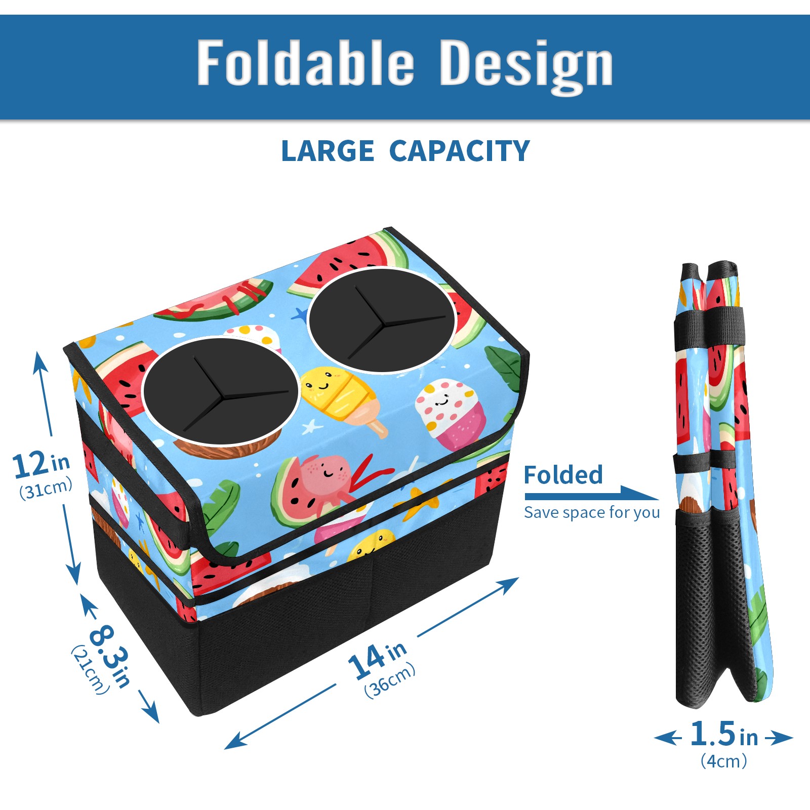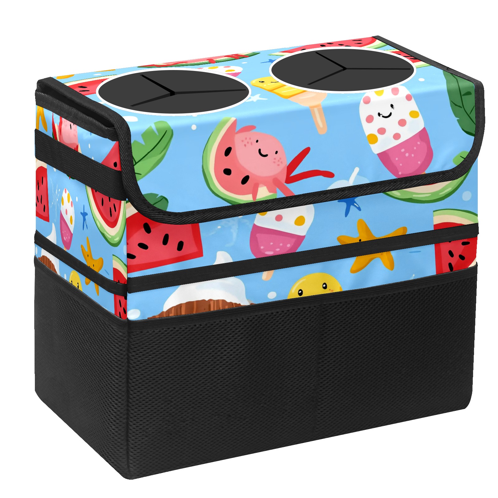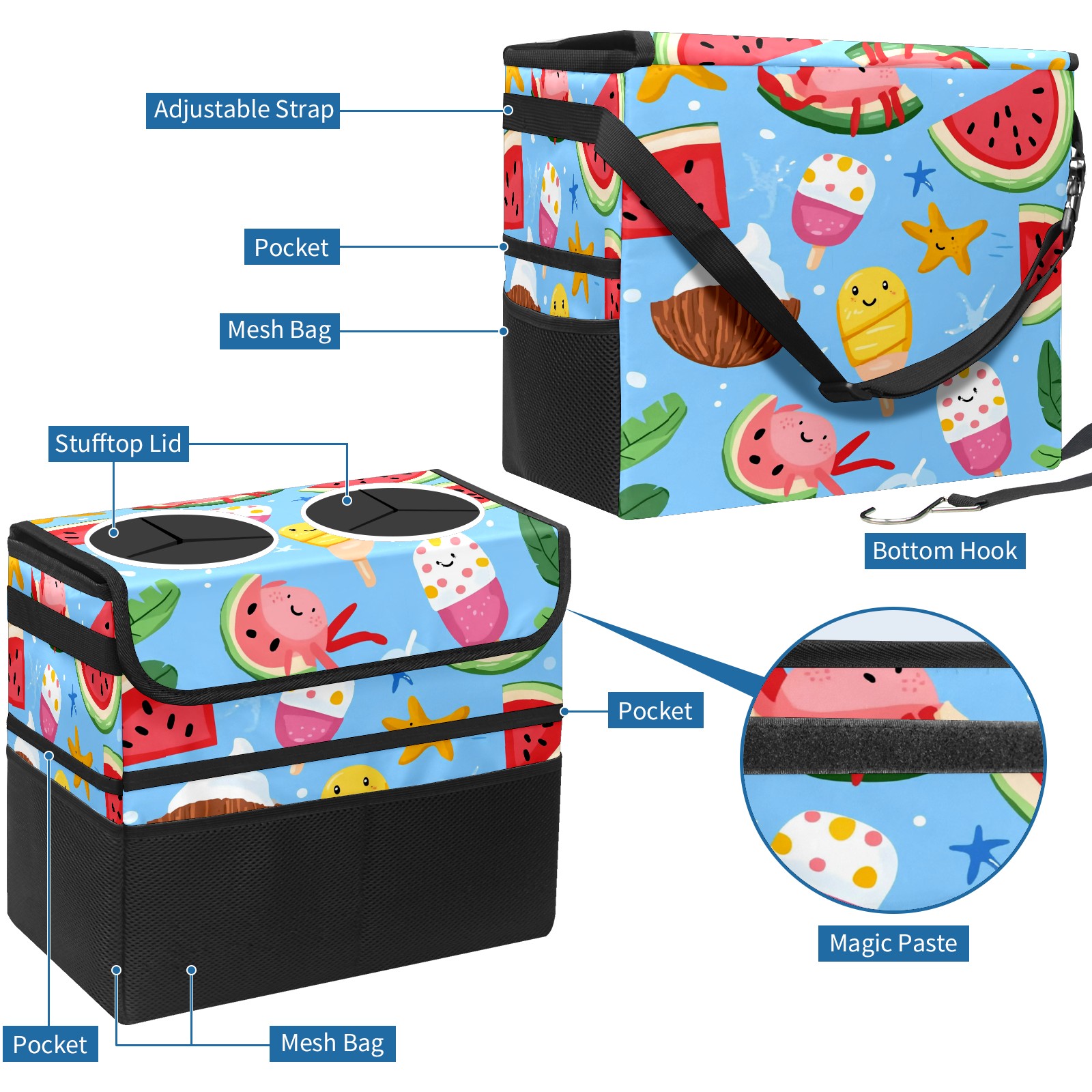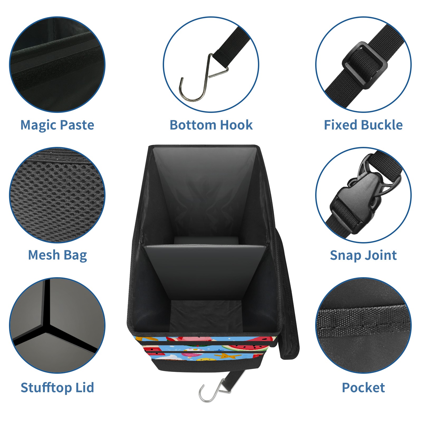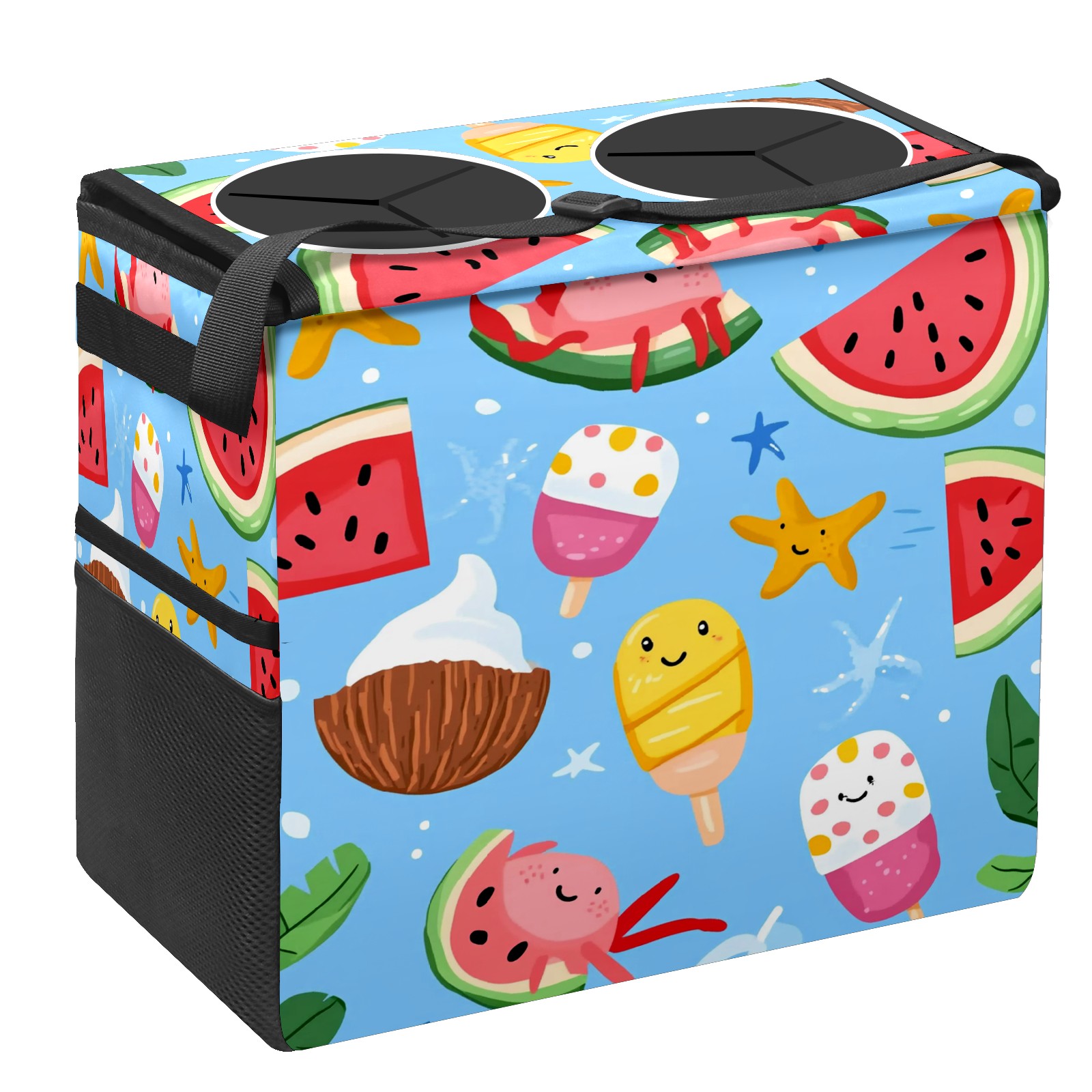 Car Trash Can with Lid, Portable Hanging Automotive Garbage Bin for Vehicles, Leakproof Waste Bag Container for SUV Truck Van Interior Auto Travel Road Trips(Ice Cream And Watermelon)