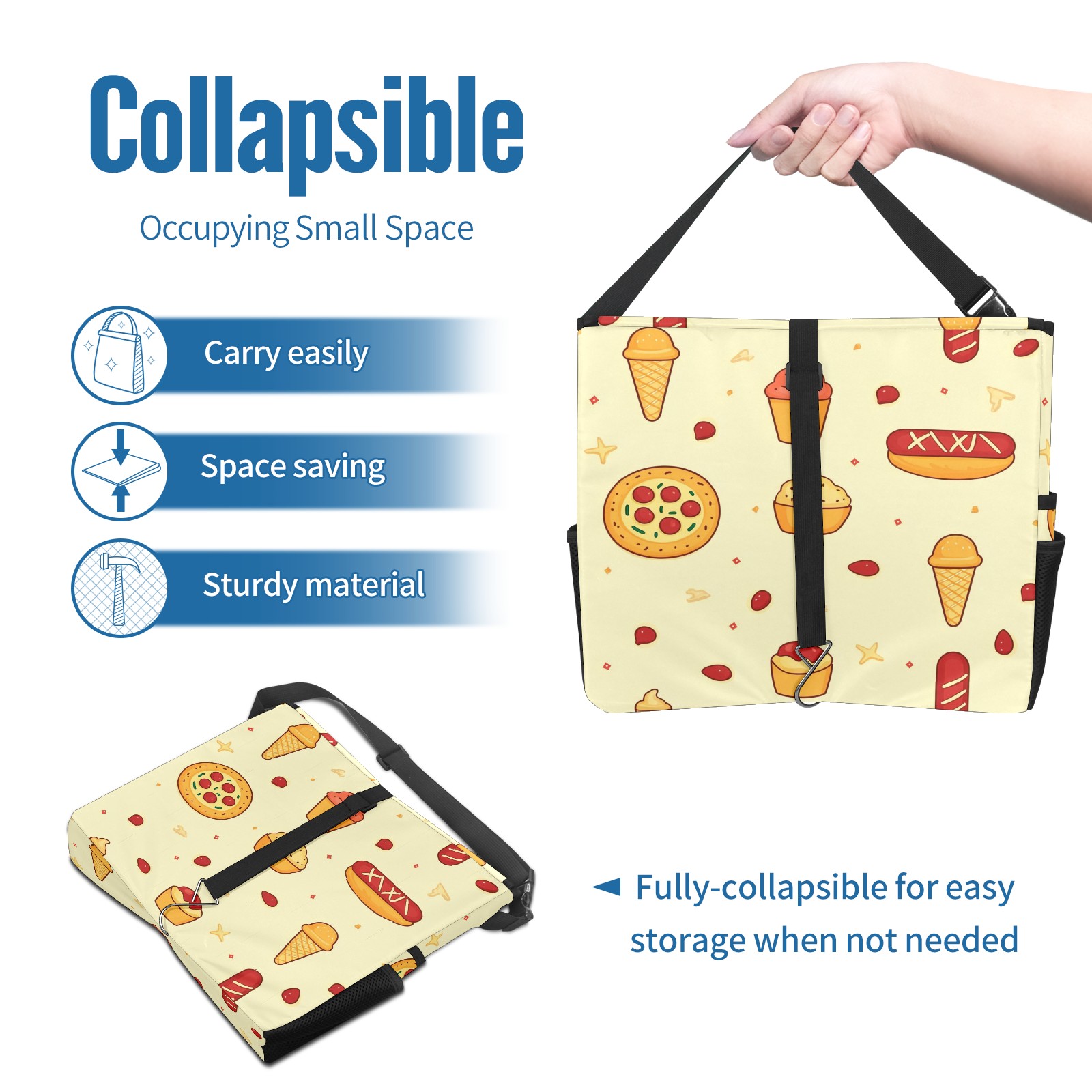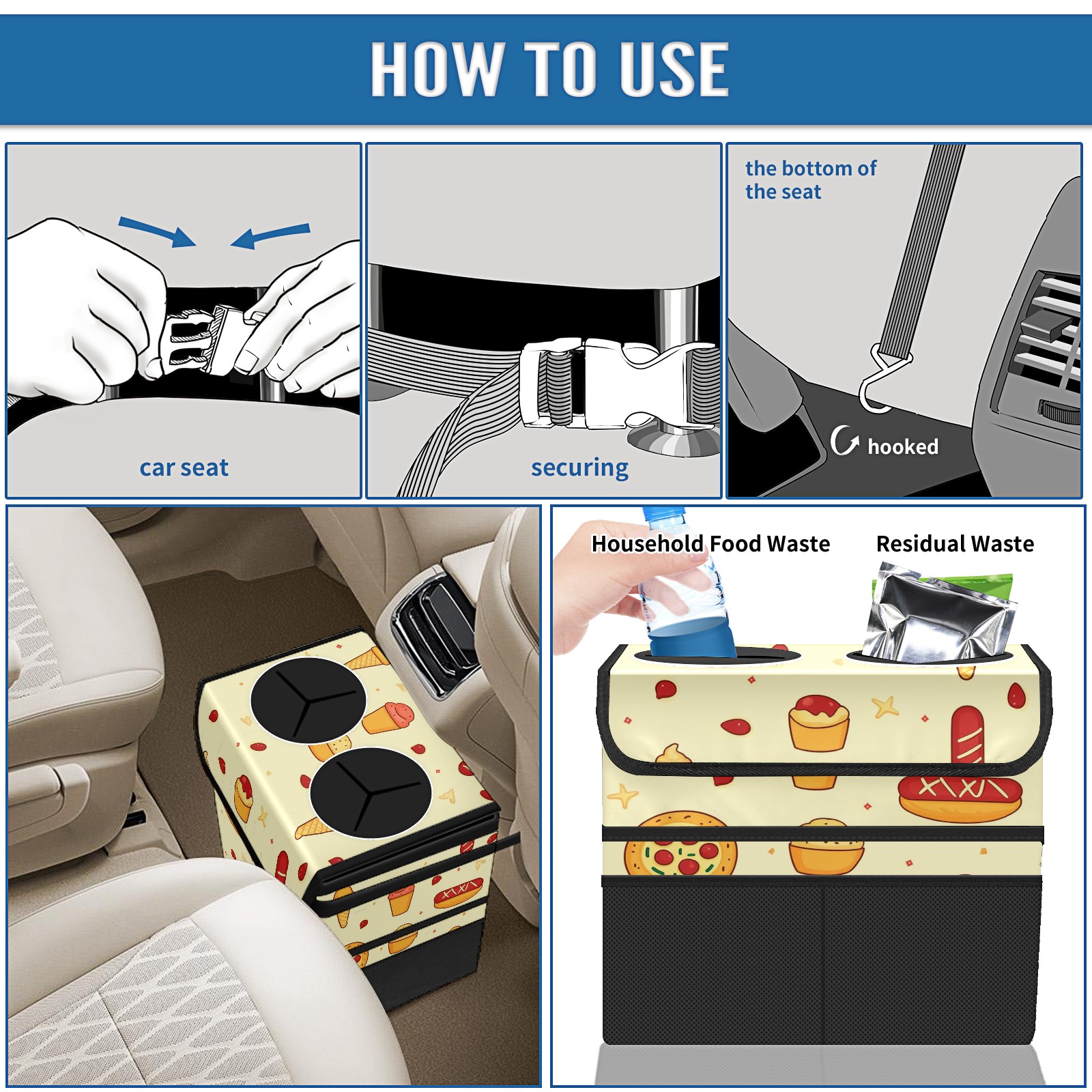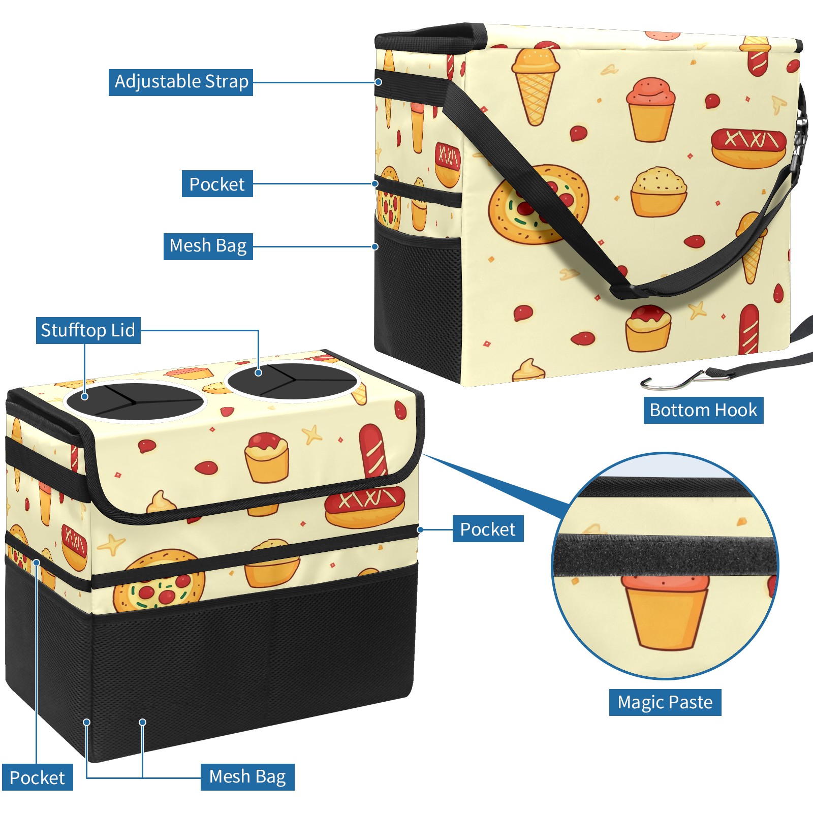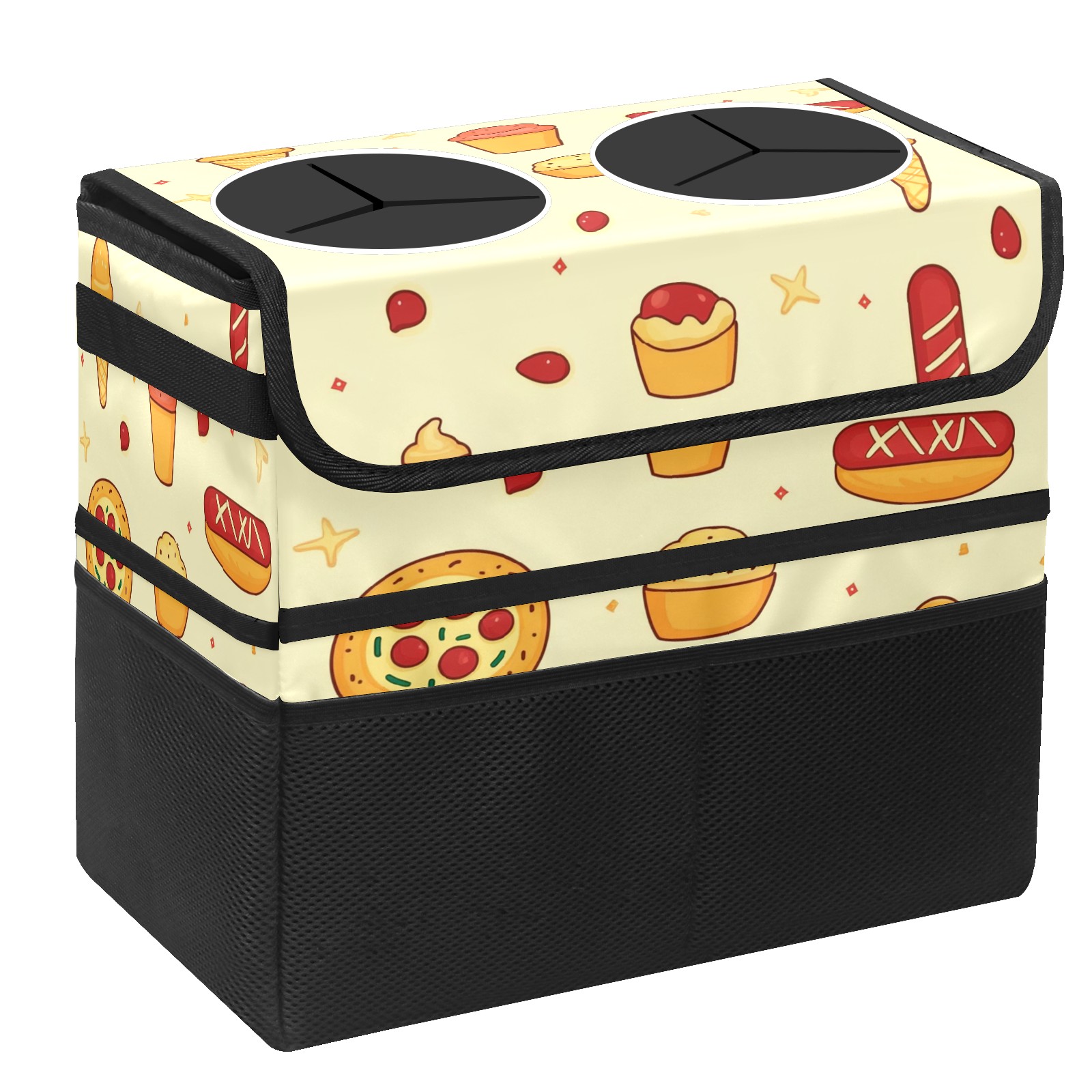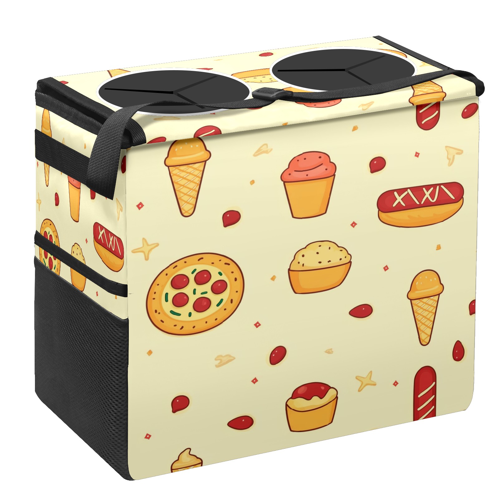 Car Trash Can with Lid, Portable Hanging Automotive Garbage Bin for Vehicles, Leakproof Waste Bag Container for SUV Truck Van Interior Auto Travel Road Trips(Pizza And Hot Dog)