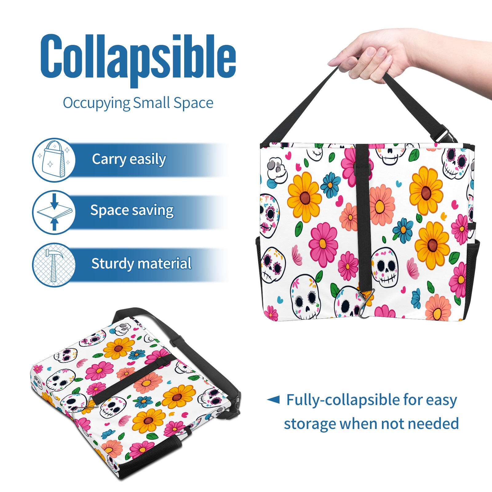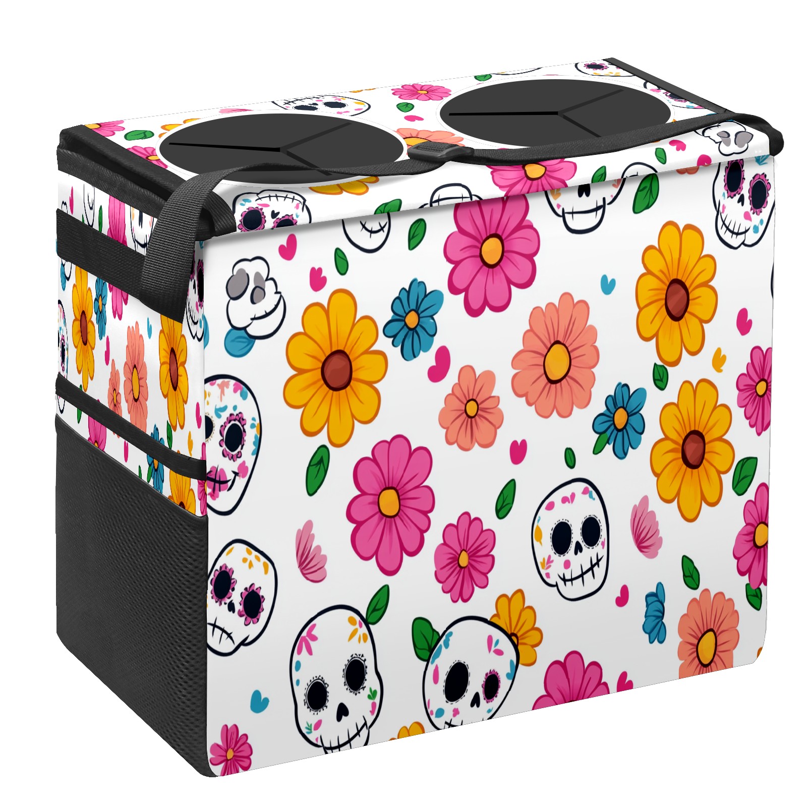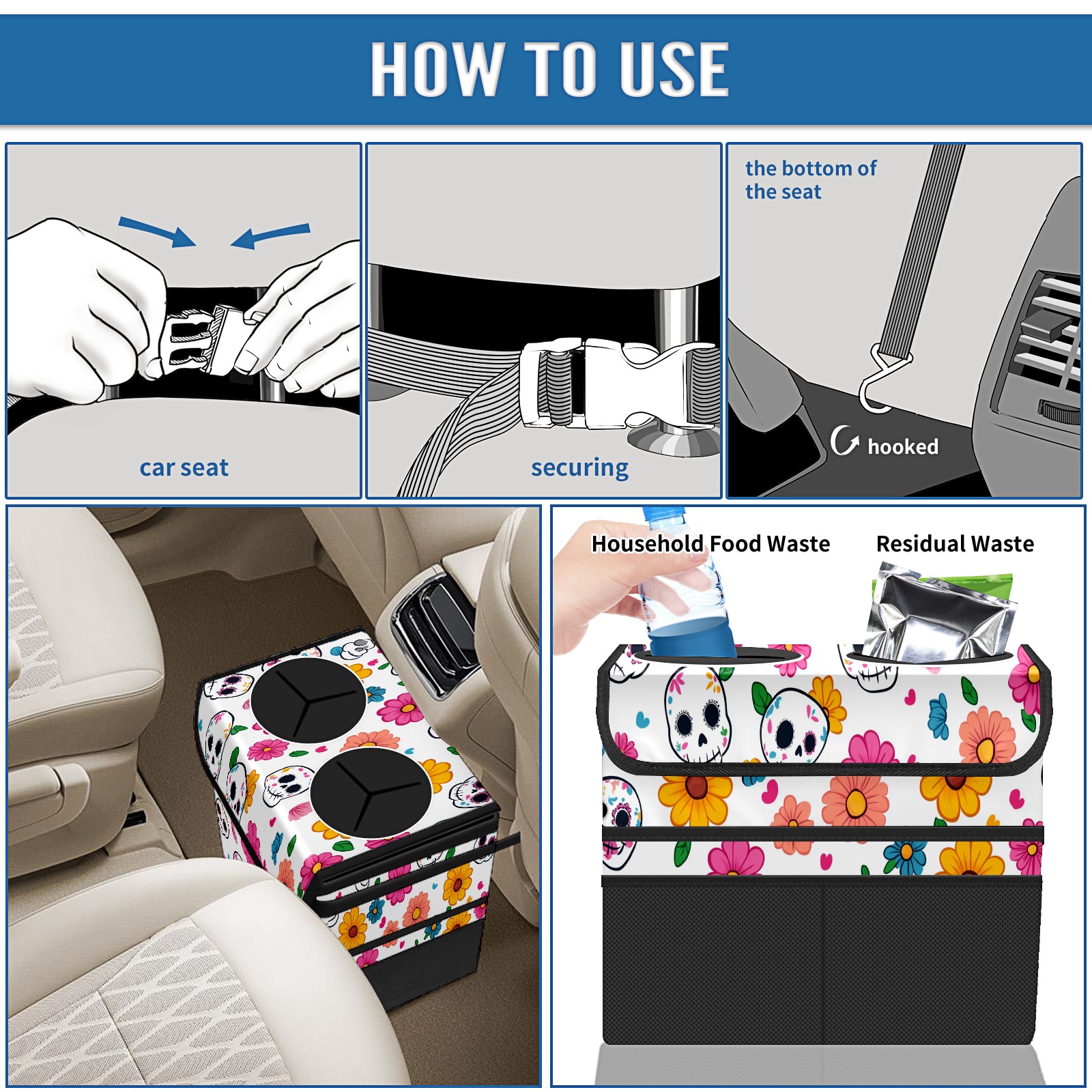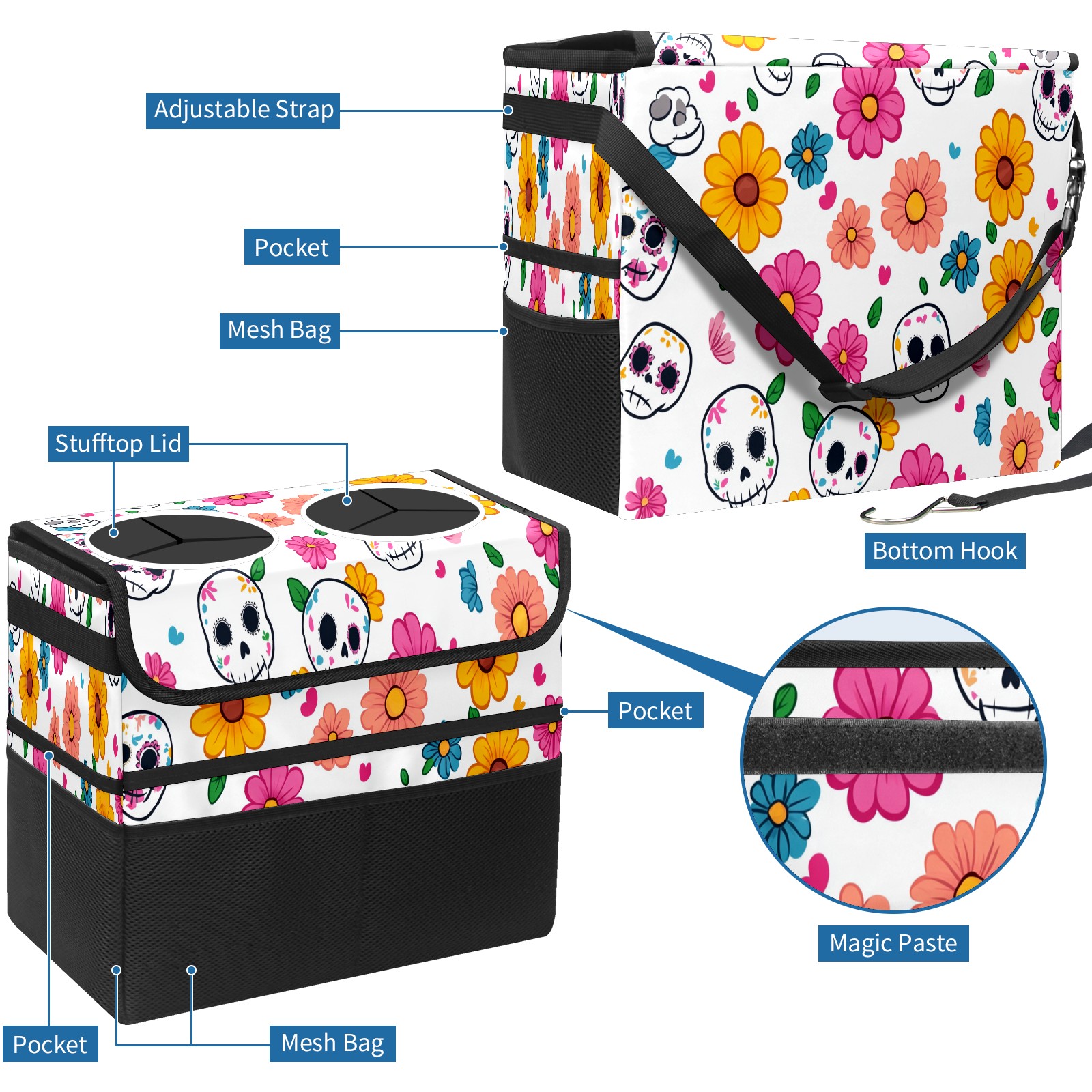 Car Trash Can with Lid, Portable Hanging Automotive Garbage Bin for Vehicles, Leakproof Waste Bag Container for SUV Truck Van Interior Auto Travel Road Trips(Sugar Skulls)