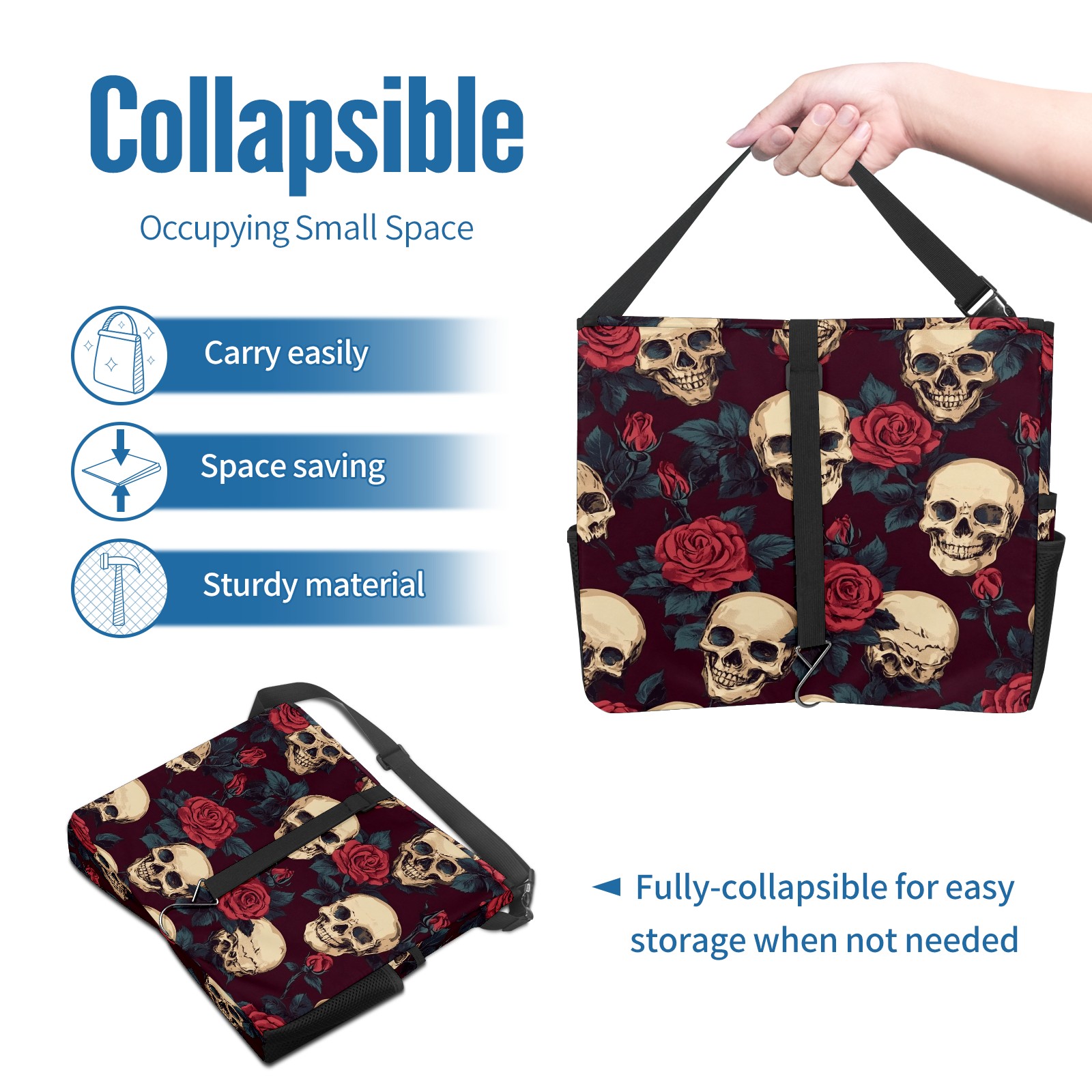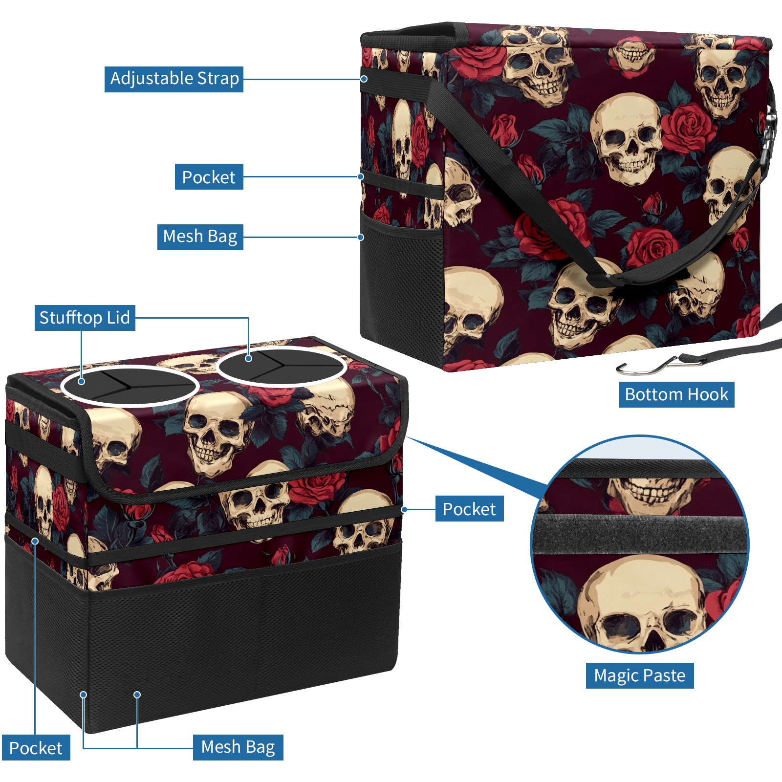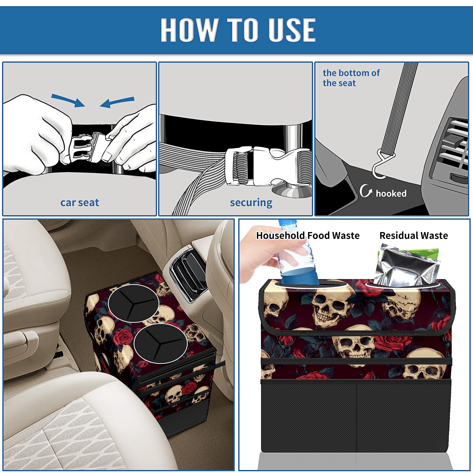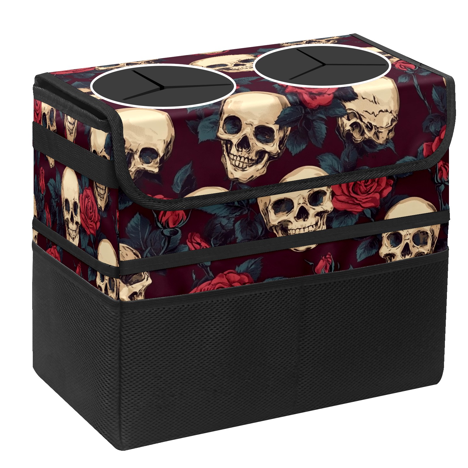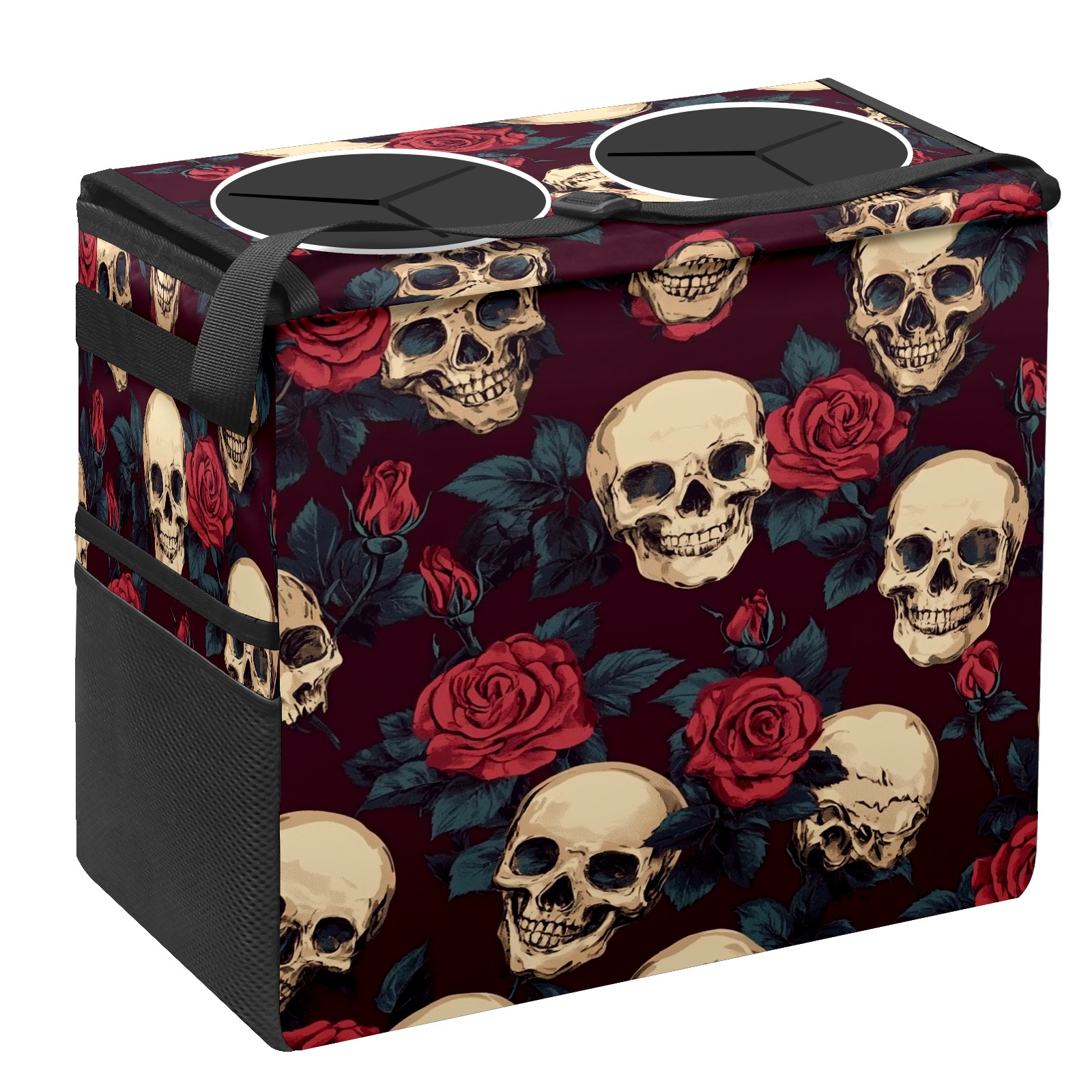 Car Trash Can with Lid, Portable Hanging Automotive Garbage Bin for Vehicles, Leakproof Waste Bag Container for SUV Truck Van Interior Auto Travel Road Trips(Skulls And Roses)